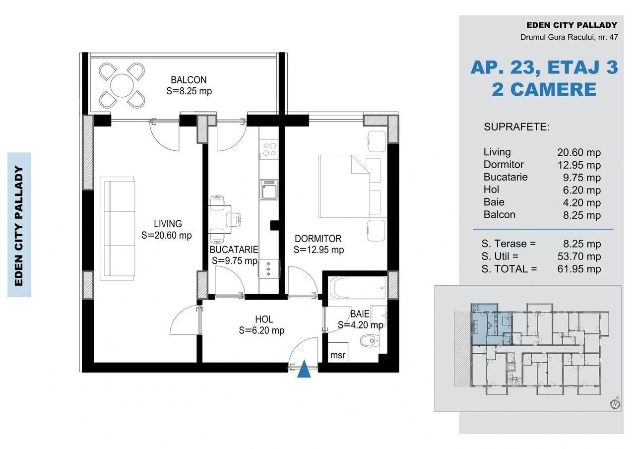 Descoperă un apartament modern de 2 camere, situat la etajul 3 al unui imobil nou, amplasat în zona Pallady - una dintre cele mai dinamice și bine conectate zone rezidențiale din București. Compartimentare Living: 20,60 mp cu acces pe balcon Dormitor: 12,95 mp Bucătărie separată: 9,75 mp Hol: 6,20 mp Baie: 4,20 mp Balcon: 8,25 mp Suprafață utilă: 53,70 mp Suprafață totală: 61,95 mp Beneficii Compartimentare eficientă și luminoasă Bucătărie separată și balcon generos Finisaje moderne și materiale premium Clădire nouă, eficiență energetică clasa A Posibilitate achiziție loc de parcare Localizare 15-18 minute de mers pe jos până la metrou Nicolae Teclu 12-16 minute de mers pe jos până la metrou Anghel Saligny Aproape de zona comercială Pallady (IKEA, Auchan, Metro, Lidl, Kaufland, Decathlon) și Parcul Teilor Un apartament ideal atât pentru locuit, cât și pentru investiție, într-o zonă aflată în plină dezvoltare. Andrei Badea -