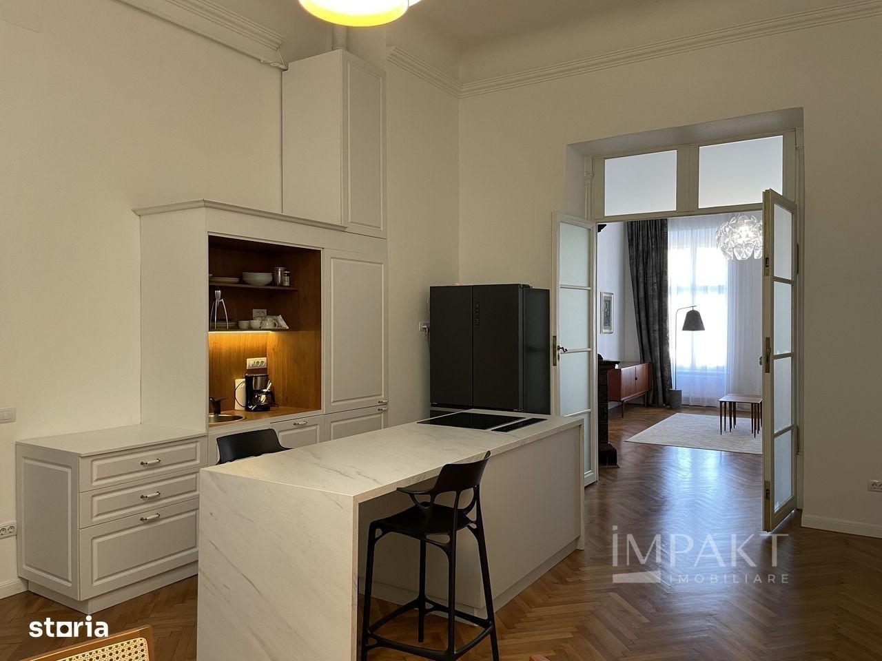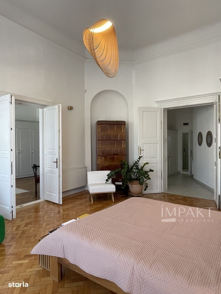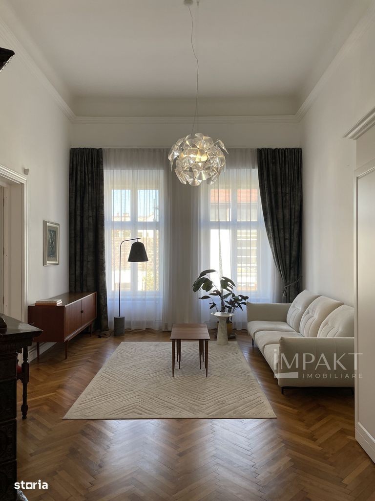 Bling imobiliare va ofera spre inchiriere un apartament cu 4 camere situat în Cluj-Napoca, pe strada Eroilor, în inima orașului. Apartamentul este o bijuterie arhitecturală, situată la etajul 1 (piano nobile) al Casei Mici Bánffy, un mic palat baroc, de la balconul căruia puteți urmări spectacolul urban al orașului. Dintre elementele sale spectaculoase, amintim balconul elegant, spațialitatea încăperilor de la stradă, cu o înălțime de 4,5 metri, tâmplăriile istorice valoroase cu feronerii originale, soba de factură neorenascentistă de sec. XIX, ușa monumentală dintre spațiul de bucătărie și zona de zi. Apartamentul a fost complet renovat recent, fiind refăcute instalațiile termice (centrală termică proprie, cu rezervor de acumulare, radiatoare pentru încălzire), electrice, sanitare, având montat inclusiv un sistem de supraveghere. Apartamentul este perfect pentru o locuință specială, un birou generos și reprezentativ sau un spațiu de showroom. Detalii compartimentare proprietate: - 1 cameră de zi; - 1 dormitor cu balcon spre strada Eroilor; - 1 bucătărie generoasă cu luminator amenajat în tavan care aduce lumină naturală într-o încăpere fără acces la fațadă; - 1 dormitor; - 3 băi amenajate; - 3 holuri. Pentru mai multe detalii sau pentru vizionare, va rog sa ne contactati! ID Extern: P11450