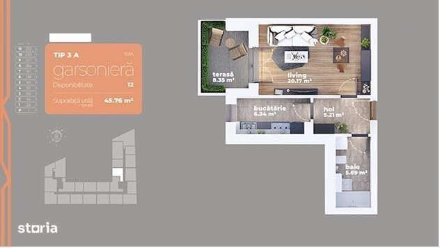 Habitat Group Imobiliare va prezinta o garsoniera decomandata spatioasa avand o suprafata totala utila de 45,76 mp la pretul promotional de 89.056 TVA inclus pentru plata unui avans de 95 % la antecontract. sau 91.839 Eur TVA inclus pentru 55% avans la antecontract sau 94.622 Eur TVA inclus pentru un avans de 15% la antecontract. Apartamentele din acest ansamblu rezidential sunt in stadiu foarte avansat de FINALIZARE. În noul imobil P+11 etaje veți descoperi 275 apartamente de apartamente, împreună cu un parter înverzit, toate proiectate cu atenție pentru a maximiza lumina naturală în fiecare colț. Garsoniera situata la etajul 8 al unui bloc cu 11 niveluri, cu o compartimentare ideala pentru familia dumneavoastra, suprafata utila totala de 45,76 Din paletarul dezvoltatorului, la un buget generos va punem la dispozitie finisaje de calitate la alegerea Dvs. Compartimentarea ideala pentru familia dumneavoastra: - Living : 20,17 mp - Bucatarie : 6,34 mp - Baie: 5,69 mp - Hol : 5,21 mp - Terasa : 8,35 mp Garsoniera se preda echipata si utilata cu gresie, faianta, parchet, usi interior si cea de exterior securizata, centrala termica individuala pe gaz in condensatie + calorifere de otel, baile echipate si utilate. Garsoniera va fi predata la cheie bransata la toate utilitatile Enel, Engie si Apanova. Amplasat la o distanta de 14 minute fata de statia de metrou 1 Decembrie 1918, in apropriere de supermarketuri AUCHAN TITAN, Mega Image, Lidl, Profi, gradinite, scoli, farmacii, spitale, spatii verzi si de agrement, confera confortul mult dorit pentru familia dumneavoastra. Oferim asistenta in vederea intocmirii dosarului de creditare. Comision 0%. Locurile de parcare sunt vândute separat la un cost de 12.000 Euro fara TVA dar oferta continuă să surprindă: pentru fiecare loc de parcare achiziționat împreună cu apartamentul, vă oferim o reducere suplimentară de 3.000 Euro pentru locul de parcare. Poze de prezentare din acest ansamblu rezidential. Locatie birou vanzari dezvoltator : strada Postasului nr.29, Sector 3 Waze: Habitat Group Estate Program vizionari: Luni - Vineri : 10:00 - 18:00 si Sambata : 10:00 - 14:00 Recomand vizionarea Bogdan Mavrogheorghe