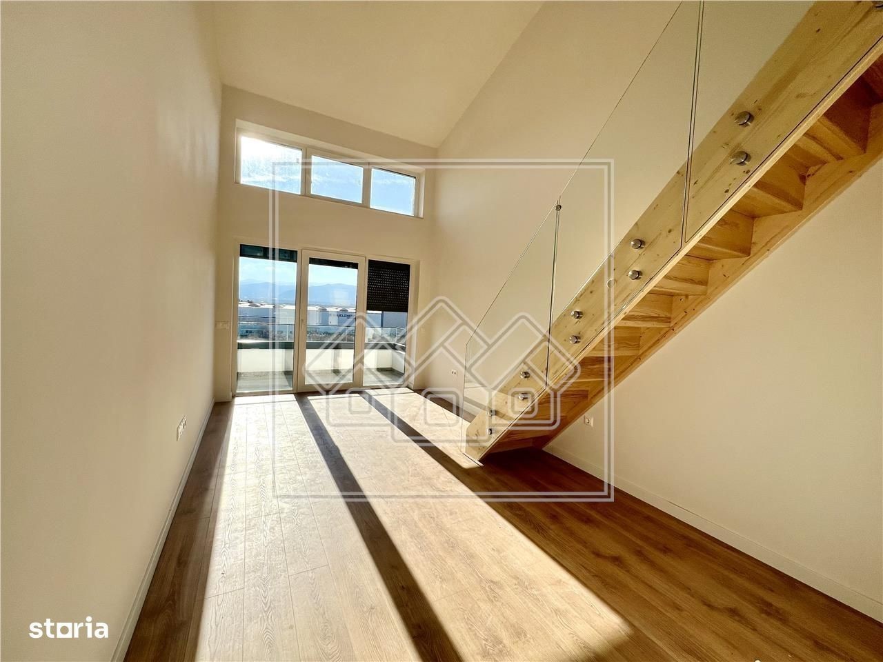 Penthouse 2 camere intabulat cu balcon si bucatarie separata Un penthouse practic intr-un cartier nou, cu drumuri pavate si aer curat. Aici gasesti un apartament modern, intr-o vila cocheta cu putini vecini si intimitate sporita. Detalii penthouse: - 77.8 mp utili - bucatarie separata - baie cu geam - balcon cu suprafata de 6.24 mp - incalzire in pardoseala - centrala termica in condensatie - contoarele de gaz si curent sunt montate - tamplarie PVC cu 5 camere si 3 foi de sticla - izolatie cu vata bazaltica - orientare sudica - loc de parcare inclus. Optiuni de plata: Credit bancar sau surse proprii, pretul ramane la fel indiferent de optiunea aleasa Pretul afisat este valabil pentru predarea la stadiul de alb La cheie: 133.000 euro. Avantaje ansamblu rezidential DaVinci Homes: Orientare sudica pentru toate balcoanele 4 intrari si iesiri in cadrul ansamblului Locuri de joaca amenajate in cartier Locuri de parcare incluse Drumuri complet pavate Vile construite in trepte de nivel Fatada decorata cu larice siberian si piatra naturala. 45% din suprafata destinata spatiilor verzi Sistem automatizat de irigatie pentru spatiile verzi Arbori ornamentali maturi inca din prima zi Locatarii ansamblului se vor bucura de liniste, de aer curat, dar si de?priveliste frumoasa spre munti. Locatie: Zona de Vest Distanta de 4 minute pana la zona Industrial Vest 4 minute pana la Metro 15 minute pana in centrul istoric al Sibiului. ***Fotografiile afisate sunt utilizate cu titlu informativ. ID Intern: 22795.