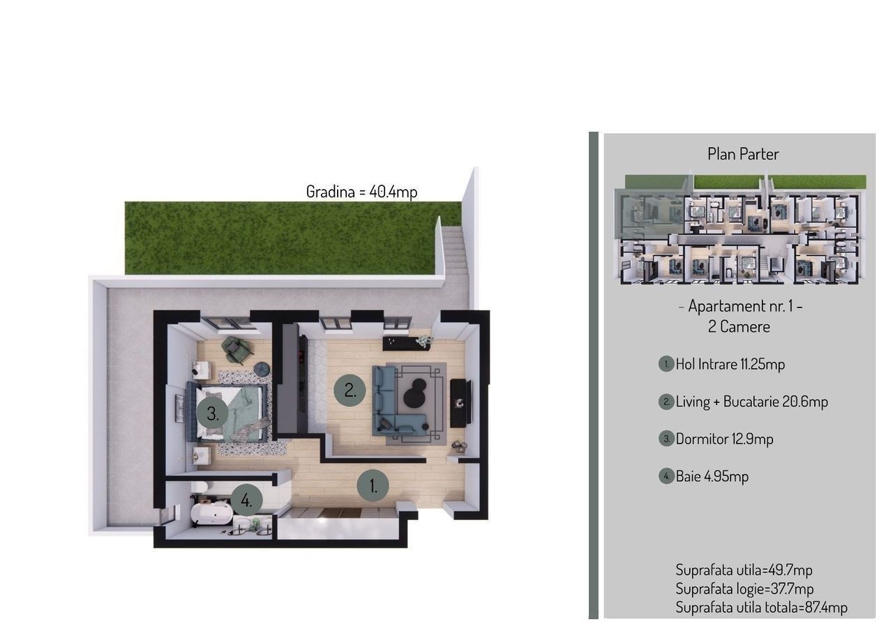 Habitat Grup Imobiliare va ofera spre vanzare un apartament 2 camere semidecomandat cu o suprafata utila de 49,7 mp + terasa 37,7 mp + curte 40,4 mp la pretul promotional de 132.656 Euro TVA inclus pentru plata unui avans de 80% la antecontract sau 136.541 Euro TVA inclus pentru plata unui avans de 50% la antecontract sau 138.760 Eur TVA inclus pentru plata avans 15% la antecontract. Apartamentul este in stadiu avansat de finisare si avem ACTE GATA DE MUTARE. Apartamentul de 2 camere semidecomandat cu o suprafata utila de 49,7 mp plus terasa de 37,7 mp plus gradina de 40,4 mp si este situat la parterul inalt al unui bloc cu 5 etaje aflat in stadiu avansat de finisare si amplasat la doar 12 minute de statia de metrou Nicolae Teclu. In imediata vecinatate regasim Parcul Teilor, magazine, scoli, gradinite, spital, precum si mijloace de transport in comun.Pe palier sunt doar 6 apartamente. Din paletarul dezvoltatorului, la un buget generos va punem la dispozitie finisaje de calitate la alegerea Dvs. Compartimentarea ideala pentru familia dumneavoastra: - Living + bucatarie : 20,6 mp - Dormitor : 12,9 mp - Baie cu geam afara : 4,95 mp - Hol : 11,25 mp - Terasa : 37,7 mp mp - Curte : 40,4 mp Apartamentul se preda echipata si utilata cu gresie, faianta, parchet, usi interior si cea de exterior securizata, geamuri termopan, incalzire in pardoseala si centrala proprie in condensatie pe gaz de 24 kw, baile echipate si utilate. Apartamentul va fi predat la cheie bransat la toate utilitatile Enel, Engie si Apanova. Amplasat la doar 12 minute de statia de metrou Nicolae Teclu, in apropriere de supermarket Auchan Titan, Lidl, Profi, gradinite, scoli, farmacii, spitale, spatii verzi si de agrement, dar si Parcul Teilor, confera confortul mult dorit pentru familia dumneavoastra. Separat se poate achizitiona loc parcare demisol la pretul de 11.900 Eur TVA inclus. Oferim asistenta gratuita in vederea intocmirii dosarului de creditare. Comision 0%. Poze reale din apartament. Locatie birou vanzari dezvoltator : strada Postasului nr.29, Sector 3 Waze: Habitat Group Estate Program vizionari: Luni - Vineri : 10:00 - 18:00 si Sambata : 10:00 - 14:00 Recomand vizionare Bogdan Mavrogheorghe