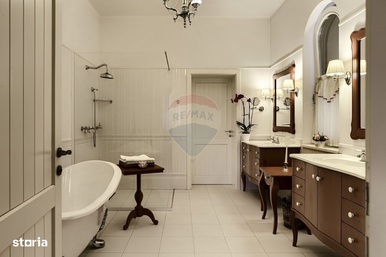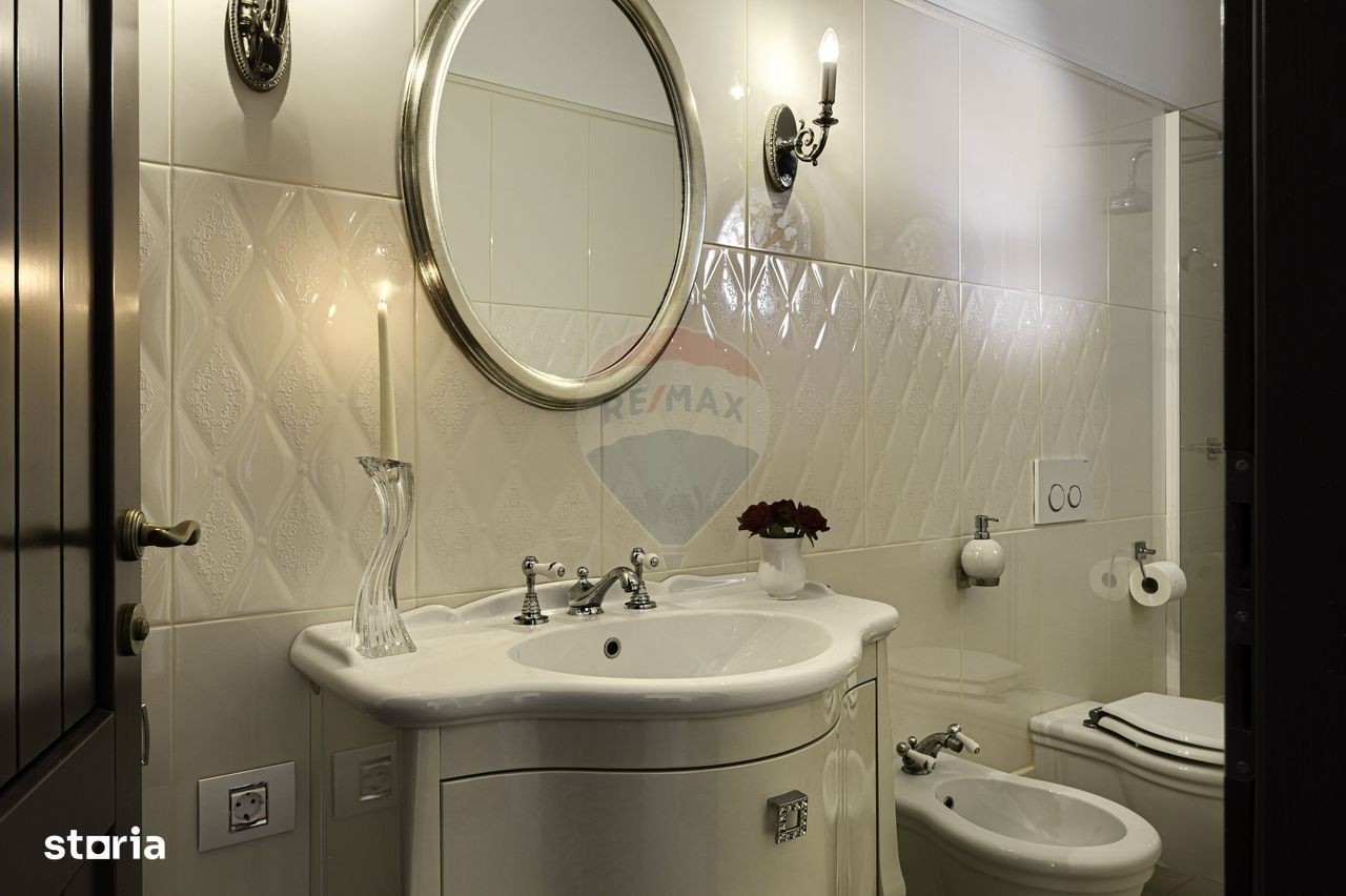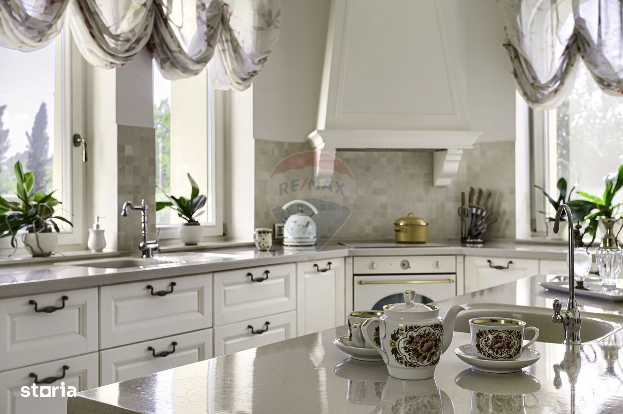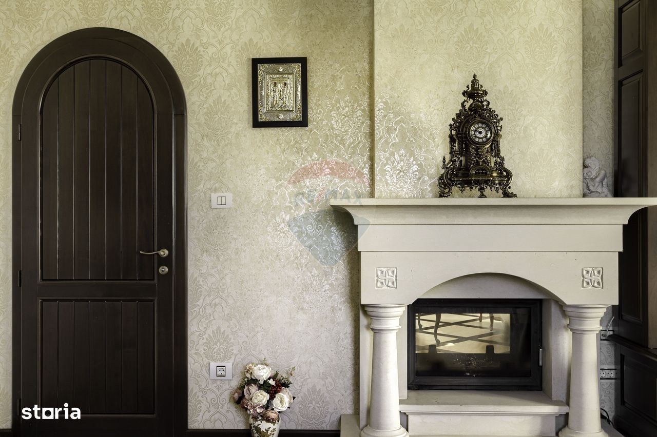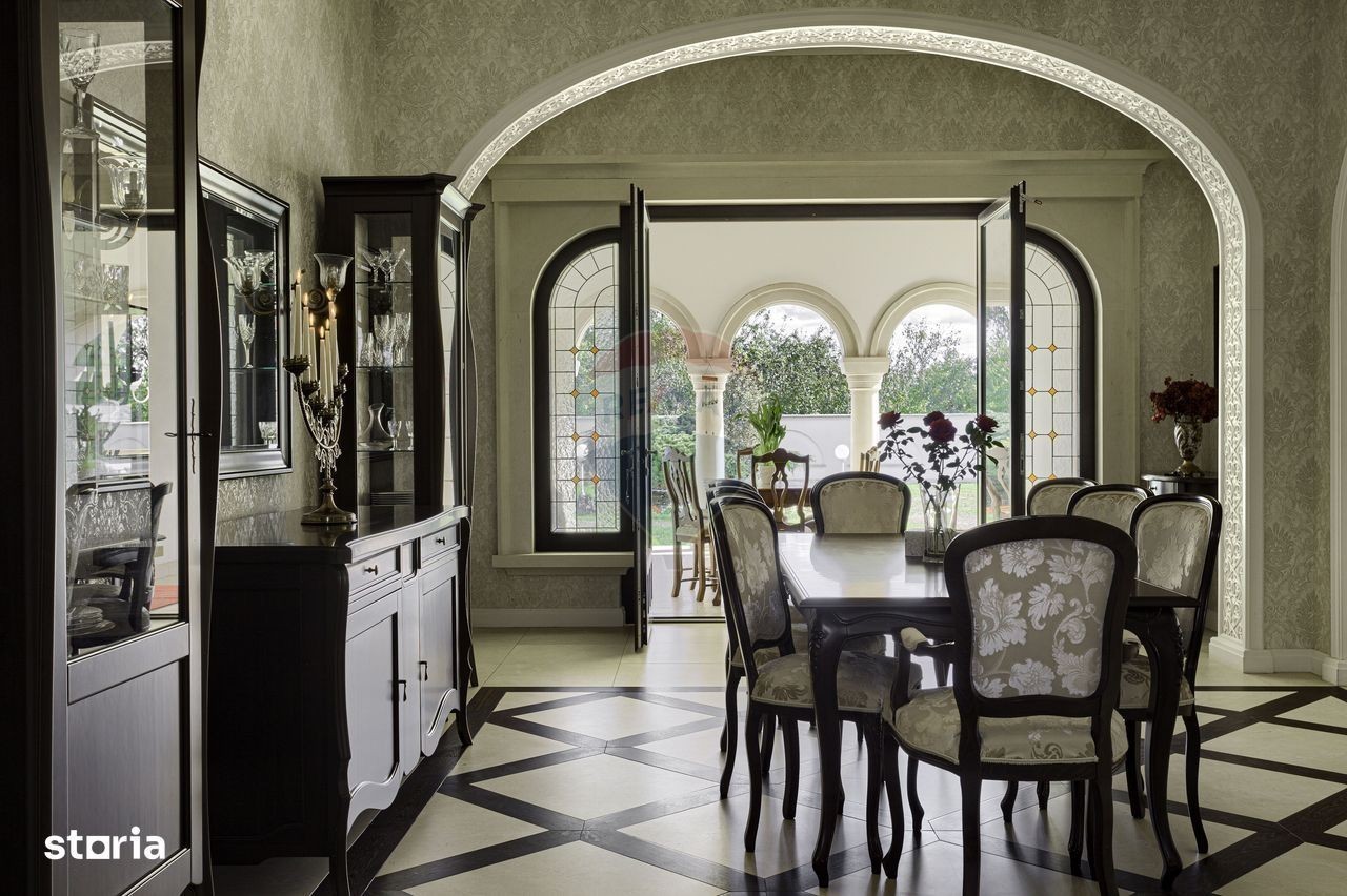 RE/MAX Tecno Realty are plăcerea să vă prezinte o superbă vila situată în Mandruloc com Vladimirescu, zonă ideală pentru cei care apreciază confortul și liniștea! Amplasata pe un teren de 1728 mp,această vilă stil baroc clasic construita la sol, de 320 mp este concepută pentru a oferi confort maxim și funcționalitate, păstrând în același timp un stil rafinat și elegant.Vila exprima maretie, lux, opulenta precum si dorinta de a impresiona prin arhitectura si decorul sau fastuos,integrând spații de locuit generoase, luminoase și bine definite. Holul elegant cu spațiu de depozitare pentru haine și încălțăminte, ofera acces direct către living și celelalte zone, si o baie de serviciu cu dus. Salonul conectează diferite zone ale casei într-un mod fluid, in suprafata de 70mp utili oferind un spațiu generos pentru servirea mesei în familie sau pentru organizarea de cine festive, o masă mare din lemn masiv, cu scaune confortabile pentru 10 persoane. Printr-o ușa dubla, impunatoare cu bolta si geam cu vitralii se face trecerea spre o terasă spațioasă, ideală pentru relaxare sau mese în aer liber, cu o vedere superbă către grădină. Intregul mobilier al casei este stil italian, din lemn masiv, pardoseala incalzita din piatra si dusumea din lemn masiv, lustrele elegante din cristal, perdele si draperii de matase si catifea care oferă o atmosferă de lux si opulenta dar totodata caldă și primitoare. Canapelele din stofa si lemn masiv stil baroc sunt dispuse în fața unui șemineu elegant si functional, ideal pentru serile de relaxare. Ferestre panoramice care oferă o priveliște superbă asupra grădinii și permit o legătură vizuală plăcută cu exteriorul. Camera de oaspeti sau birou privat este un spațiu liniștit și functional bine gândit.Amplasata într-o zonă retrasă a vilei, aceasta camera versatila oferă un cadru de o eleganta unica ! Bucătăria eleganta este parte integrantă a unui astfel de design, separata de dining, echipată cu electrocasnice de ultima generatie și o insulă centrală pentru gătit. Dormitorul matrimonial cu baie proprie si dressing adiacent, bine organizat, este o oază de liniște, spațios și bine iluminat natural. Are ferestre mari care oferă o priveliște frumoasă către grădină și permit luminii naturale să inunde camera. O baie privată en-suite, clasica si eleganta, dotată cu cadă freestanding, cabină de duș și mobilier din lemn Din curte, cu acces separat avem o bucatarie complet dotata si echipata, precum si spatiul tehnic si acces la pod. Gradina,o oaza de verdeata cu plante mature este bine echilibrată, cu arbori si arbuști de diferite înălțimi și dimensiuni, grupate natural astfel încât să pară organizată, dar fără un aspect forțat sau artificial, cu zone de relaxare, un balansoar la umbra copacilor si alei pietruite. Va insotesc cu drag la vizionarea acestei superbe vile care vă va convinge in fiecare zi ca merita sa o cumparati !