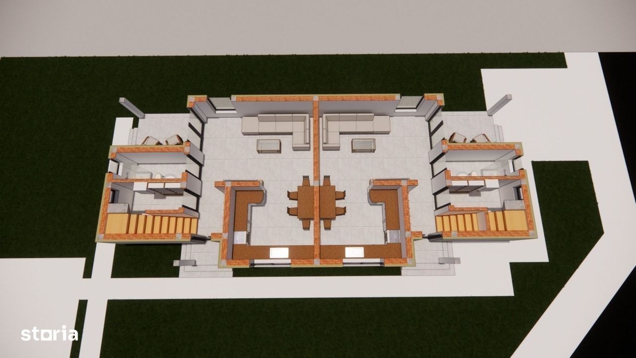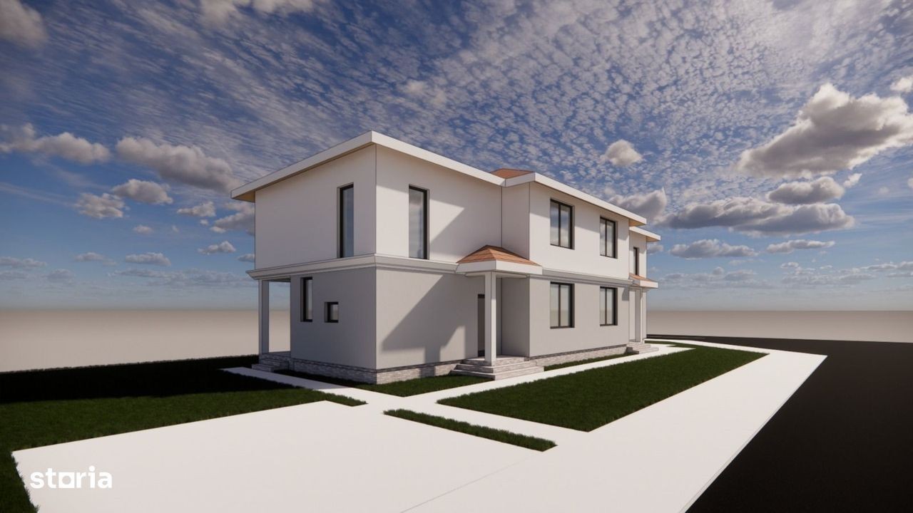 1/2 Duplex situat in Comuna Mosnita Noua, langa Serena 1 zona pavata, cu acces si de pe Drumul Boilor, langa Lidl 2; Tipologia duplex-ului este de P+1E cu placa de beton peste etaj si acces in pod; Suprafata utila este de 105mp si este compartimentat astfel: PARTER: hol, baie, camera tehnica, living, bucatarie, si terasa acoperita; ETAJ: trei dormitoare, baie si dressing; Suprafata terenului aferent este de 300m pentru partea din stanga la pretul de 175.000 Euro, iar pentru partea din dreapta 250m teren pretul de 170.000 Euro; Utilitati: gaz, curent, apa de la retea, canalizare; Gardul imprejmuire din placi de beton, iar in partea din fata gard din boltari ziditi si porti din fier. Centrala proprie pe gaz, incalzire prin pardoseala. Finisajele sunt la alegerea cumparatorului pe baza unui buget alocat. Proiectul este in lucru, momentan la gri pe interior, un avantaj ca se poate personaliza dupa preferinte, cu termen de predare in luna ianuarie 2026; Comison 0%.