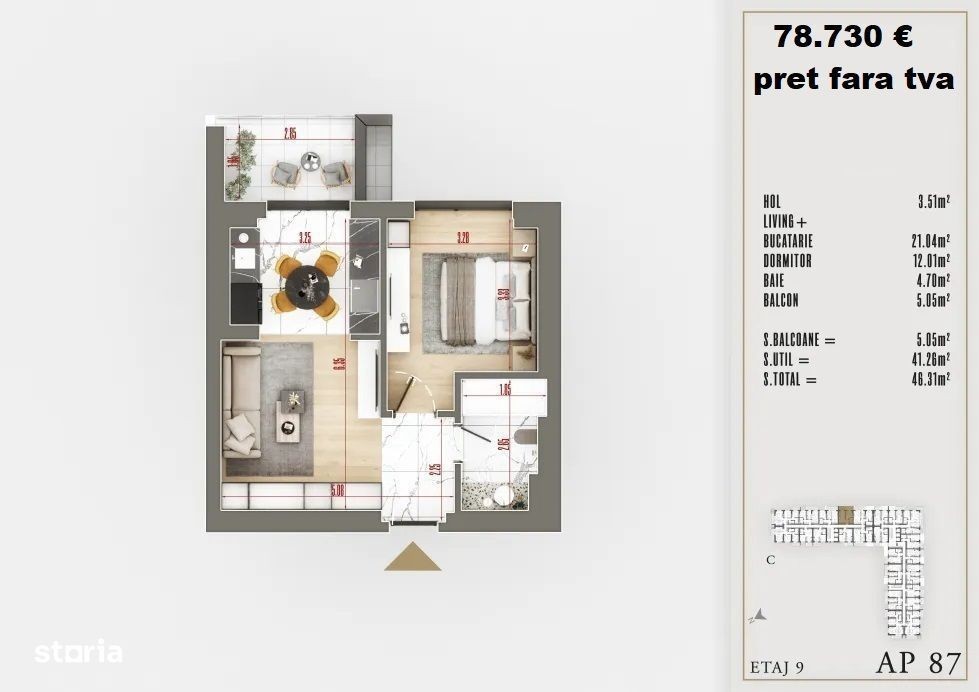 Studio modern, spațios și luminos - locuința ideală pentru tine! Imaginează-ți un loc în care fiecare detaliu este gândit pentru confortul tău, unde designul modern și funcționalitatea se întâlnesc într-un spațiu plin de lumină și posibilități. Acest studio elegant se află la etajul 5 din 11 și are o suprafață totală de 46.31 mp, dintre care 41.26 mp utili și un balcon generos de 5.05 mp. Este locul perfect pentru a-ți crea un cămin modern, într-o zonă care îți oferă toate facilitățile necesare pentru un stil de viață activ și relaxant. Preț de vânzare: 78.730 € + TVA - Avantaje & Zonă Educație: Complexul Educațional Victor Brauner Școala Gimnazială Nr. 116 Grădinițele Nr. 68 și Nr. 160 Magazine & centre comerciale: IKEA Pallady, Auchan, Jumbo, Lidl, Decathlon Iris Mall & alte centre comerciale Relaxare & sport: Parcul Teilor (lac artificial, terenuri de tenis, baschet, fotbal) Parcul Alexandru Ioan Cuza (IOR) Bazin de înot, fitness, aerobic, saună - Ce îl face special? Confort termic premium - geamuri tripan de ultimă generație și încălzire în pardoseală, pentru un ambient plăcut în orice anotimp. Izolație acustică de excepție - materiale de calitate care reduc zgomotele exterioare, oferindu-ți un spațiu de liniște absolută. Tehnologie smart home integrată - un apartament inteligent, gata să îți facă viața mai confortabilă și eficientă. Facilități moderne la doar câțiva pași - acces rapid la magazine, restaurante și transport în comun. Zone verzi extinse - pentru relaxare și socializare în aer liber, într-un mediu echilibrat între natură și urban. - De ce să alegi acest studio? Nu este doar o locuință, ci un loc care îți va reflecta stilul de viață, dorințele și nevoile. O investiție inteligentă în confortul și viitorul tău. Fiecare colț al acestui spațiu a fost gândit pentru a-ți aduce bucurie și liniște, oferindu-ți un adevărat refugiu urban. Acesta nu este doar un apartament - este începutul unui nou capitol, un loc unde visele tale pot prinde contur. Nu mai aștepta! Descoperă această oportunitate și transformă acest studio în locuința perfectă pentru tine. - Pentru detalii și programări la vizionare, mă poți contacta cu încredere: Daniel Manea -