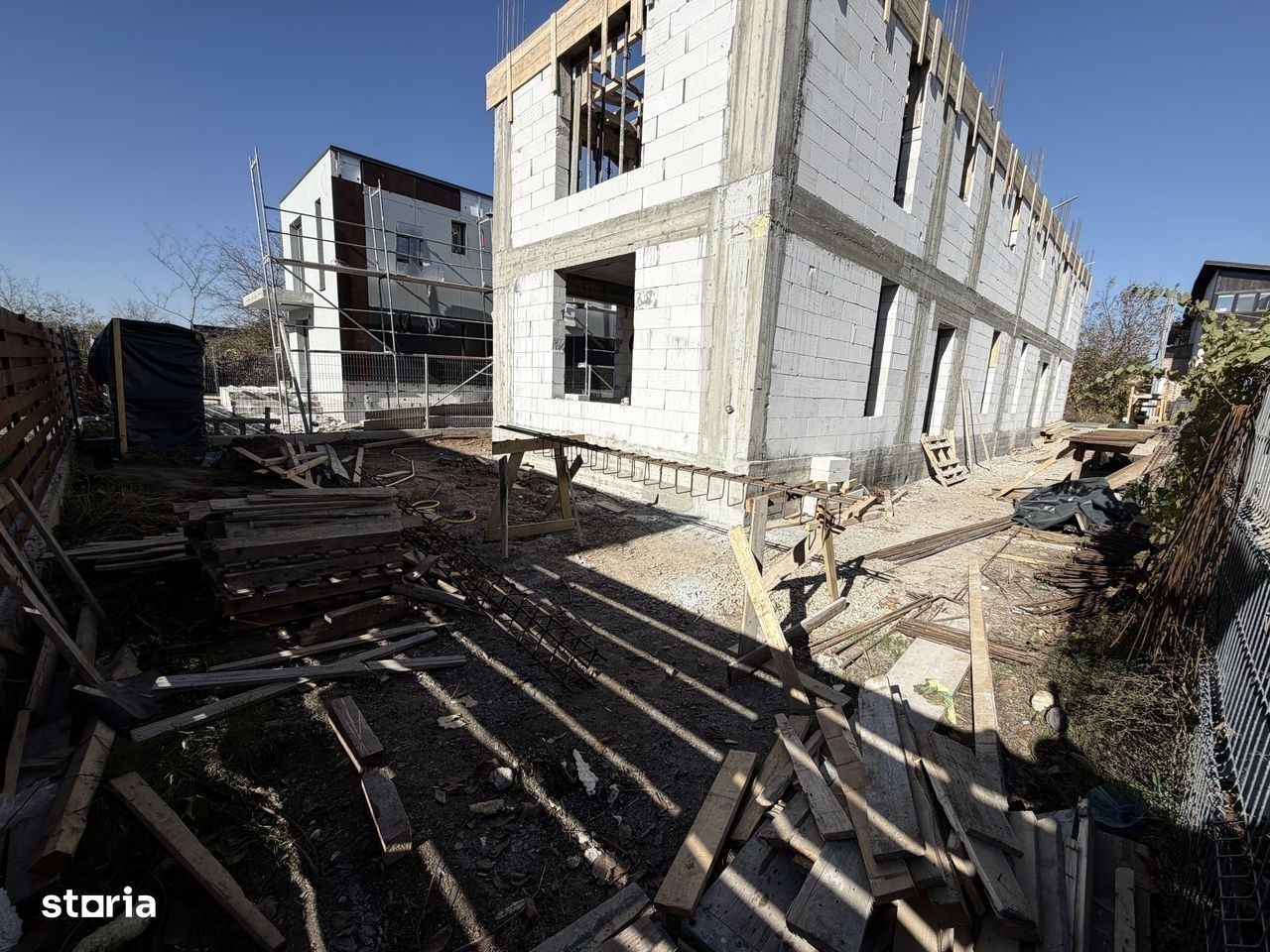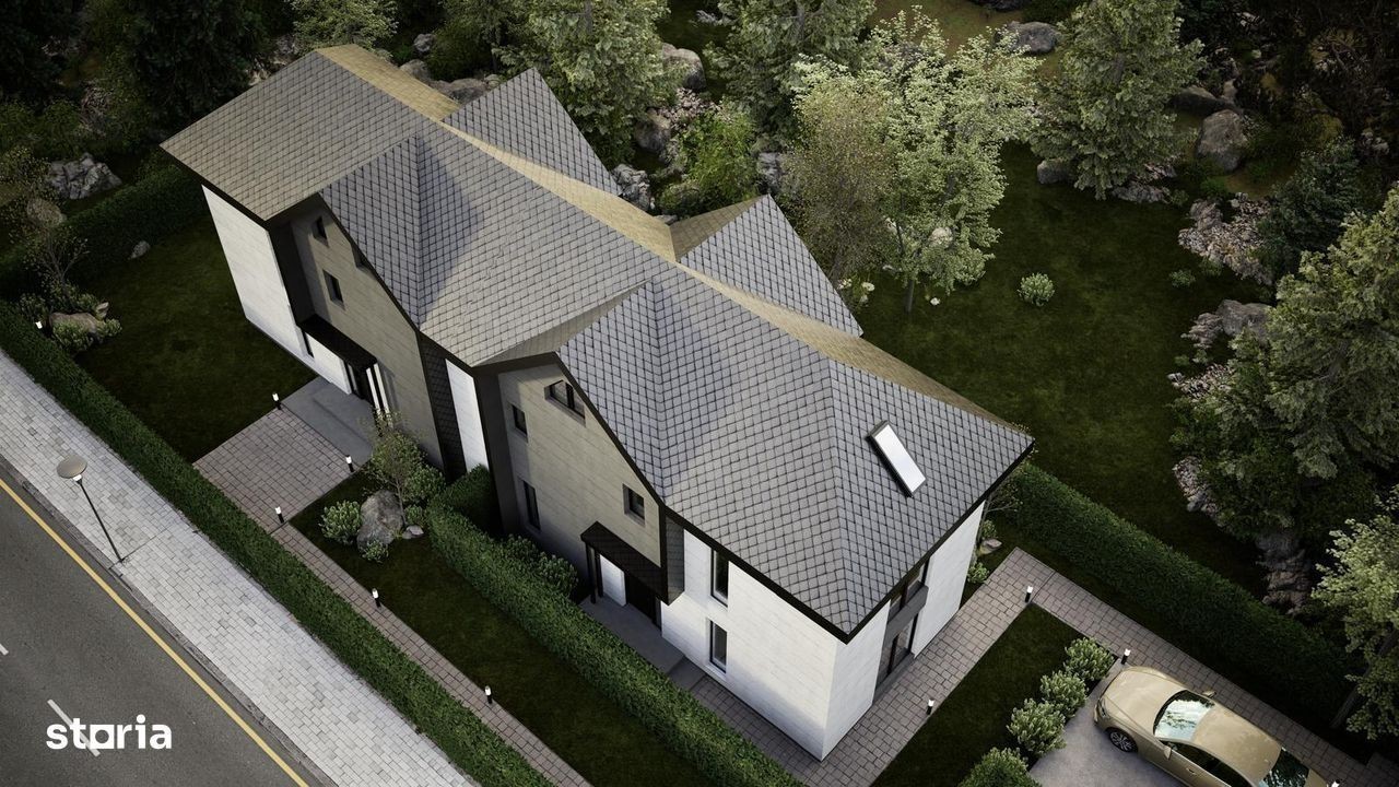 Casa tip duplex cu pereti separati P+1+M. Compartimentare: 5 camere, bucatarie, 4 bai, dressing, 1 terasa, 2 parcari, dupa cum urmeaza: