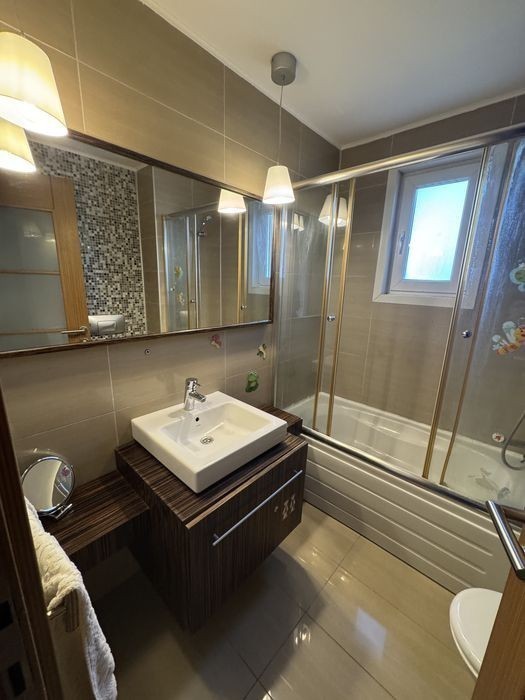 Va oferim spre închiriere un apartament Spațios de 3 camere situat in complexul Cosmopolis, zona de Nord a Bucureștiului. Apartamentul este situat la Et 2 într-un imobil Nou de 7 nivele, suprafața utila 87 mp, terasă 6 mp. Dispune de un living spațios și luminos, Bucătărie închisă complet mobilată și utilată, 2 dormitoare, dormitorul matrimonial cu baie proprie, o baie pe hol care deservește cel de al doilea dormitor, terasă cu vedere la piscină Apartamentul este la prima închiriere. Se închiriază complet mobilat și utilat modern În fața blocului deține și un loc de parcare. Facilității Complex: paza Bgs, Mall unde aveți restaurante, cafenele, farmacie, croitorie, Carrefour de aprovizionare, Lidl. magazin Non-stop, scoala, Grădinițe, spații de joaca pentru copii, acces la cele 10 piscine ale complexului, sala Fitness, coafor, mijloc de transport in comun care circula doar cei care locuiesc in complex. MERITA VAZUT !
