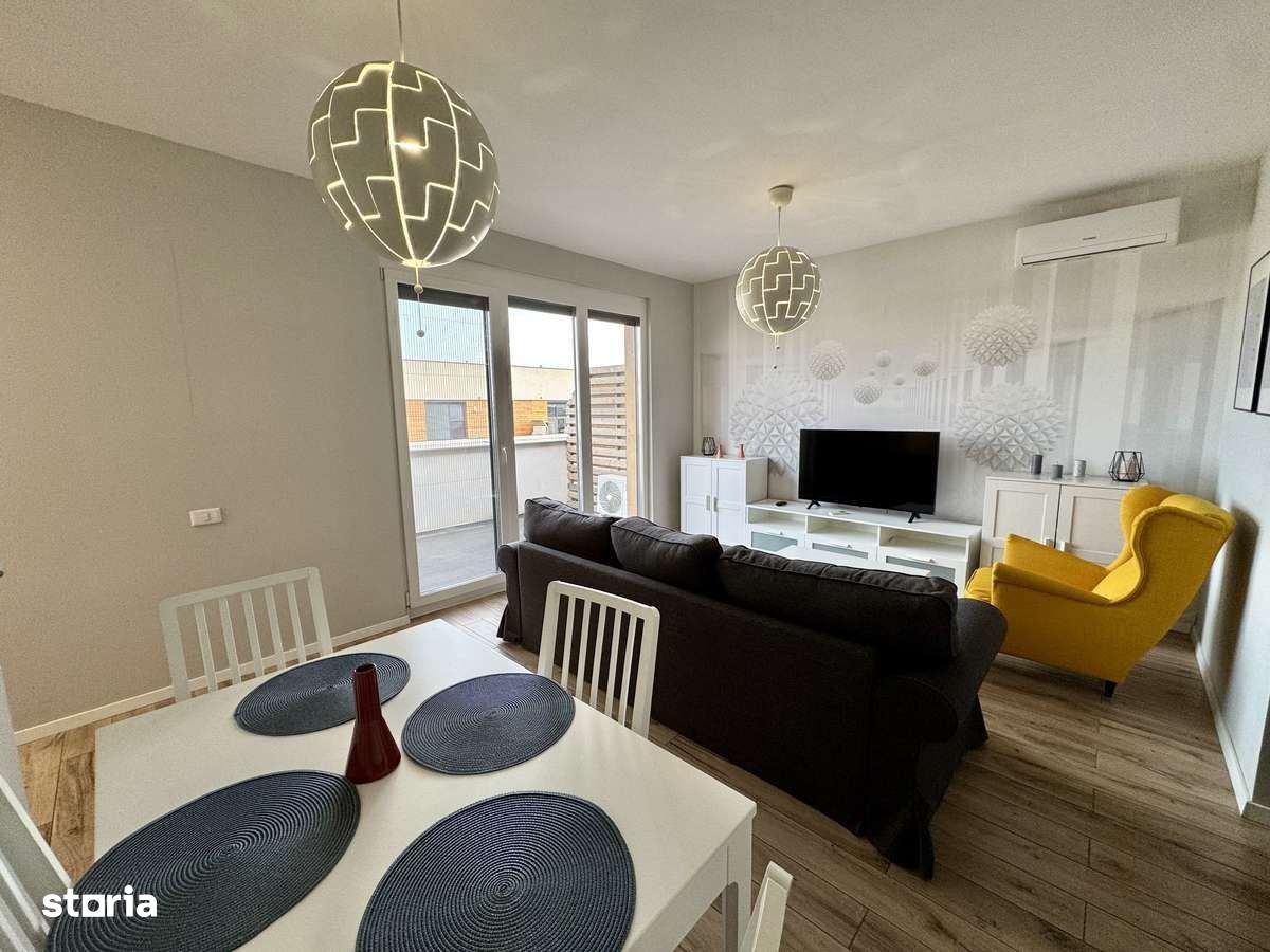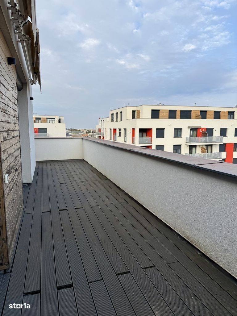 Vand penthouse 3 camere, in suprafata de 66 mp utili + 43 mp terasa, in bloc nou, decomandat, amenajat modern, in noul cartierul rezidential Ared-IMAR. Compus dintr-un hol generos, la intrare cu spatiu de depozitare, bucatarie deschisa in living, cu loc de luat masa, mobilata si utilata, livingul este luminos si spatios, mobilat modern cu coltar extensibil si fotoliu+ smart TV si iesire pe terasa, doua dormitoare amenajate practic, ambele avand iesire pe terasa, doua bai, amenajate cu toate utilitatile, inclusiv masina de spalat si o terasa spatioasa, pozitionata pe toata suprafata apartamentului.