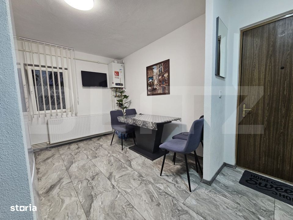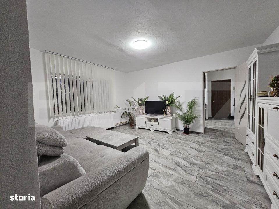 Blitz vă propune spre vânzare un apartament cu 2 camere, situat la parter înalt, într-un bloc anvelopat termic, care oferă un confort excelent pe tot parcursul anului. Locuința este compartimentată eficient, fiind compusă din: -Bucătărie spațioasă cu hol generos, ideală pentru momentele în familie; -Living modern amenajat, luminos și primitor; -Sas cu spațiu de depozitare inteligent integrat; -Dormitor cu dressing generos, perfect organizat; -Baie elegantă cu duș, modernă și funcțională. Apartamentul a fost renovat integral în acest an, până la placa de beton, utilizând doar materiale de calitate superioară. Dispune de centrală proprie pe gaz cu instalație din țevi de cupru și încălzire prin calorifere, pentru eficiență și confort termic optim. De asemenea, instalația electrică a fost înlocuită complet, oferind siguranță și fiabilitate pe termen lung. Blocul este izolat termic exterior, reducând semnificativ costurile de întreținere și sporind confortul locativ. Localizare excelentă: la doar 2 minute de mers pe jos se află un supermarket și un parc, ideale pentru cumpărături rapide și momente de relaxare. Accesul către centrul orașului este facil, cu timp de deplasare de aproximativ 10 minute cu mașina. Acest apartament reprezintă o oportunitate excelentă pentru cei care își doresc o locuință modernă, fără griji, într-o zonă liniștită și bine conectată la oraș. Vă așteptăm la o vizionare, pentru a descoperi personal toate avantajele acestei proprietăți deosebite!