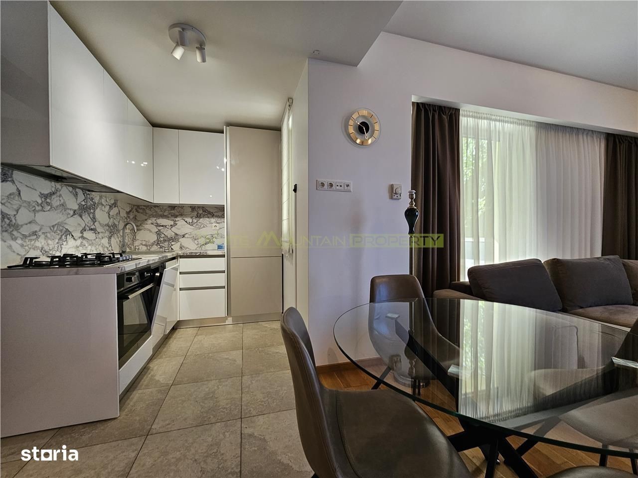 White Mountain Property ofera spre inchiriere acest apartament intim, placut si primitor cu doua camere situat in complexul ultraexclusivist Bellevue Residence, intr-o zona unica si foarte linistita in centrul Brasovului. Apartamentul este propus spre inchiriere impreuna cu un loc de parcare incalzit, in garaj si o boxa la subsolul cladirii. Bellevue Residence este cunoscut nu doar pentru finisajele sale calitative, stilul de viata premium si ambianta speciala, dar si pentru proximitatea fata de Centrul Istoric al Brasovului (departe insa de aglomeratia specifica), privelistea unica, verdeata si aer proaspat, combinand astfel intr-un mod armonios stilul arhitectural modern cu natura inconjuratoare. Apartamentul propus spre inchiriere este compus din doua camere, bucatarie open-space, baie, la care se adauga o terasa de 16 metri patrati. Apartamentul ofera o vedere superba asupra centrului orasului Brasov. De asemenea, apartamentul este complet mobilat si utilat la cele mai inalte standarde, pentru a oferi confort sporit viitorilor chiriasi. Mai mult, apartamentul este dotat cu video interfon color, sistem de alarma cu monitorizare, incalzire in pardoseala si incalzire electrica in baie. Dispune de suficiente spatii pentru depozitare si a fost amenajat cu multa implicare din partea unei companiei de design interior ImaGoo Design, pentru a isi intampina viitorii chiriasi intr-un camin primitor, intim si luxos si modern in acelasi timp. Apartamentul este situat intr-o zona deosebita, fiind proprietatea ideala pentru acele persoane care doresc sa locuiasca intr-un loc spatios, curat, sigur, stilat, nou si unic. Poate fi ideal si pentru cei care lucreaza de acasa. Pentru o buna desfasurare a contractului, se solicita plata in avans a primei luni de chirie si o garantie in contravaloarea a doua chirii lunare. Comisionul agentiei este cel standard, de 50% din prima chirie, de achitat la data semnarii contractului. Pentru detalii suplimentare sau vizionari, va rog nu ezitati sa ma contactati la numarul de telefon