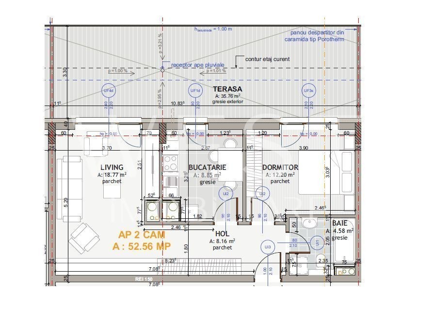 Vă propunem spre vânzare un apartament modern cu 2 camere, situat la etajul retras 8 într-un imobil nou, parte a unui ansamblu rezidențial din centrul Floreștiului aflat în curs de modernizare conform standardelor europene, cu trotuare late și drum cu două benzi pe sens. În apropiere se găsesc stații de autobuz (2 min), magazine, supermarketuri, iar la mică distanță va fi inaugurat viitorul Mall și noua școală de stat. Detalii apartament: - suprafață utilă: 53 mp - compartimentare: living open-space cu bucătărie, dormitor, baie - terasă circulară 36 mp Detalii tehnice: încălzire în pardoseală REHAU, prin centrală pe gaz cu tehnologie în condensare, tâmplărie PVC REHAU cu 3 foi de sticlă, 7 camere, pachet 4 anotimpuri, feronerie premium Roto, ușă metalică de acces cu sistem de închidere în 7 puncte. Avantaje imobil: construcție nouă, realizată din beton armat și pereți despărțitori din cărămidă Porotherm, termoizolație exterioară cu polistiren de 15 cm, densitate 100, finisaj decorativ siliconat Acuarela; racordat la toate utilitățile (gaz, apă, canalizare, curent) Blocul dispune de 2 lifturi moderne și garaj subteran cu locuri de parcare Prețurile sunt afișate cu TVA inclus pentru avans 50% Pentru detalii suplimentare și programarea unei vizionări, nu ezitați să mă contactați. Cod ofertă / ID: WST2924