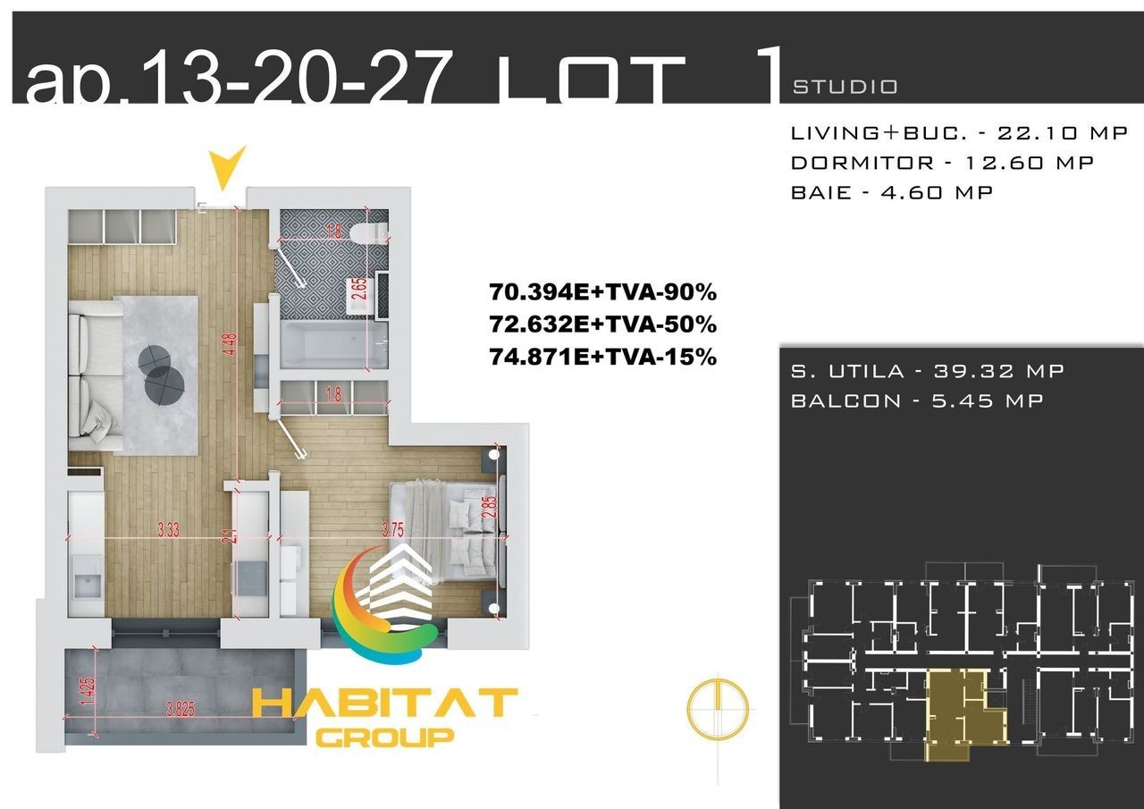 Locuința perfectă te așteaptă! Apartament modern cu 2 camere, tip studio, 1 baie și balcon de 5,45 mp. Situat la etajul 1 din 3, acest apartament de 44,77 mp (39,32 mp utili) este alegerea ideală pentru confort și relaxare. Dotări premium incluse: Parchet laminat elegant Gresie și faianță de calitate Tâmplărie PVC cu geam termopan Ușă metalică securizată pentru siguranța ta Baie complet echipată Centrală proprie în condensație de 24 kW și încălzire în pardoseală - confort garantat Se predă „la cheie”, branșat la toate utilitățile (Enel, Engie și Apanova). Finalizare proiect: 2026 - rezervă-ți acum noul tău cămin! Prețuri speciale: 70.394 euro + TVA - avans 90% la antecontract 72.632 euro + TVA - avans 50% la antecontract 74.871 euro + TVA - avans 15% la antecontract Pozele sunt cu titlu de prezentare. Adresă: Strada Poștașului nr. 29, Sector 3 Waze: Habitat Group Estate Program vizionări: Luni - Vineri: 10:00 - 18:00 Sâmbătă: 10:00 - 14:00 Contact: Daniel Manea -