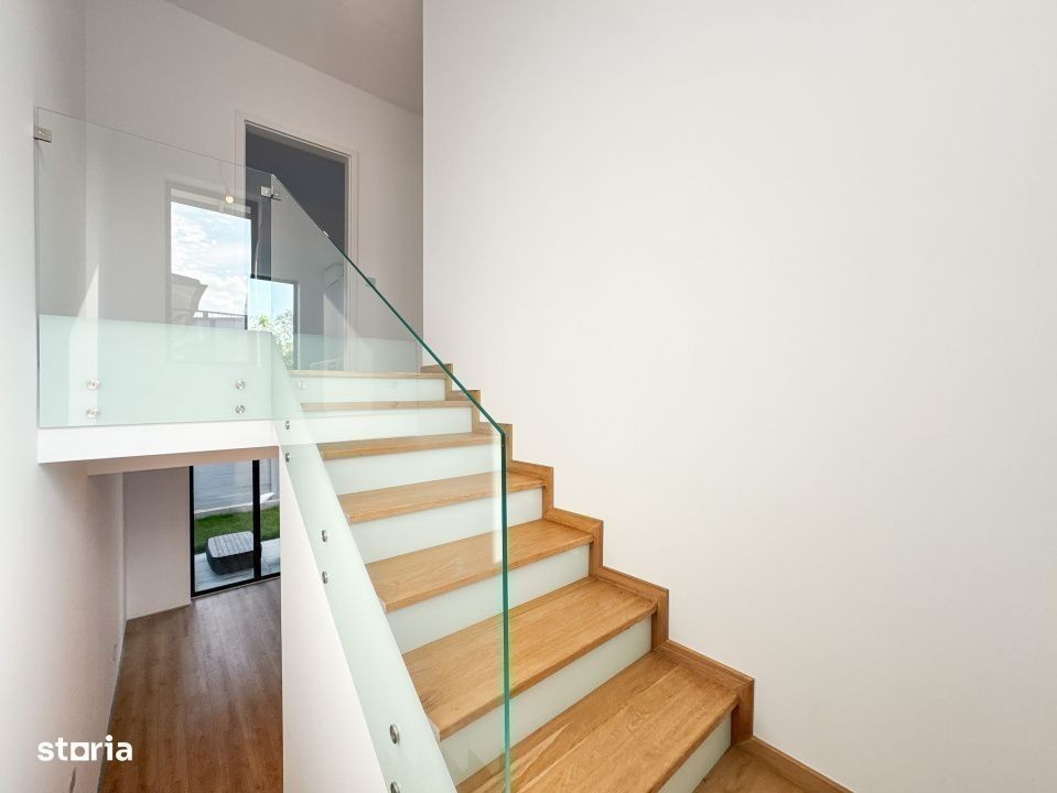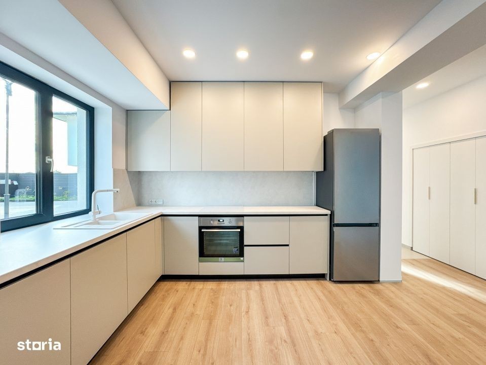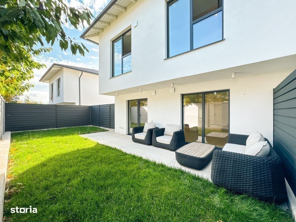 In cadrul ansamblului boutique Ecovillas Otopeni, accesibil prin bariera privata, se ofera spre inchiriere o casa tip duplex cu suprafata utila de aproximativ 120 mp, balcon si curte individuala cu acces direct din zona auto dedicata, unde pot fi parcate minim doua masini. Locuinta se remarca prin standardul ridicat de calitate si prin tehnologiile verzi integrate: incalzire in pardoseala pe toata suprafata, pompe de caldura de ultima generatie, sistem de ventilatie mecanica cu recuperare de caldura, tamplarie tripan Low-E si statie pentru incarcare auto electrica. Izolatia superioara si sistemul smart-home integrat contribuie la confortul termic constant si la un consum energetic redus. Se preda nemobilata, cu exceptia bucatariei care este complet mobilata si utilata, dotata cu frigider, plita, cuptor electric, hota si masina de spalat vase incorporata. In plus, se ofera masina de spalat rufe Samsung, un TV Samsung cu diagonala de 138 cm, un pat de copil cu saltea Mobexpert, precum si un set de canapele cu masa de exterior. Parterul reuneste zona de zi formata din living, dining si bucatarie open-space, cu acces direct catre terasa si curte, o baie si un spatiu tehnic. Etajul este dedicat zonei de noapte, cu trei dormitoare, doua bai si balcon. Curtea individuala este complet amenajata, dispune de sistem de irigatie automat pentru gazon si ofera intimitate, confort si un spatiu verde pentru relaxare. Ecovillas Otopeni, ansamblu compus din doar 9 vile, este un concept de locuire durabila, fara gaze naturale, cu accent pe confort, siguranta si eficienta energetica. O alegere potrivita pentru cei care cauta o locuinta moderna intr-un cadru linistit, dar bine conectat la Bucuresti si principalele puncte de interes din nordul capitalei. Se doreste contract de inchiriere pe minim 2 ani. 0% COMISION