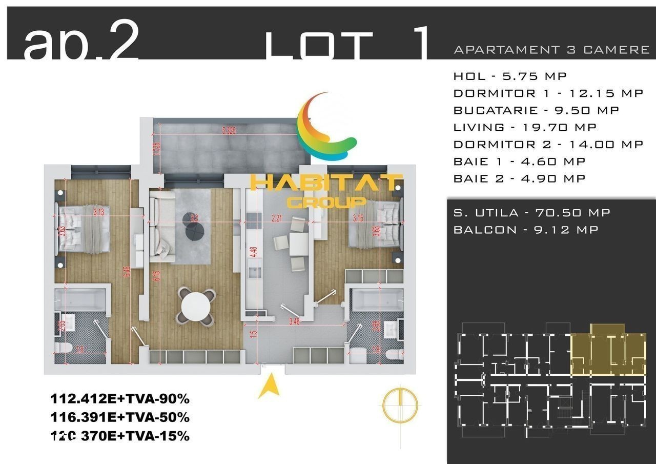 Locuinta perfecta te asteapta! Apartament modern cu 3 camere, bucatarie openspace, 2 bai si balcon generos de 11.1 mp! Situat la etajul 1, acest apartament de 76.3 mp (65.2 mp utili) este alegerea ideala pentru confort si relaxare. Dotari premium incluse: Parchet laminat elegant Gresie si faianta de calitate Tamplarie PVC cu geam termopan Usa metalica securizata pentru siguranta ta Baie complet echipata Centrala proprie in condensatie de 24 kW si incalzire in pardoseala - confort garantat! Se preda "la cheie", bransat la toate utilitatile (Enel, Engie si Apanova)! Finalizare proiect: 2026 - Rezerva-ti acum noul tau camin! Preturi speciale: 91.322 euro + TVA - avans 98% la antecontract 100.413 euro + TVA - avans 50% la antecontract 107.851 euro + TVA - avans 15% la antecontract Pozele sunt cu titlu de prezentare. Vino la biroul nostru: strada Postasului nr. 29, Sector 3 Waze: Habitat Group Estate Program vizionari: Luni - Vineri: 10:00 - 18:00 Sambata: 10:00 - 14:00 Hai sa il vezi si sa te convingi ca e locuinta perfecta pentru tine! Contact: Daniel Manea -
