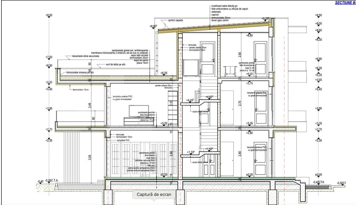 Proprietatea, compusă din două corpuri de casă tip duplex P+2E, face parte dintr-un proiect rezidențial modern, realizat cu atenție la detalii, design arhitectural contemporan și materiale de cea mai bună calitate. Spațiile vitrate ample, compartimentarea inteligentă și priveliștea superbă asupra munților transformă această proprietate într-un spațiu ideal pentru locuință permanentă, casă de vacanță sau investiție turistică exclusivistă (pensiune boutique, închiriere premium). Detalii tehnice și suprafețe -Suprafață utilă: 280 mp + 108 mp terase -Suprafață teren: 538 mp -Suprafață construită: 364 mp -Suprafață desfășurată totală: 457 mp -Suprafață terase parter: 48 mp -Suprafață terase panoramice: 108 mp -Regim de înălțime: P+2E -Acces auto și pietonal separat pentru fiecare unitate Compartimentare pe niveluri (PENTRU FIECARE UNITATE DUPLEX) Parter: -Bucătărie și living open space, spațiu generos și luminos, cu acces direct către terasă -Baie -Hol și debara pentru depozitare -Terasă exterioară perfectă pentru relaxare sau dining Etaj 1: -Dormitor matrimonial cu baie proprie și dressing -Două dormitoare deservite de o baie comună -Hol și două balcoane cu vedere deschisă Etaj 2: -Dormitor spațios cu baie proprie și dressing -Balcon și terasă panoramică cu vedere superbă către Munții Bucegi și Piatra Craiului - o priveliște menită să-ți taie respirația Construcție și finisaje -Materiale de construcție premium, selectate pentru durabilitate, eficiență energetică și confort termic sporit -Încălzire în pardoseală pe toate nivelurile, pentru un confort termic constant și eficiență energetică ridicată -Arhitectură modernă, cu fațadă elegantă alb-gri și accente din lemn natural -Spații vitrate mari pentru lumină naturală și deschidere vizuală -Posibilitate de personalizare interioară în funcție de preferințele viitorului proprietar Beneficii și localizare -Zonă rezidențială liniștită și aerisită, în plină dezvoltare -Acces rapid către Brașov și Aeroportul Internațional Ghimbav -Curte spațioasă și locuri de parcare în incintă -Ideală pentru locuință de familie, casă de vacanță sau pensiune boutique -Vedere panoramică asupra munților, pentru un stil de viață relaxat și rafinat