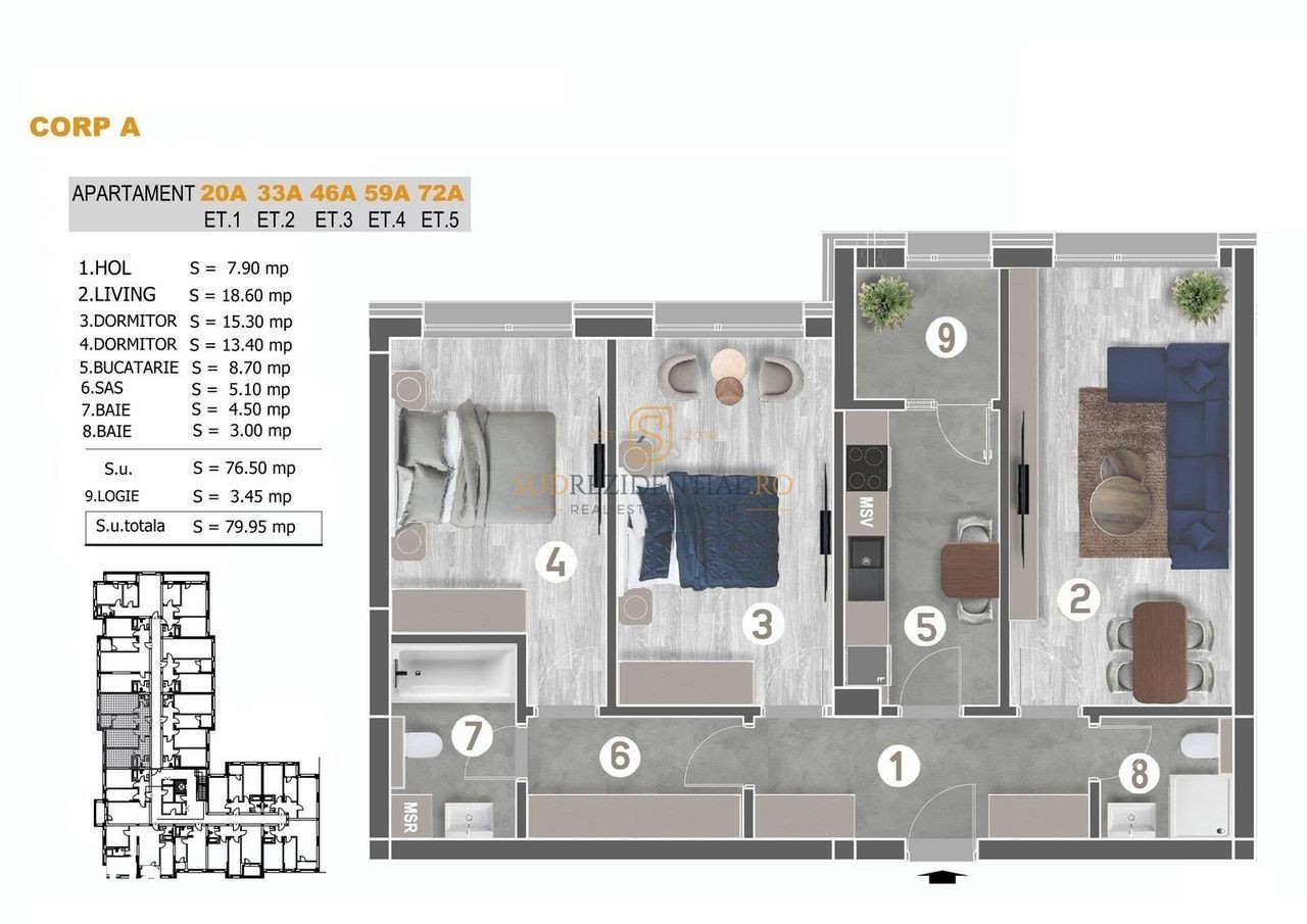 Va oferim spre vanzare un apartament cu 3 camere, disponibil in cadrul proiectului imobiliar Cavar Residence. Ansamblul rezidential se afla in apropierea Bulevardului Constantin Brancoveanu si a galeriilor comerciale care alcatuiesc Grand Arena Mall. Apartamentul se distinge prin finisaje de calitate premium si dispune de o compartimentare moderna. Suprafata totala de 79.95 mp a fost distribuita echilibrat astfel: living 18.60 mp, dormitoare de 15.30 mp, respectiv 13.40 mp, bucatarie inchisa 8.70 mp, baie 4.50 mp, baie 3 mp, hol de acces 7.90 mp, balcon 3.45 mp. Locuinta se preda echipata complet si dispune de finisaje si obiecte sanitare de calitate premium, centrala termica in condensare, tamplarie PVC cu geam tripan de foarte buna calitate. Cavar Residence este un proiect imobiliar premium, pozitionat excelent si integrat complet cu natura, interconectat cu toate facilitatile moderne ale orasului si insotit de o serie de facilitati complementare. Proiectul imobiliar Cavar Residence este amplasat intr-o zona rezidentiala aflata in continua dezvoltare din Sectorul 4 al Capitalei, in imediata apropiere a galeriilor comerciale ce formeaza Grand Arena Mall. Apartamentul este amplasat intr-o zona cu acces facil la toate facilitatile esentiale. In apropiere se gasesc centre comerciale precum Carrefour, Lidl, Kaufland, Metro, Auchan si Hornbach, dar si institutii de invatamant, clinici si farmacii. Transportul in comun este bine dezvoltat, statia STB fiind la doar 100 m distanta, iar metroul Aparatorii Patriei poate fi accesat rapid. Accesul catre bulevarde importante precum Constantin Brancoveanu, Metalurgiei si Alexandru Obregia este usor si permite deplasari rapide in orice directie a orasului. Pentru cei care apreciaza spatiile verzi si activitatile in aer liber, Parcul Tudor Arghezi se afla in apropiere, oferind zone de recreere si terenuri de sport.