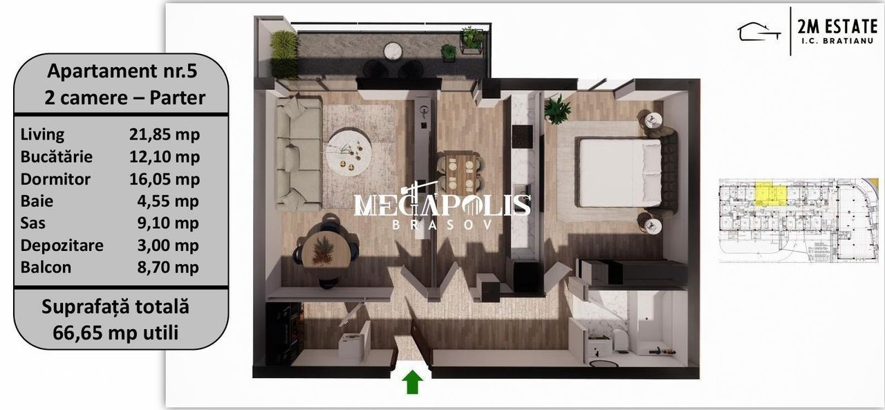 Vânzare apartament 2 camere - Zona Tractorul, Brașov Ansamblu rezidențial nou, situat într-o zonă cu infrastructură complet dezvoltată, aproape de Coresi Shopping Resort. Preț: 129.600 € + TVA 21% Suprafață utilă: 66,65 mp Balcon: 8,70 mp Termen de predare: Decembrie 2025 Compartimentare: - Living: 21,85 mp - Bucătărie: 12,10 mp - Dormitor: 16,05 mp - Baie: 4,55 mp - Sas: 9,10 mp - Spațiu de depozitare: 3,00 mp - Balcon: 8,70 mp Dotări și beneficii: - Încălzire în pardoseală - Ascensor care coboară până în parcarea subterană - Spațiu de adăpostire ALA (buncăr) - Izolație exterioară cu vată minerală bazaltică de 15 cm - Panouri solare pentru eficiență termică - Acces securizat în curtea interioară cu barieră la intrare - Sistem de supraveghere video Modalități de plată: - Achitare integrală: 80% la semnarea antecontractului, 20% la intabulare - Achitare în 3 tranșe până la intabulare: 40% - 30% - 30% - Achitare prin credit bancar: 40% la antecontract, 60% prin credit Parcări disponibile: - Subterană: de la 13.000 € - Supraterană: de la 8.000 € Pentru mai multe detalii și programarea unei vizionări: