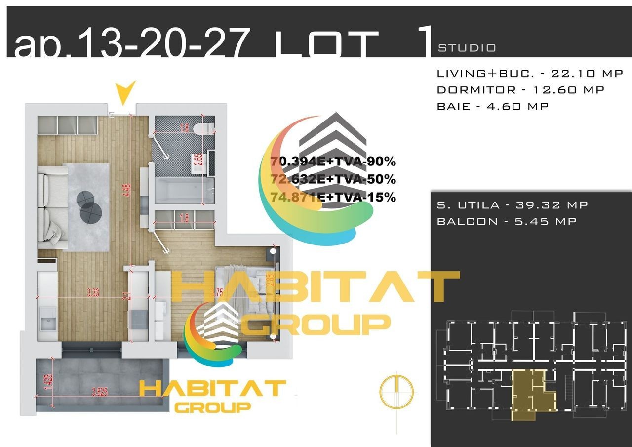 Habitat Group Imobiliare va prezinta sre vanzare un apartament 2 camere semidecomandat avand o suprafata totala utila de 44,77 mp la pretul promotional de 85.176 Euro TVA inclus pentru plata unui avans de 90 % la antecontract sau 87.884 Eur TVA inclus pentru plata unui avans de 50 % la antecontract sau 90.594 Eur TVA inclus pentru avans de 15% la antecontract. Apartamentul de 2 camere semidecomandat situat la etajul 1 al unui bloc cu 3 niveluri, cu o compartimentare ideala pentru familia dumneavoastra, suprafata utila de 39,32 mp + o terasa de 5,45 mp. Din paletarul dezvoltatorului, la un buget generos va punem la dispozitie finisaje de calitate la alegerea Dvs. Compartimentarea ideala pentru familia dumneavoastra : - Living + bucatarie 22,1 mp - Dormitor 12,6 mp - Baie 4,6 mp - Balcon 5,45 mp Apartamentul se preda echipat si utilat cu gresie, faianta, parchet, usi interior si cea de exterior securizata, centrala proprie pe gaz in condensatie de 24 kw cu incalzire in pardoseala, baia echipata si utilata. Apartamentul va fi predat la cheie bransat la toate utilitatile Enel, Engie si Apanova. Amplasat la doar 17 minute de mers pe jos pana la statia de metrou Nicolae Teclu, in apropriere de supermarket Auchan Titan, Lidl, Profi, gradinite, scoli, farmacii, spitale, spatii verzi si de agrement, dar si Parcul Teilor, confera confortul mult dorit pentru familia dumneavoastra. Oferim asistenta gratuita in vederea intocmirii dosarului de creditare. Comision 0%. Exista posibilitatea achizitionarii separate a unui loc de parcare suprateran la pretul de 7.000 Eur TVA inclus sau loc parcare subteran descoperit la pretul de 7.000 Eur TVA inclus sau loc parcare subteran acoperit la pretul de 11.000 Eur TVA inclus. Pozele au titlul de prezentare. Locatie birou vanzari dezvoltator : strada Postasului nr.29, Sector 3 Waze: Habitat Group Estate Program vizionari: Luni - Vineri : 10:00 - 18:00 si Sambata : 10:00 - 14:00 Recomand vizionare Bogdan Mavrogheorghe