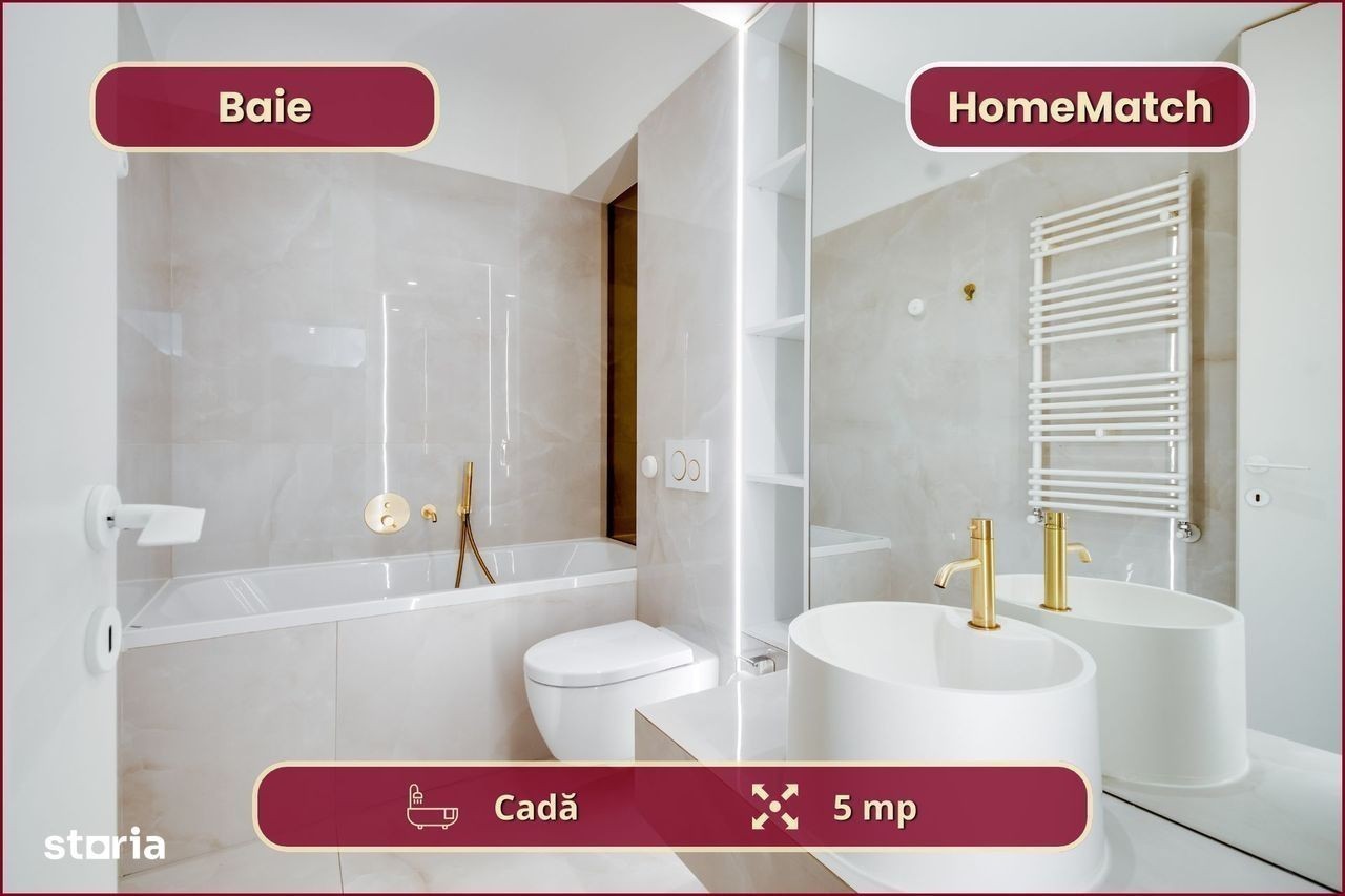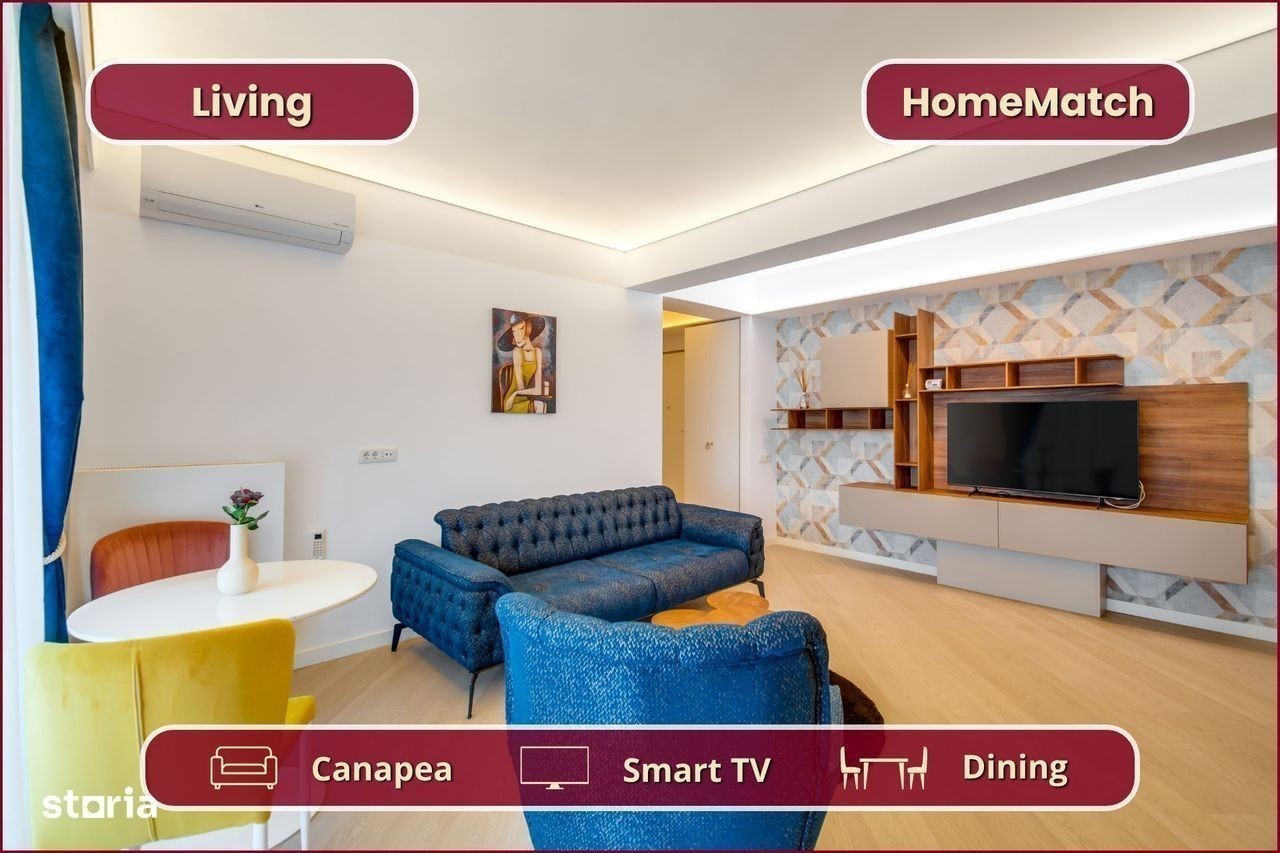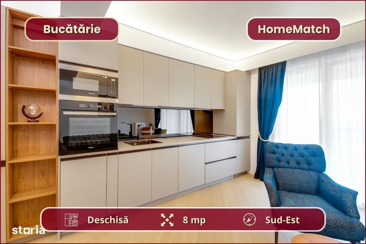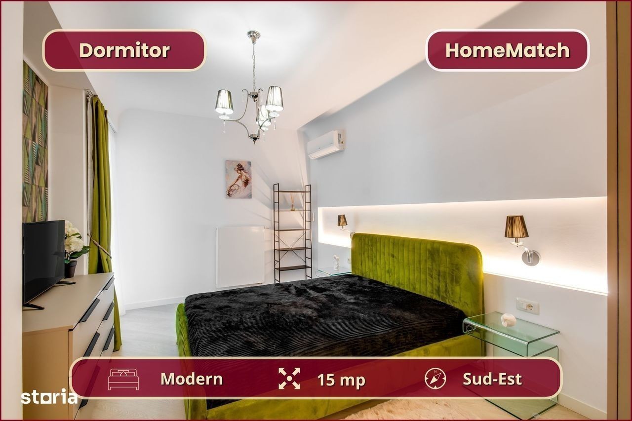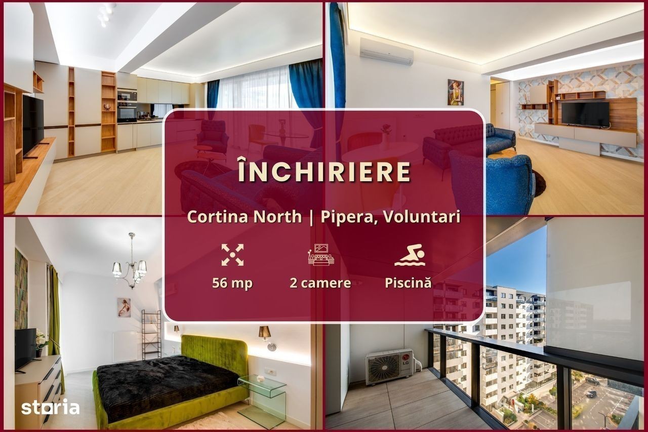 Vrei să locuiești într-un cartier exclusivist din Nordul Bucureștiului? Vrei să ajungi mai repede la biroul din Pipera, la școlile internaționale de prestigiu și la restaurantele selecte de pe Șoseaua Nordului? Închiriază unul dintre superbele apartamente din ansamblul rezidențial Cortina North! Ansamblul Cortina North se află în zona Pipera (Voluntari, Ilfov), la doar 3 minute de centrul comercial Pipera Plaza. Apartamentul are o suprafață totală de 56 mp și este compus din: - Living (19 mp): amenajat cu canapea, smart TV și zonă de dining; - Bucătărie (8 mp): deschis[, mobilată și utilată complet; - Balcon (6 mp): nemobilat; - Dormitor (15 mp): dotat cu pat dublu și dressing; - Baie (5 mp): dotată cu cadă; - Hol de acces (3 mp): amenajat cu oglindă și spații de depozitare. Finisajele, mobilierul și electrocasnicele sunt produse noi, de cea mai bună calitate: - fațadă ventilată, obiecte sanitare și tâmplărie aluminiu de înaltă calitate; - mobilier de cea mai bună calitate; - mașină de spălat rufe, mașină de spălat vase, frigider, cuptor, aragaz, hotă. Ansamblul rezidențial dispune de următoarele facilități: - parcare subterană pe 2 niveluri (1 loc inclus): mașinile sunt ferite de praf, soare și precipitații; - centru wellness, bazin semiolimpic și pistă de alergare: stil de viață activ și sănătos. Împrejurimile oferă acces facil la toate obiectivele (cu mașina): - centre de business: Swan Office Park (3 min); - centre comerciale: Pipera Plaza (3 min); - restaurante: Nor Sky Casual (6 min); - săli de sport: 18Gym Pipera (2 min); - grădinițe și școli: Olga Gudynn Pipera (8 min); - parcuri și atracții turistice: Parcul Herăstrău (9 min); - transport: stație STV (1 min), metrou Aurel Vlaicu (6 min). Condiții de închiriere: - disponibilitate: imediat; - perioadă minimă: 1 an; - animale de companie: nu sunt permise; - fumat: permis doar pe balcon; - garanție: echivalentul unei luni de chirie. Și pentru ca semnarea contractului de închiriere să fie cât mai simplă pentru tine, ți-am pregătit o ofertă imbatabilă: 0% comision! Programează o vizionare acum! HomeMatch Alege-ți locuința, nu doar o casă oarecare