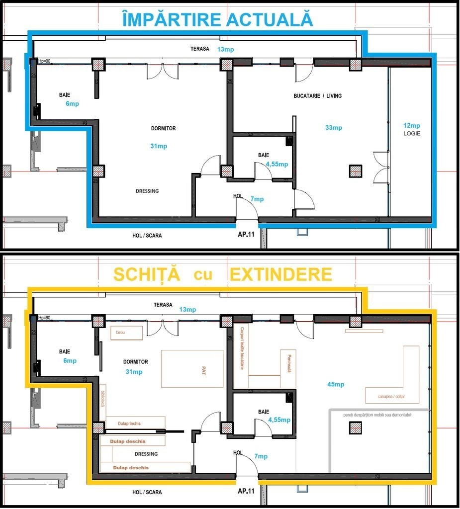 Apartamentul este situat pe str. Plopilor, în blocul cu restaurantul Nobori, vedere spate + lateral. Are în mometul de față o suprafață de 82 m2, un balcon de 13 m2 și o logie de 12 m2.