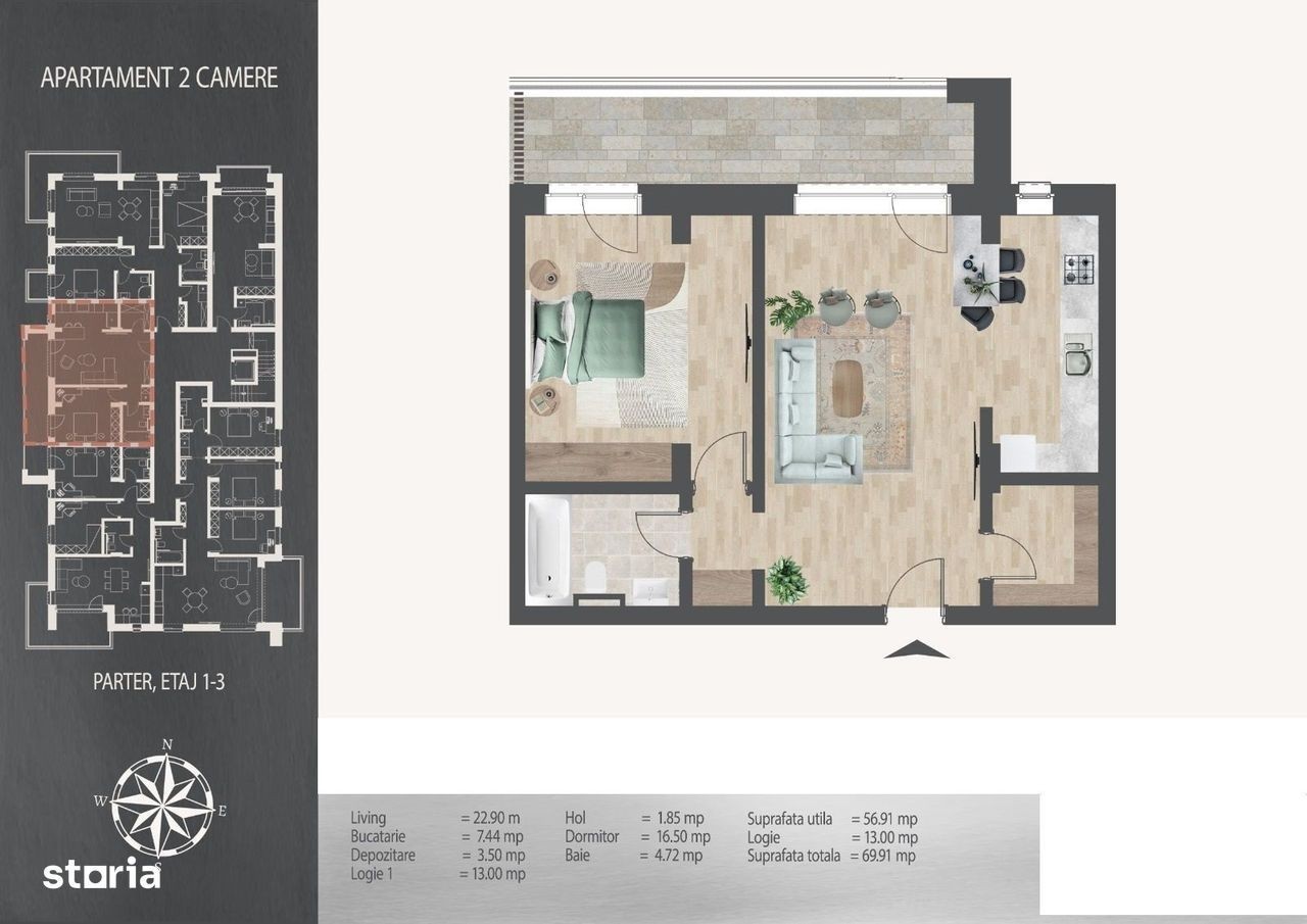 Habitat Group Imobiliare va prezinta un apartament 2 camere decomandat avand o suprafata totala utila de 69,91 mp la pretul promotional de 126.887 Euro TVA inclus pentru plata unui avans de 90 % la antecontract sau 135.345 Eur TVA inclus pentru plata unui avans de 50 % la antecontract sau 143.804 Eur fara TVA pentru plata avans 15 % la antecontract. Apartamentul de 2 camere decomandat situat la etajul 1 al unui bloc cu 4 niveluri, cu o compartimentare ideala pentru familia dumneavoastra, suprafata utila de 56,91 mp + o terasa de 13 mp. Din paletarul dezvoltatorului, la un buget generos va punem la dispozitie finisaje de calitate la alegerea Dvs. Compartimentarea ideala pentru familia dumneavoastra : - Living 22,9 mp - Hol 1,85 mp - Dormitor 16,5 mp - Bucatarie 7,44 mp - Baie 4,72 mp - Depozitare 3,5 mp - Terasa 13 mp Apartamentul se preda echipat si utilat cu gresie, faianta, parchet, usi interior si cea de exterior securizata, centrala proprie pe gaz in condensatie de 24 kw cu incalzire in pardoseala, baia echipata si utilata. Apartamentul va fi predat la cheie bransat la toate utilitatile Enel, Engie si Apanova. Amplasat la doar 8 minute de statia de metrou Nicolae Teclu, in apropriere de supermarket Auchan Titan, Lidl, Profi, gradinite, scoli, farmacii, spitale, spatii verzi si de agrement, dar si Parcul Teilor, confera confortul mult dorit pentru familia dumneavoastra. Oferim asistenta gratuita in vederea intocmirii dosarului de creditare. Comision 0%. Exista posibilitatea achizitionarii separate a unui loc de parcare suprateran neacoperit la pretul de 9.000 Eur TVA inclus sau loc parcare subteran la pretul de 13.000 Eur TVA inclus. Pozele au titlul de prezentare. Locatie birou vanzari dezvoltator : strada Postasului nr.29, Sector 3 Waze: Habitat Group Estate Program vizionari: Luni - Vineri : 10:00 - 18:00 si Sambata : 10:00 - 14:00 Recomand vizionare Bogdan Mavrogheorghe