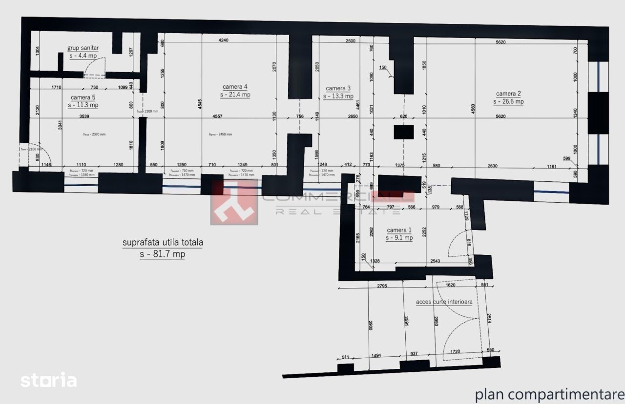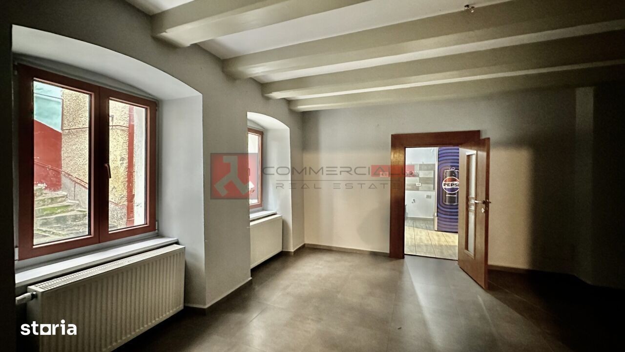 Ti-a atras atentia un spatiu comercial, situat in Centrul Istoric, amplasat pe o artera cu trafic pietonal si auto intens, pe o strada principala, intr-o zona cu valoare arhitecturala si istorica semnificativa, frecventata de rezidenti si vizitatori. Aceasta pozitionare confera spatiului vizibilitate crescuta, accesibilitate optima si potential comercial ridicat, fiind potrivita pentru activitati comerciale, servicii sau reprezentanta. Locatia beneficiaza de vizibilitate excelenta datorita fluxului pietonal constant, accesului facil si proximitatii fata de puncte de interes istoric, restaurante, cafenele si obiective turistice relevante. Acesti factori ii confera o pozitionare strategica, adecvata pentru diverse tipuri de activitati comerciale sau de servicii. Detalii spațiu: -suprafață utilă: 82 mp.; -tamplarie din PVC cu geam termopan; -posibilitate terasa; -acces secundar pentru aprovizionare. Compartimentare: -3 incaperi + 2 spatii depozitare (conform schita); -2 grupuri sanitare; -inaltime utila - 2,7 m.; -acces pentru persoane cu dizabilități. Utilități: -apă și canalizare; -energie electrică; -internet -gaze naturale. Conditii inchiriere: -plata unei garantii constand in contravaloarea a doua chirii; -se acorda perioada de gratie, pentru anenajare, fara plata chiriei. Situatie C.F.: Spatiu comercial. Pentru informații și detalii suplimentare, vizionarea imobilului sau stabilirea unor detalii specifice, nu ezitați sa contactați CommerciALL Real Estate, folosind formularul de contact sau numărul de telefon asociat acestui anunț. NOTĂ: Reprezentantul CommerciALL Real Estate | Brașov, a efectuat vizionarea imobilului, realizând fotografii detaliate care reflectă starea actuală a acestuia. De asemenea, a verificat documentația specifică, care va fi disponibilă ulterior, după vizionare și confirmarea interesului pentru imobil. Pentru variante similare, accesati site-ul: commerciall.ro WHO. WE. ARE. Cu o prezență solidă de peste 10 ani în ecosistemul imobiliar brașovean, suntem o companie de real estate specializată exclusiv in segmentul comercial. Beneficiind de o rețea semnificativă de contacte și cunoștințe în piața imobiliară comercială din Brașov, suntem determinați să vă oferim oportunități unice și sprijin pentru identificarea locației perfecte, indiferent de tipul de proprietate dorit: -spatii birouri; -spatii comerciale; -hoteluri și pensiuni; -spații sau terenuri industriale. -proprietati speciale Oferim servicii complete de tranzacționare și consultanță imobiliară, asistând clienții în procesul de identificare urmata de închirierea sau vânzarea proprietăților comerciale existente sau a proiectelor noi. Angajamentul nostru este să aducem inovație și expertiză în furnizarea de soluții imobiliare personalizate. MAKE THE RIGHT CHOICE