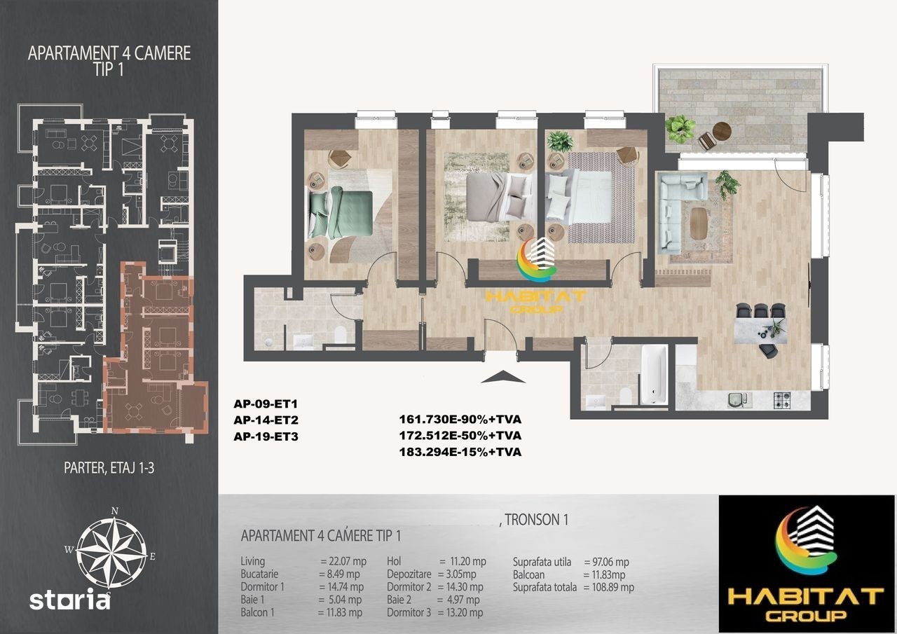 Apartament modern cu 4 camere, openspace, 2 bai și o terasa generoasa de 11.83 mp. Situat la etajul 2 din 4, acest apartament de 108.89 mp (97.06 mp utili) este alegerea ideală pentru confort și relaxare. Dotări premium incluse: Parchet laminat elegant Gresie și faianță de calitate Tâmplărie PVC cu geam tripan Ușă metalică securizată pentru siguranță Baie complet echipată Centrală proprie în condensație de 24 kW și încălzire în pardoseală - confort garantat Se predă „la cheie”, branșat la toate utilitățile (Enel, Engie și Apanova). Finalizare proiect: 2027 - Rezervă-ți acum noul tău cămin! Prețuri: 161.730 euro + TVA - avans 90% la antecontract 172.512 euro + TVA - avans 50% la antecontract 183.294 euro + TVA - avans 15% la antecontract Parcare exterioara - 9.000 euro tva inclus Parcare subterana - 13.000 euro tva inclus Pozele sunt cu titlu de prezentare. Locație: Strada Poștașului nr. 29, Sector 3 Waze: Habitat Group Estate Program vizionări: Luni - Vineri: 10:00 - 18:00 Sâmbătă: 10:00 - 14:00 Contact: Daniel Manea -