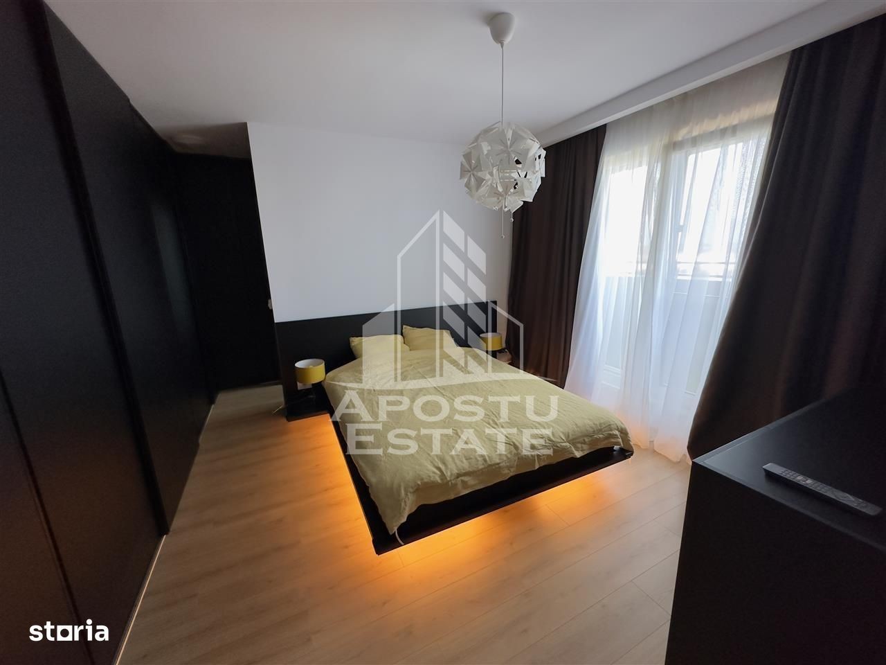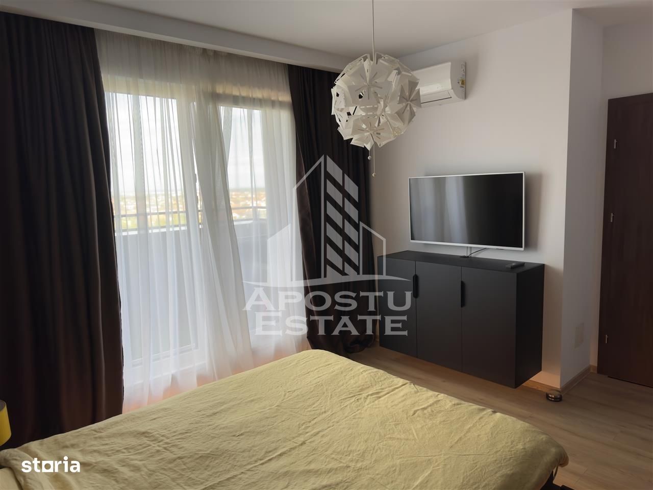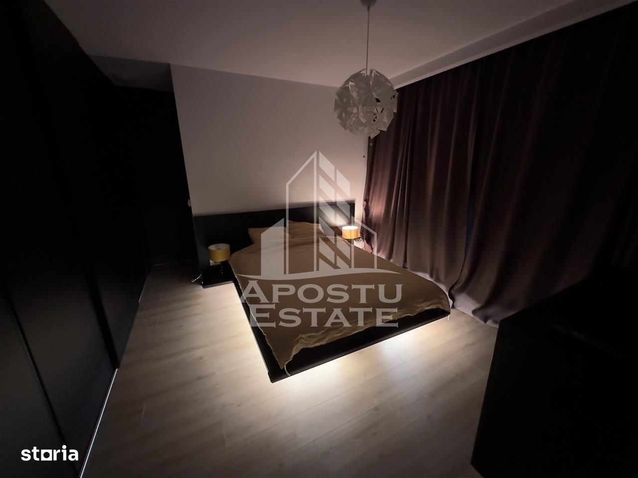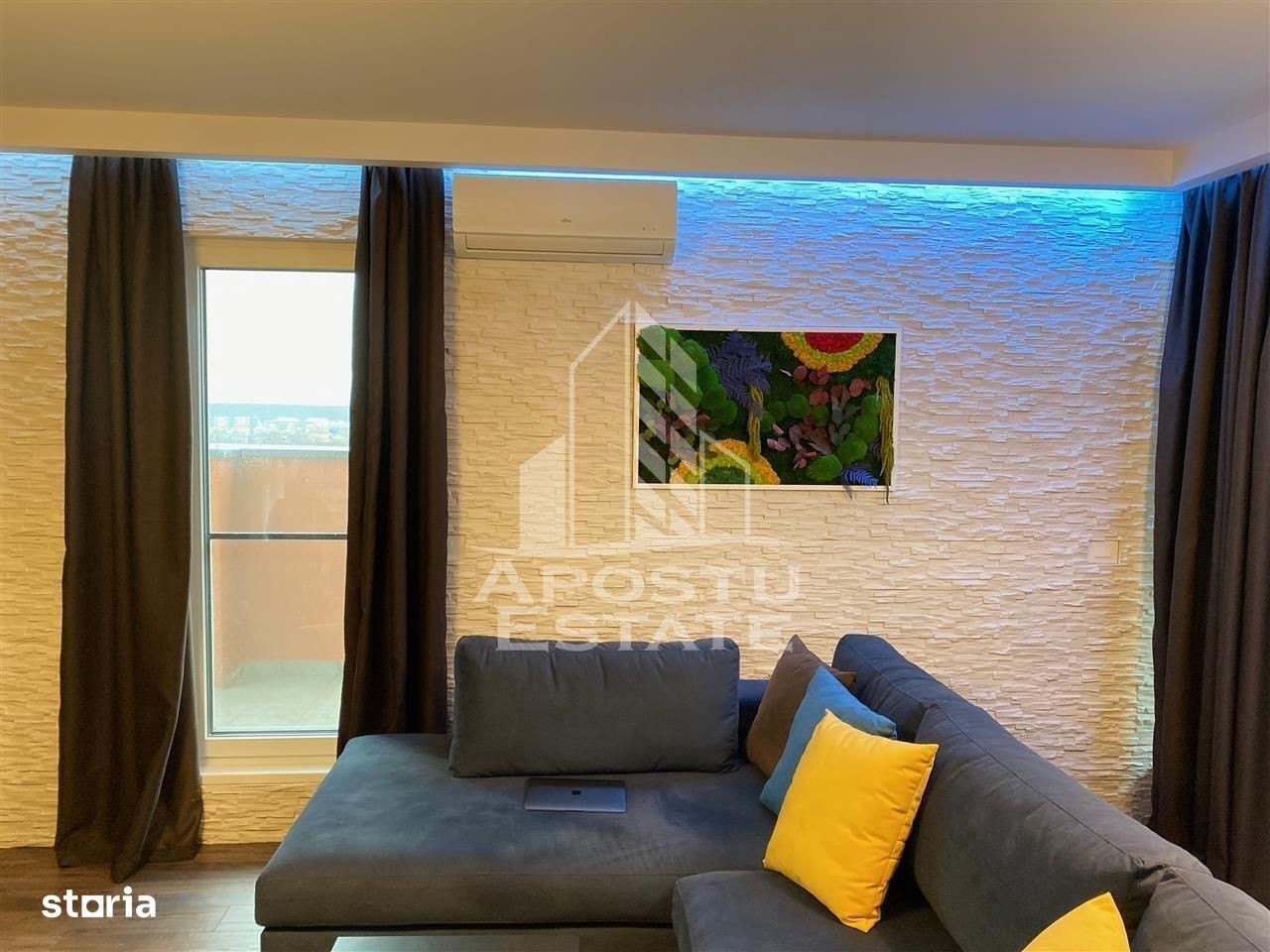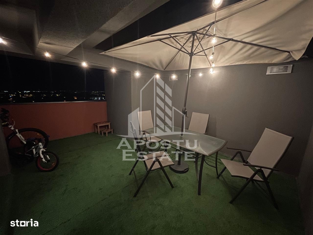 APOSTU ESTATE va ofera spre vanzare un apartament de tip penthouse premium situat in zona Calea Aradului, in apropierea British School. Proprietatea dispune de 2 camere spatioase, 2 bai moderne si o terasa spectaculoasa cu panorama asupra orasului. Apartamentul are o suprafata utila de 65 mp si beneficiaza de 35 mp de terase private, ideale pentru momente de relaxare, BBQ sau jacuzzi. Situat la etajul 11 al unui imobil modern construit in 2019, apartamentul ofera o priveliste impresionanta si se remarca prin finisaje si dotari de top. Confortul termic este asigurat de centrala proprie pe gaz, incalzire in pardoseala si doua aparate de aer conditionat. Bucataria este complet echipata Kuxa, cu electrocasnice premium: plita Bora Pure cu hota incorporata si evacuare in exterior, cuptor Bosch cu convectie, autocuratare catalitica si functie de microunde, frigider LG InstaView ThinkQ. Apartamentul dispune de alarma, tamplarie PVC cu geam tripan, usi interioare cu toc dublu si parchet de 10 mm. Se vinde complet mobilat si utilat, mobilierul fiind realizat la comanda din MDF de calitate superioara, iar coltarul este extensibil. In pret este inclus si un loc de parcare subteran. Blocul dispune de lift si este izolat exterior. Aceasta proprietate reprezinta o alegere excelenta pentru cei care isi doresc un stil de viata modern si confortabil, intr-o zona de top a orasului, cu acces facil la British School, magazine si mijloace de transport. Oferim consultanta bancara gratuita prin intermediul colaboratorilor nostri. Va asteptam cu drag la o vizionare! Disponibil imediat.