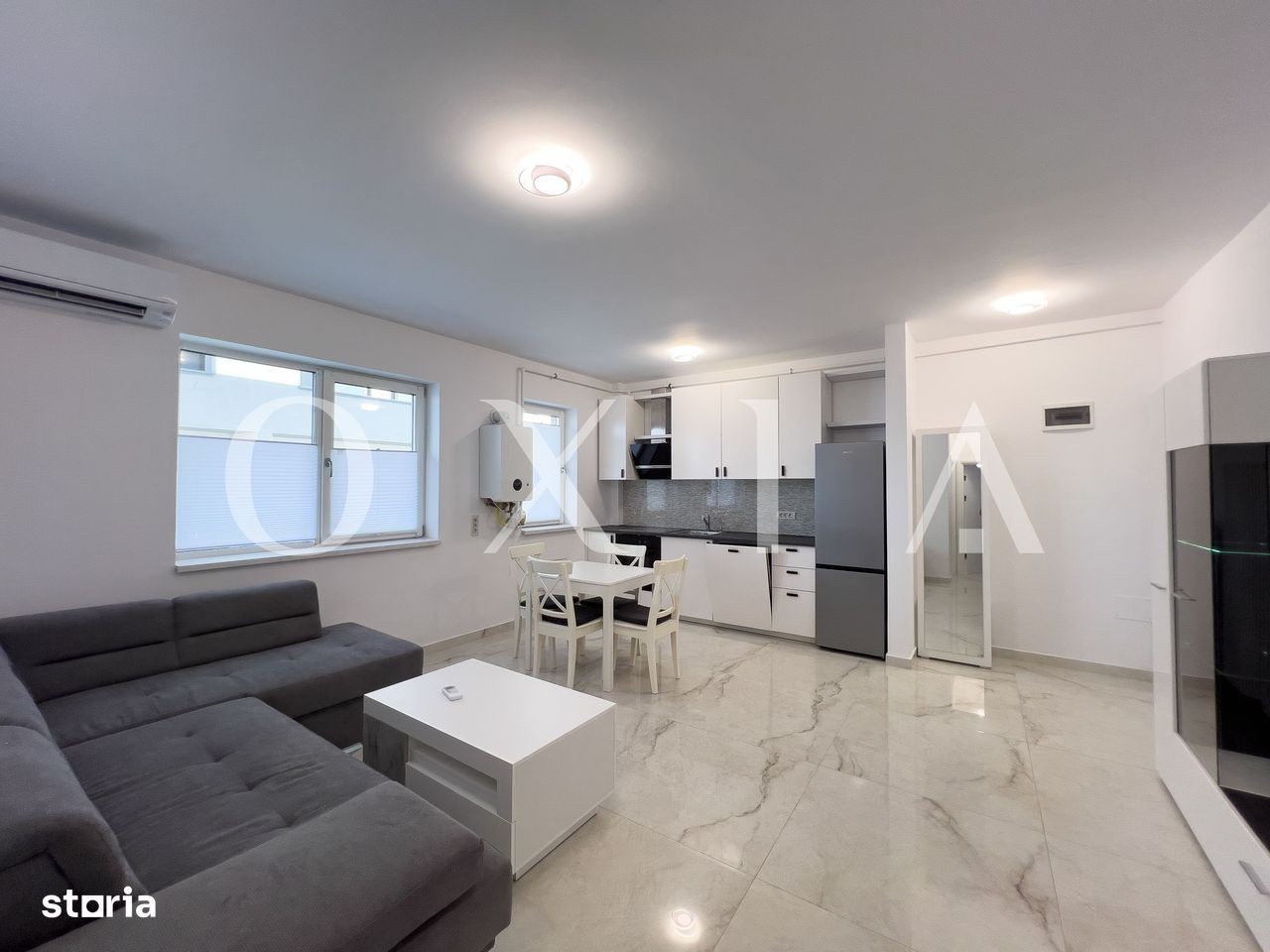 OXIA prezinta spre inchiriere apartament cu doua camere in Giroc, Bulevardul Sudului, situat la parterul unui imobil cu trei etaje, cu suprafata de 47 MP utili, compartimentat astfel: Hol de acces Living cu bucatarie open space Hol de tranzit Dormitor Baie cu cada si geam Apartamentul beneficiaza de amenjari moderne. Confortul termic este asigurat prin intermediul centralei proprii pe gaz cu incalzire in pardoseala si prin intermediul sistemului de climatizare. Proprietatea se inchiriaza mobilata si utilata conform prezentarii si este disponibila imediat. Dispune de un loc propriu de parcare situat in curtea imobilului. Disponibil din 1 Decembrie 2025. PRET: 400 EURO/Luna + GARANTIE + COMISION AGENTIE. Pentru mai multe detalii despre aceasta proprietate sau pentru stabilirea unei vizionari, ne puteti contacta la numarul de telefon