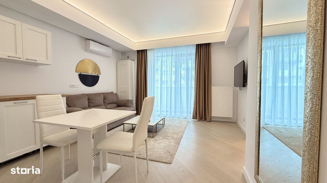 De inchiriat! Va propunem acest apartament elegant, cu doua camere aflat în Cortina North, un complex rezidențial inovator și sofisticat, construit în 2022 si amplasat în nordul capitalei. Proprietatea este situata la etajul 8/10 si are vedere catre pista de alergare. Apartamentul are suprafata de 40 mp utili la care se adauga un balcon de 5 mp. Este complet mobilat și echipat, având o compartimentare inteligentă a spațiilor. Dormitorul dispune de un dressing incapator, pe tot peretele, plus spatiu pentru depozitare sub pat. De asemenea este montat si un tv smart pe perete. Bucătăria este open space si este dotata cu plita prin inductie, cuptor, frigider incorporat, masina de spalat vase. Tot aici regasim si masina de spalat rufe care este incorporata in mobilier. Canapeaua este extensibila. Pe balcon proprietarul va achizitiona o masuta cu 2 scuane. Acest apartament îmbină confortul cu funcționalitatea. Toate finisajele sunt premium, parchetul este triplu stratificat, instalațiile sanitare sunt moderne, electrocasnicele de ultimă generație și mobilierul elegant se combină pentru a crea un mediu de viață de excepție. Încălzirea se realizeaza cu ajutorul centralei proprii, prin calorifere, avand la dispozitie un termostat cu ajutorul caruia puteti sa va setati temperatura dorita. De asemenea apartamentul dispune de aer conditionat atat in dormitor cat si in living. Apartamentul dispune și un loc de parcare suprateran inclus in pret. Complexul Cortina North pune accent pe siguranță, oferind acces controlat prin barieră și cu portar. Accesul se face direct din Bulevardul Pipera. Pentru confortul locatarilor a fost amenajat si sensul giratoriu care se afla fix in fata complexului. Cu o ofertă diversificată de facilități pentru relaxare și recreere, complexul Cortina North se distinge prin calitate și eleganță. Locuitorii se pot bucura in curand de un bazin de înot semiolimpic, un centru de fitness și wellness si o zonă comercială. In momentul de fata complexul dispune de o pistă de alergare și o grădină cu numeroase plante ornamentale. Este amplasat într-un cartier plin de viață, cu acces facil către numeroase facilități. La o distanță de numai 3-5 minute cu mașina, veți descoperi Parcul Herastrau, Promenada Mall, stația de metrou Aurel Vlaicu, școli de top, centrul de afaceri Pipera, o gamă diversificată de restaurante, bănci, farmacii și magazine. În plus, Complexul Cortina North se află la o aruncătură de băț de Pipera Plaza și de două magazine Lidl. Există, de asemenea, o stație de autobuz convenabil amplasată în imediata apropiere a complexului. Calitatea înaltă a construcției este evidentă în toate aspectele complexului Cortina North. Caracteristicile sale includ fațadă ventilată Swisspearl, tâmplărie din aluminiu Schuco, obiecte sanitare Daniel Rubinetterie, parcare subterană pe două niveluri plus parcare la suprafață, videointerfon si paza permanenta. Conditii de inchiriere: 1 luna de chirie + 1 luna de garantie Comisionul agentiei este 50% din costul chiriei. Disponibil imediat Se poate organiza si o vizionare online prin intermediul videoclipurilor detaliate. Pentru mai multe detalii sau pentru a programa o vizionare, nu ezitati să ma contactați.