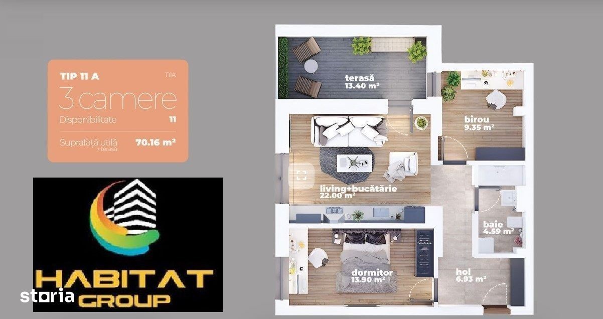Va oferim spre vânzare un apartament cu 3 camere semidecomandat, situat la etajul 6/11 al unui ansmablu nou, in zona Auchan 1 Decembrie, o zonă liniștită și cu multiple conexiuni la spatiile comerciale si mijloacele de transport. Locuința dispune de o suprafață totală de 70,16 mp (din care suprafata utila de 56,76 mp + balcon de 13,40 mp) si este branșată la toate utilitatile: canalizare, gaze naturale, curent electric, apa. Apartamentul se va preda echipat si utilat cu gresie, faianta, parchet laminat, usi interior, usa metalica securizata, centrala termica de bloc + calorifere de otel, instalatii termice si sanitare. In noul imobil (D+ P+11 etaje) veți descoperi 275 de unitati, proiectul contine garsoniere, apartamente cu doua, trei sau 4 camere cu diferite suprafete, compartimentari dar si orientari. Amplasat la o distanta de 14 minute fata de statia de metrou 1 Dcembrie 1918, in apropriere de supermarketuri Auchan, Mega Image, Lidl, Profi, Penny, gradinite, scoli, farmacii, spitale, spatii verzi si de agrement, confera confortul mult dorit pentru familia dumneavoastra. Pret: 112.000 Euro + TVA - pentru avans 95% la antecontract 115.500 Euro + TVA - pentru avans 55 % la antecontract. 119.000 Euro + TVA - pentru avans 15% la antecontract. Separat se poate achizitiona loc parcare subteran la pretul de 12.000 Euro + TVA. Pentru fiecare loc de parcare achiziționat împreună cu apartamentul, vă oferim o reducere suplimentară de 3.000 Euro pentru locul de parcare. Oferim asistenta gratuita in vederea intocmirii dosarului de creditare.Comision 0%. Imaginile sunt cu titlu de prezentare. Detalii si vizionari la numarul