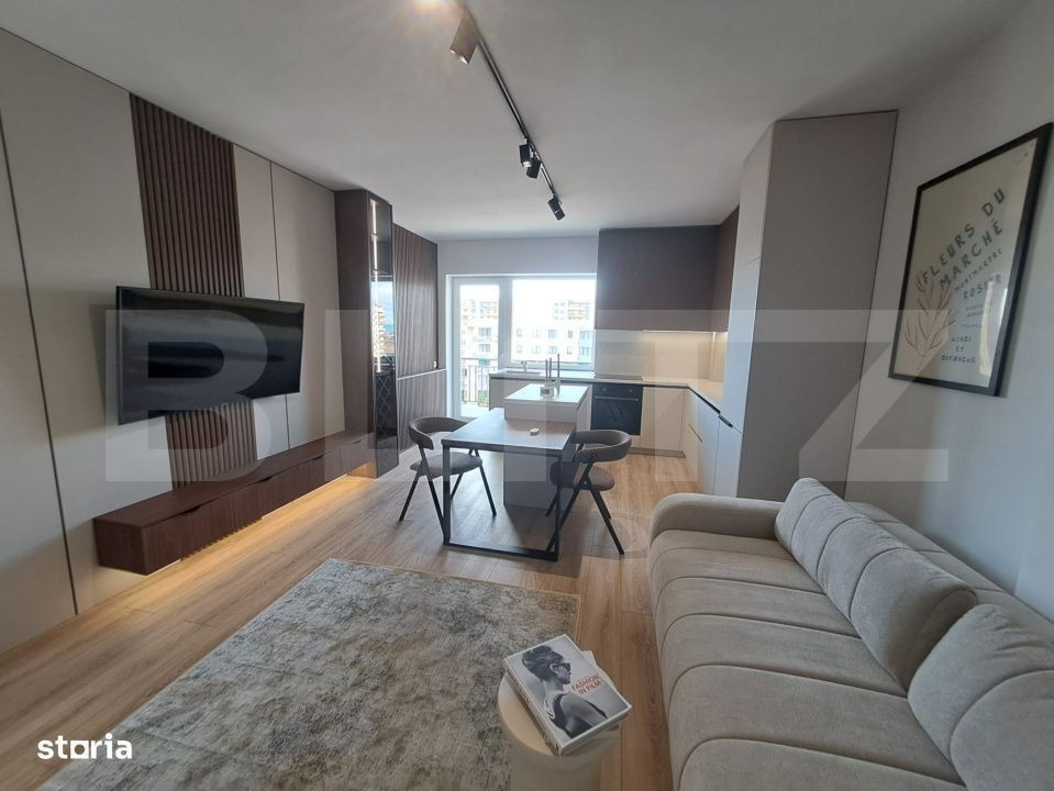 Blitz va propune un apartament luminos și elegant, situat într-un bloc nou, în complexul Ozone Residence, pe strada Ioan Popasu nr. 35, în cartierul Tractorul - una dintre cele mai apreciate zone din Brașov. Etaj: 4 din 4 (bloc cu lift) Apartament de 2 camere, decomandat. Suprafață totală: 55,7 mp (inclusiv balconul) Compartimentare : Living spațios și bucătărie open space - acces balcon Dormitor - acces balcon Hol Baie Balcon cu acces atât din living, cât și din dormitor Apartamentul se vinde complet mobilat și utilat, fiind gata pentru mutare imediată. Nu s-a locuit niciodată - totul este nou, gândit cu atenție până la cel mai mic detaliu și amenajat cu materiale și finisaje premium, pentru un plus de confort și eleganță. Dotări și finisaje: Mobilier modern, realizat pe comandă; Bucătărie complet echipată: frigider incorporat, cuptor, plită, hotă, mașină de spălat vase, coș de gunoi extractabil, jolly și organizator pentru tacâmuri; Televizoare în ambele camere; Mașină de spălat rufe în baie (urmează montarea unui corp de mobilier deasupra acesteia); Sistem tip pliseu la geamurile din bucătărie (urmează să fie montat, pentru mai multă intimitate); Balcon generos, cu acces dublu; Geamuri mari, ce oferă multă lumină naturală pe tot parcursul zilei; Loc de parcare suprateran acoperit - disponibil opțional, la prețul de 12.000 EUR. Blocul este nou, dotat cu lift, construit cu materiale de calitate, într-o zonă liniștită și foarte bine conectată: aproape de Coresi Mall, supermarketuri, școli și mijloace de transport. Preț apartament: 157.000 EUR Ideal pentru locuire personală sau investiție (închiriere imediată). Va invit la vizionare!