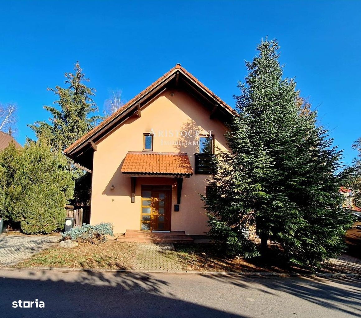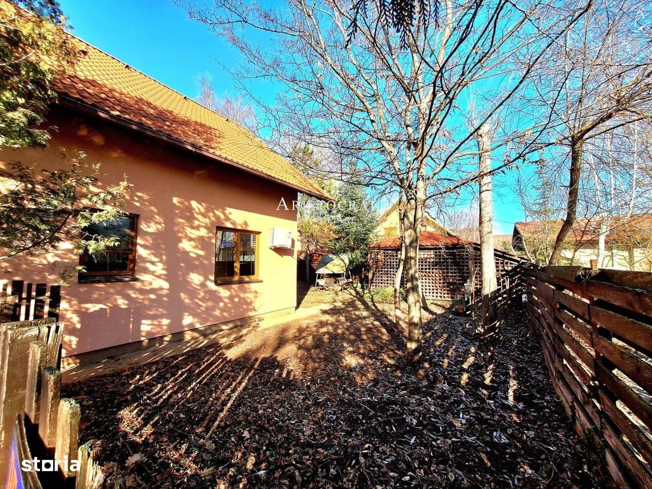 Oferim spre vanzare vila individuala in ansamblu rezidential select din Corbeanca, cu regim de inaltime P M, cu structura de lemn, constr. 2004, supr. totala : 150mp, supr. utila : 130mp, supr. teren : 350mp, amprenta sol: 68mp. Proprietatea, compusa din 4 camere, 3 dormitoare, 2 bai, semimobilata si utilata, este compartimentata astfel: - parter: vestibul, living cu zona de dining si acces in gradina, bucatarie open space si camera tehnica, grup sanitar. - etaj: hol, 3 camere, baie, acces in spatiul de depozitare din pod prin chepeng. Vila este racordata la toate utilitatile publice: electricitate, gaze, canalizare, apa si este dotata cu: aer conditionat, centrala termica. Imobilul beneficiaza de toate facilitatile complexului rezidential, de confortul, siguranta si avantajele oferite rezidentilor sai: multiple locuri de joaca, terenuri de tenis si fotbal, sala de fitness, aerobic si spa, asociatie de locatari, paza 24hsi videomonitorizare, acces cu bariera, cabinet stomatologic, cabinet veterinar, restaurant- pizzerie, piscina, gradinita, scoala primara. Imobilul are acces facil catre zone comerciale, supermarket, scoli, gradinite si mijloace de transport in comun.