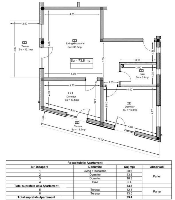 Apartamente de vânzare Cu CF-uri disponibile Poziționate în blocuri noi Cele cu grădină sunt poziționate în vilã Nr. camere: 2 sau 3 Stadiul: noi, finisate Locație: Florești Zona: Tăuțiului Apartamentele beneficiază de: - tâmplărie cu profil format din 3 foi de sticlă si 5 camere BARIER REHAU, - incalzire in pardoseala cu centrala proprie SAUNIER DUVAL, - gresie si faianta CESAROM / import, - ușă de exterior antiefractie MEGA DOORS, - uși de interior albe PORTA DOORS, - instalatii electrice cu prize si intrerupatoare, - instalatii sanitare trase la pozitie si obiecte sanitare, - parchet EGGER, - lift Facilități ale ansamblului: - Apartamente spațioase, cu 2 și 3 camere - Finisaje de calitate superioară - Balcoane generoase - Parcări supraterane și subterane securizate - Spații verzi și spații de relaxare - Securitate 24/7: supraveghere video la fiecare bloc - În apropiere: - parcul Poligon, - pădure, - mijloace de transport, - școli, - grădinițe, - centre comerciale, - două drumuri de acces înspre Cluj-Napoca și viitorul spital regional (centura de sud a Floreștiului și drumul principal) - Posibilitate achiziționare parcare exterioară (5500/6000 €) sau garaj (7500/8000 €). Lista cu apartamentele de pe Tăuțiului: 1. Ap cu 2 camere: - Etaj: 3 - Suprafață utilă: 51.58 mp - Suprafață terasă: 13,28 mp - Stadiul: nou, finisat - PREȚ: 120 000 EURO, negociabil (2350 €/mp) 2. Ap cu 2 camere și grădină: - Etaj: parter - Suprafață utilă: 43,6 mp - Suprafață grădină: 76 mp (include terasa) - Suprafață terasă: 9,9 mp - Stadiul: nou, finisat - PREȚ: 125 000 EURO, negociabil (2500 €/mp) 3. Ap cu 2 camere: - Etaj: 1 - Suprafață utilă: 53,4 mp - Suprafață terasă: 5,8 mp - Stadiul: nou, finisat - PREȚ: 130 000 EURO, negociabil (2400 €/mp) 4. Ap cu 2 camere: - Etaj: 2 - Suprafață utilă: 57 mp - Suprafață terasă: 6,49 mp - Stadiul: nou, finisat - PREȚ: 135 000 EURO, negociabil (2400 €/mp) 5. Ap cu 3 camere: - Etaj: parter - Suprafață utilă: 69,66 mp - Stadiul: nou, finisat - PREȚ: 146 000 EURO, negociabil (2100 €/mp) 6. Ap cu 3 camere: - Etaj: 1 - Suprafață utilă: 72,3 mp - Suprafață terasă: 6,2 mp - Stadiul: nou, finisat - PREȚ: 160 000 EURO, negociabil (2200 €/mp) 7. Ap cu 3 camere și grădină: - Etaj: parter - Suprafață utilă: 73,7 mp - Suprafață grădină: 62 mp (include terasele) - Suprafață terase: 12,1 mp + 13,5 mp - Stadiul: nou, finisat - PREȚ: 165 000 EURO, negociabil (2000 €/mp) COMISION: 2% din prețul de vanzare TELEFON: 07********84 Pentru programarea unei vizionări sau pentru alte detalii nu ezitați să contactați nr. de telefon afișat!