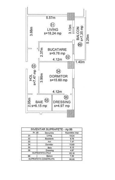Oferim spre vanzare un apartament, confort 1, decomandat, la etajul 7, intr-un bloc cu 2 lifturi construit in anul 2015, compus din living, bucatarie, dormitor, baie, hol, balcon, dressing, in suprafata utila de 62 mp + balcon de 7 mp. Imobilul este la stadiul de alb, asa cum reiese din poze, situat in Sibiu, zona Mihai Viteazu - Lidl, aproape Piata Rahovei, magazinele Lidl, Dedeman, statii de autobuz. Pretul este 79.000 euro (TVA 21% inclus in pret)