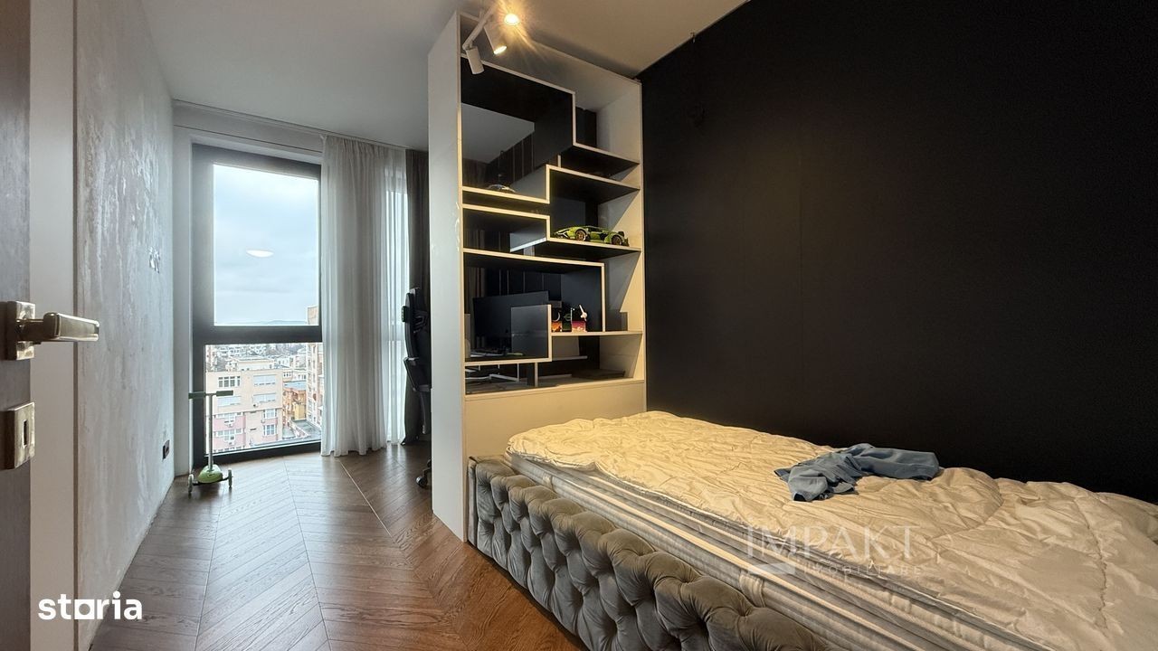 Va prezentam spre vanzare un apartament de exceptie, situat intr-un bloc care reprezinta un reper architectural al orasului Cluj-Napoca. Un astfel de apartament este o oportunitate extrem de rara in piata. Acesta este localizat foarte bine din punct de vedere strategic, in cartierul Gheorgheni, oferind acces facil catre centrul orasului si catre cartierele care se invecineaza cu Gheorgheniul, precum Marasti, Andrei Muresanu si cartierul Intre Lacuri. Practic, este pozitionat excelent pentru a ajunge rapid in toate zonele de interes ale orasului. Blocul in care se afla apartamentul este construit la standarde inalte, cu fatade ventilate si o executie de exceptie, fiind unul dintre cele mai ravnite imobile din Cluj-Napoca. Apartamentul este orientat in spre sud vest si este situat la etajul 7, din 7 plus retras, si are o suprafata utila de 134.7 mp la care se mai adauga si doua balcoane cu o suprafata cumulata de 24.5mp. De cum intram in apartament, ne intampina zona de zi, compusa din living si zona de dining, spatioasa si luminoasa, cu acces intr-un balcon acoperit din constructie. Bucataria este separata, iar daca se doreste, poate fi inchisa complet. In partea dreapta se intra intr-un hol unde se regasesc doua spatii generoase de depozitare, ideale pentru masina de spalat si uscator, urmate de baia de serviciu. Dintr-un al doilea hol se face accesul catre o alta baie dotata cu cada si spre cele trei dormitoare, dintre care dormitorul matrimonial beneficiaza de baie proprie, dressing si acces intr-un al doilea balcon, acoperit din constructie. Celelalte doua dormitoare sunt spatioase, iar apartamentul dispune de numeroase spatii de depozitare ingenios integrate. Apartamentul se vinde complet mobilat si utilat, exact ca in fotografiile de prezentare, cu exceptia obiectelor personale. Bucataria este mobilata si echipata cu electrocasnice incorporate, iar incalzirea se face prin pardoseala, cu centrala de imobil. Finisajele sunt premium, realizate cu materiale de cea mai buna calitate. Pardoselile sunt placate cu marmura si cu parchet din lemn masiv, iar apartamentul este dotat cu geamuri Tripan cu protectie UV, care asigura confort termic si fonic ridicat. De asemenea, beneficiaza de sistem E-Smart pentru controlul functiilor inteligente de la distanta. In pret sunt incluse doua locuri de parcare subterane. Un apartament ultrafinisat, intr-un imobil exclusivist, ideal pentru cei care apreciaza confortul, calitatea si atentia la detalii. Pentru mai multe informatii sau pentru a programa o vizionare, nu ezitati sa ne contactati.