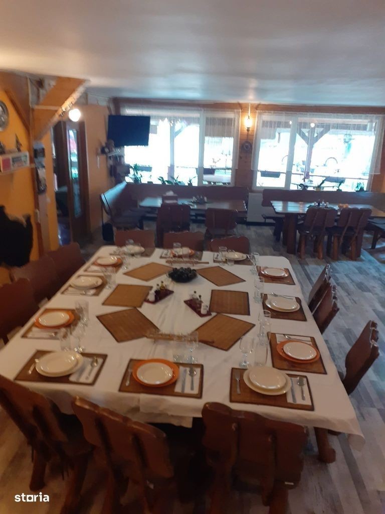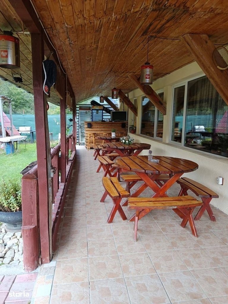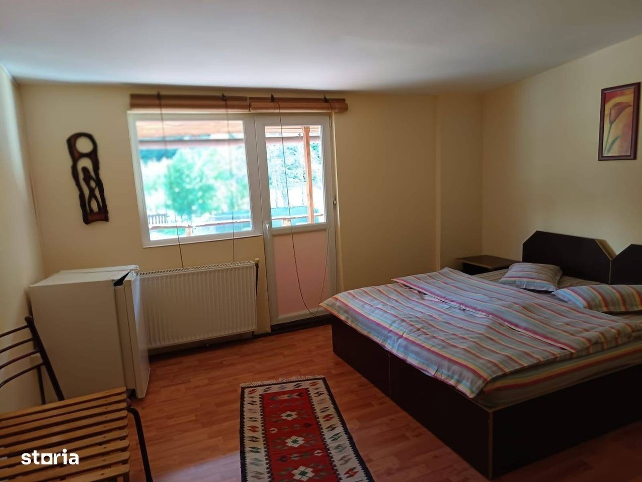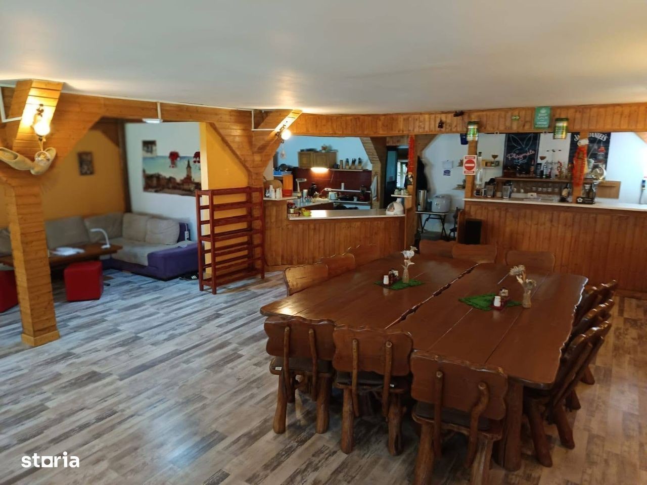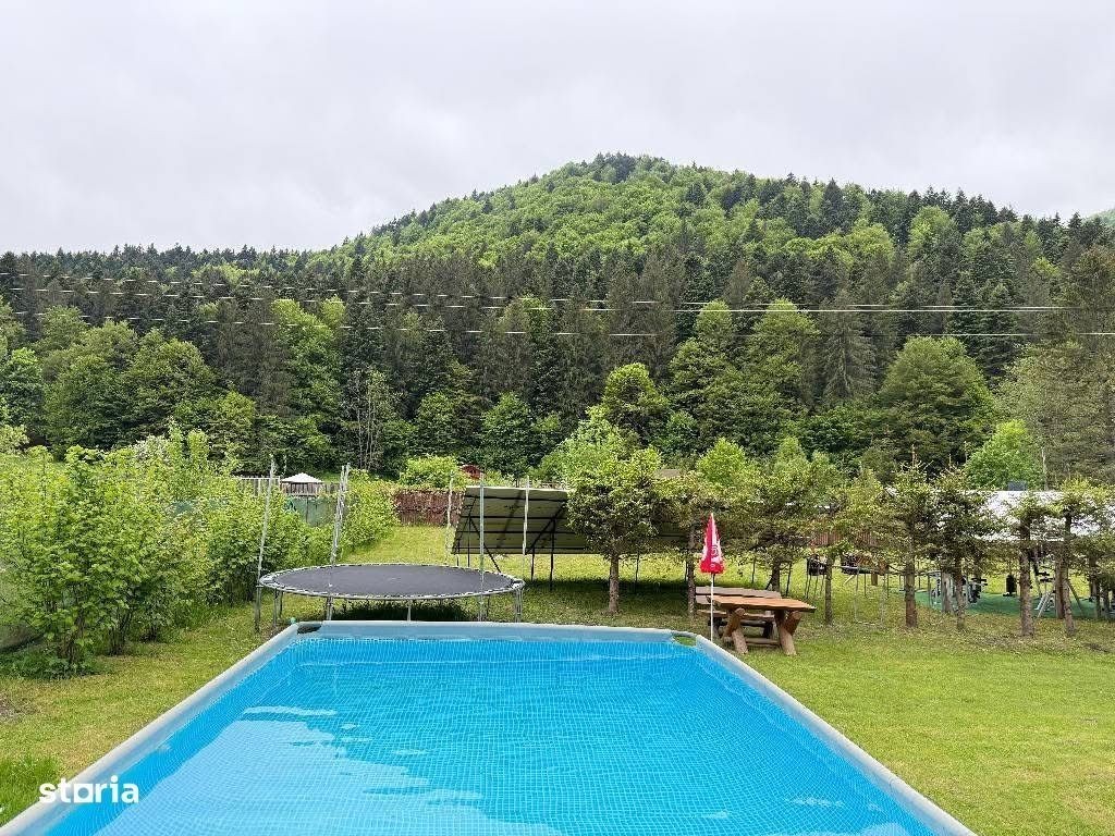 Casa cu vedere spre munte, living, 6 camere cu bai proprii aflate la etaj si 2 camere la parter, camera tehnica, plus anexe. Amprenta la sol 257 mp, parter + mansarda, intabulata, teren 3800 mp trecut ca teren intravilan de constructii.