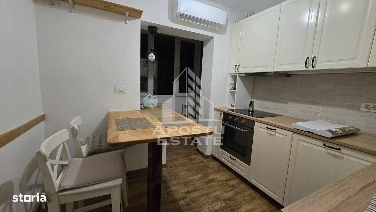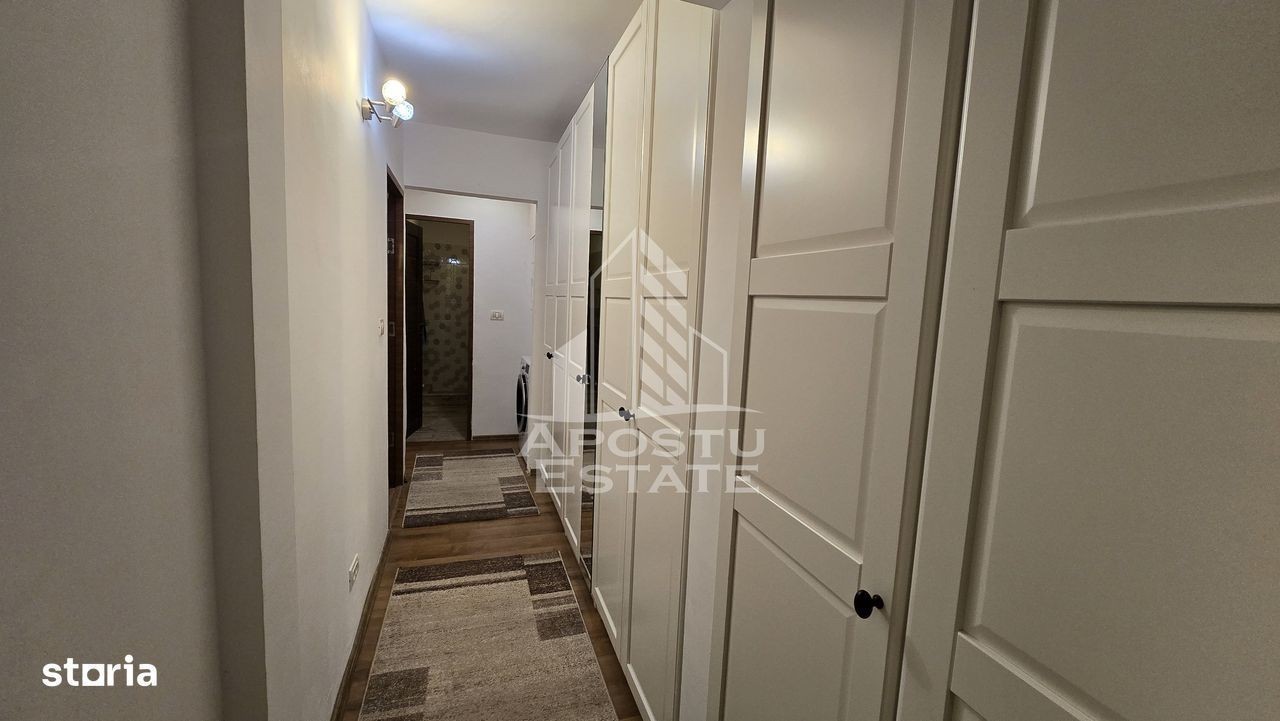 APOSTU ESTATE va ofera spre inchiriere un apartament cu 3 camere si 2 bai, complet renovat, situat in zona Torontalului. Zona este linistita, apartamentul aflandu-se la cateva minute fata de parc, market, statie de autobuz sau fata de scoala. Apartamentul este situat la etajul 2 din 4 al unui bloc ce este izolat exterior, are o suprafata utila de 66 mp, este decomandat si compartimentat astfel: - hol de acces - living spatios - bucatarie mobilata si utilata cu balcon - hol principal cu dressing spatios pe comanda - baie de serviciu - dormitor mic ( la alegere o sa fie mobilat cu birou si scaun sau cu o canapea extensibila ) - baie principala prevazuta cu dus - dormitor matrimonial Confortul termic este realizat prin centrala proprie, dar si prin intermediul aparatului de aer conditionat. Apartamentul este disponibil incepand cu 8 decembrie. Disponibil imediat! Va asteptam cu drag la o vizionare chiar astazi!