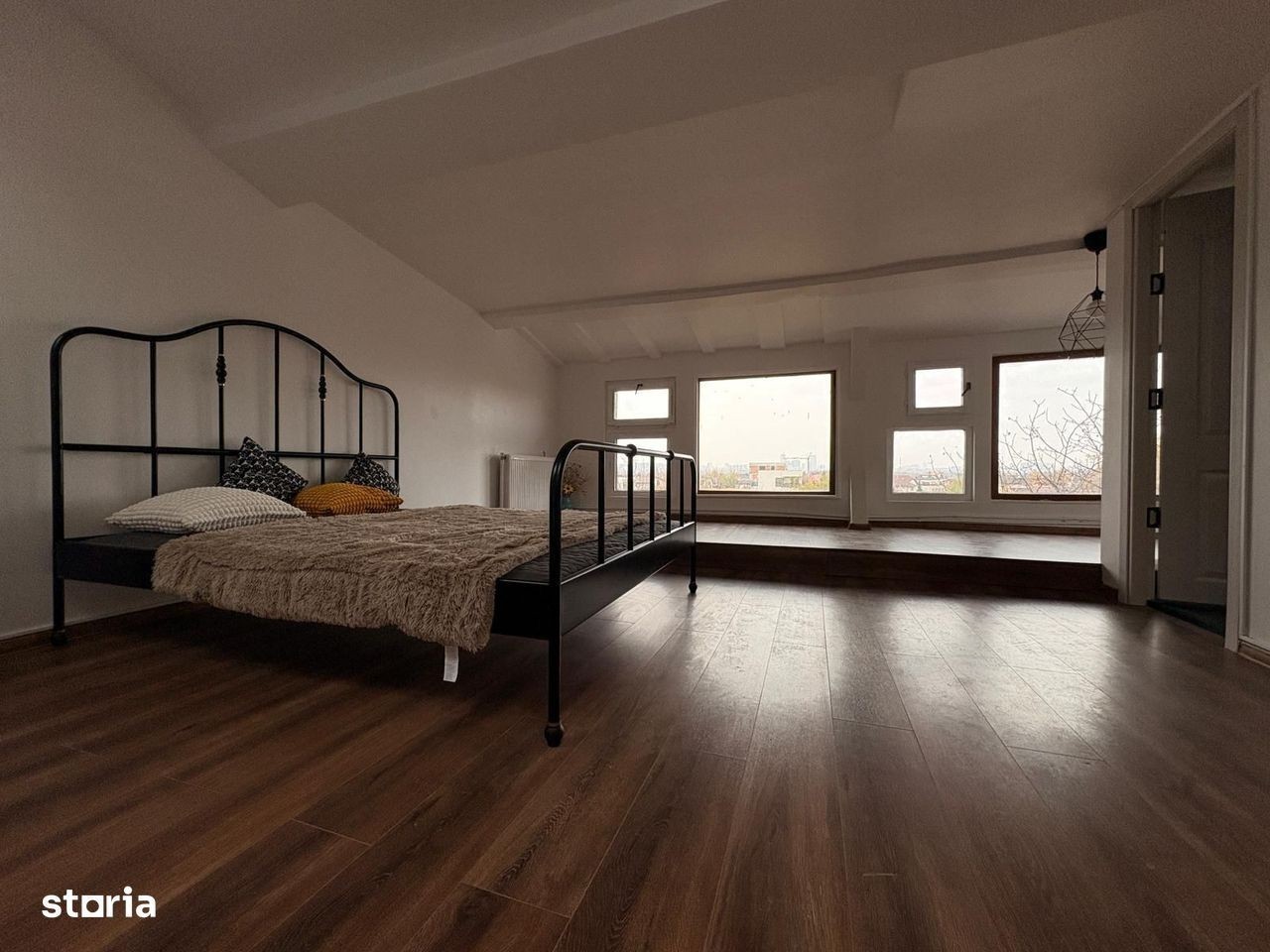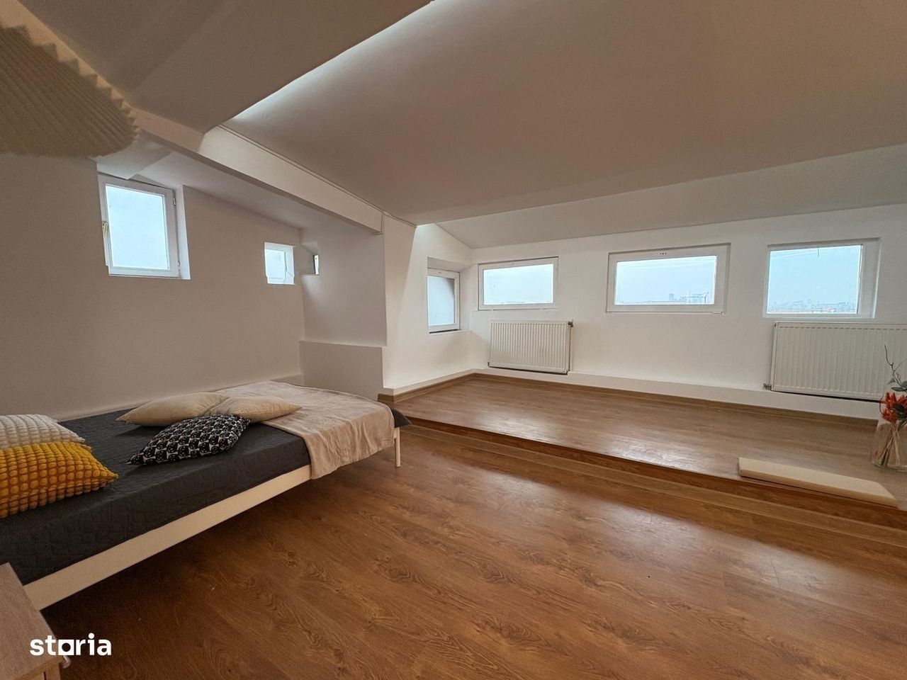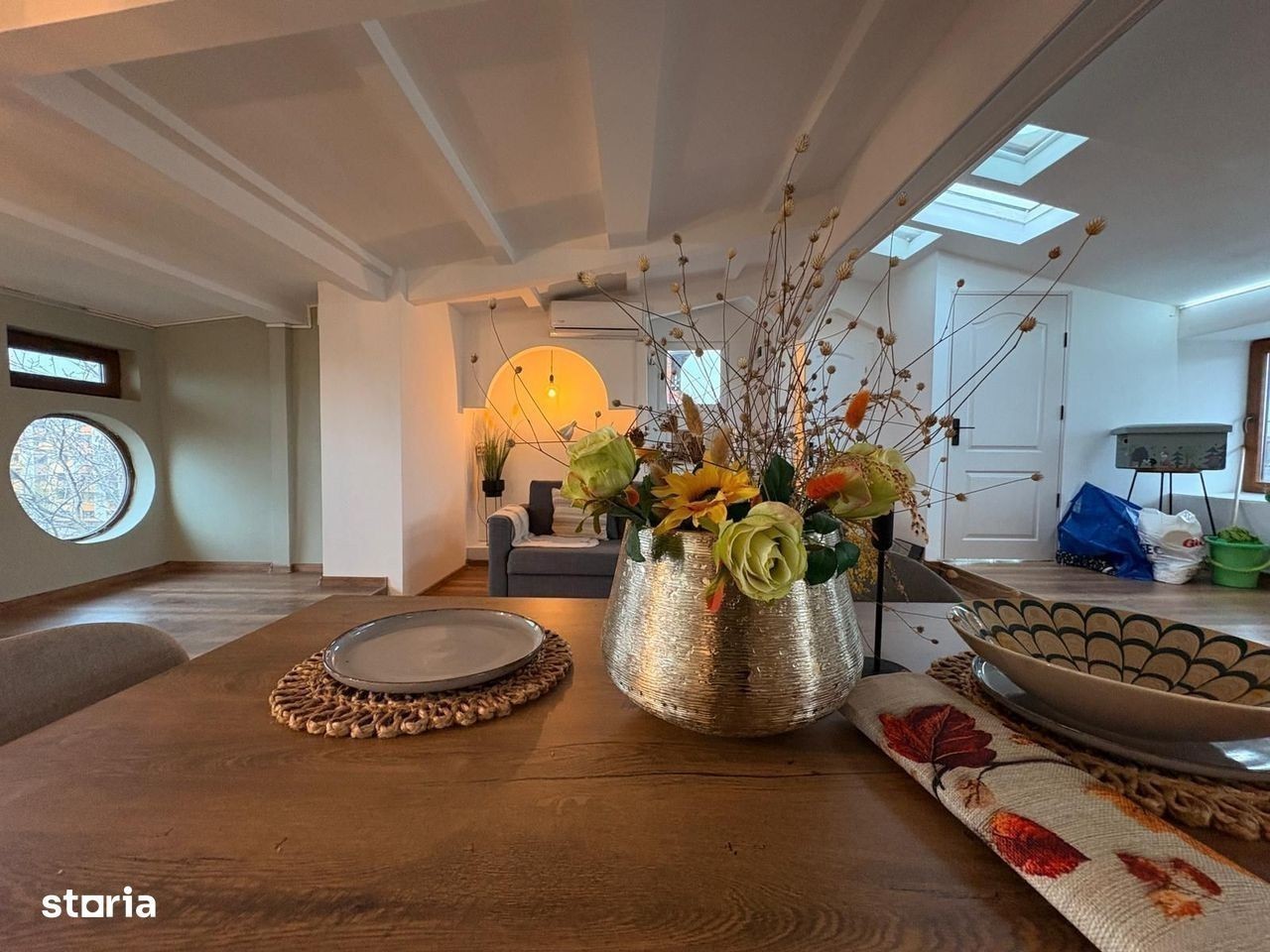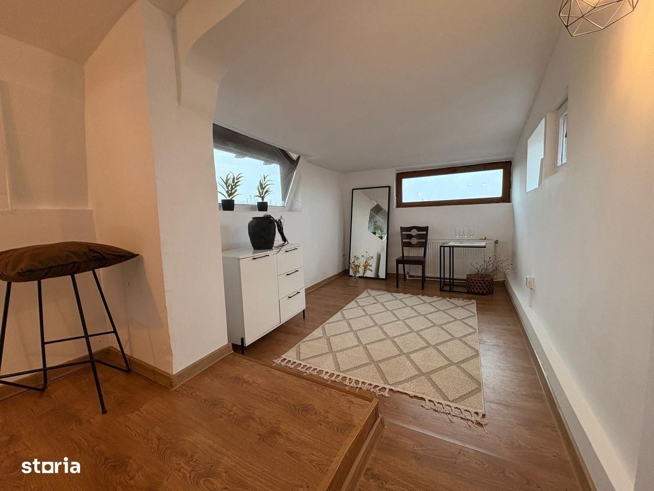 Vă prezentăm un apartament cu totul special, singur pe etaj, situat la mansarda unui imobil tip vilă (P+3+M), fără lift, construită în anul 2007. Acest apartament se remarcă prin atmosfera luminoasă și elegantă, potențată de geamurile Velux amplasate în tavan, care aduc un plus remarcabil de lumină naturală și devin, totodată, un element de design spectaculos. Vederile panoramice, înălțimile generoase și compartimentarea inteligentă fac din acest apartament un spațiu perfect pentru un arhitect de design interior sau pentru oricine are o viziune creativă, gata să transforme un loc deja frumos într-un cămin cu adevărat spectaculos. Prețul apartamentului este negociabil la vizionare. Descrierea apartamentului: Apartamentul este complet mobilat și utilat și se remarcă prin următoarele: -Living generos cu bucătărie deschisă, foarte luminos, prevăzut cu o baie de serviciu. -Dormitor matrimonial spațios, cu baie proprie cu geam, cadă cu vedere panoramică, dar și cabină de duș. -Dormitor secundar de 20 mp, generos, cu opțiuni de amplasare unor spații de depozitare încăpătoare. -Dormitor de 11 mp, ideal ca birou, cameră pentru copil, dressing-room sau hobby room, situat alături de cel secundar; aceste două dormitoare au acces facil la o baie cu cadă, amplasată chiar în fața lor, pe hol, funcțională și ușor accesibilă. -Apartamentul este zugrăvit, curat și dispune de benzi LED de design integrate în zonele principale. -Vedere panoramică spectaculoasă, specifică unei mansarde înalte și bine compartimentate. Unul dintre marile avantaje ale acestui apartament este calitatea izolării -Podea din placă de beton cu izolație din polistiren extrudat. -Acoperiș pe structură, din tablă, izolat cu vată bazaltică, apoi finisat cu rigips. -Folie reflexivă instalată sub învelitoare, pentru confort termic excelent în sezonul cald. Aceste detalii asigură un randament termic foarte bun și un nivel ridicat de confort pe tot parcursul anului. Utilități și facilități: -Centrală proprie pe gaz și calorifere. -Aer condiționat. -Parcare în curtea închisă a imobilului. -Clădire cu puțini vecini, atmosferă intimă și civilizată. Ce îl face special? Apartamentul este deja frumos și îngrijit, dar are un potențial extraordinar pentru cineva cu un simț estetic rafinat. Spațiile, lumina, înălțimea și compartimentarea oferă locul perfect pentru un proiect de design interior spectaculos. Pentru mai multe detalii sau pentru a programa o vizionare, nu ezitați să ne contactați!
