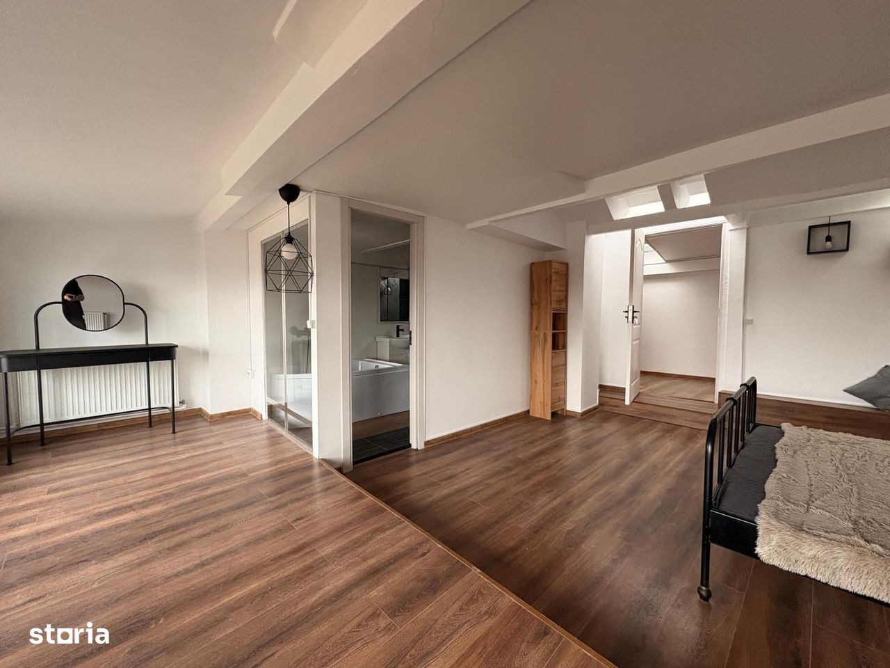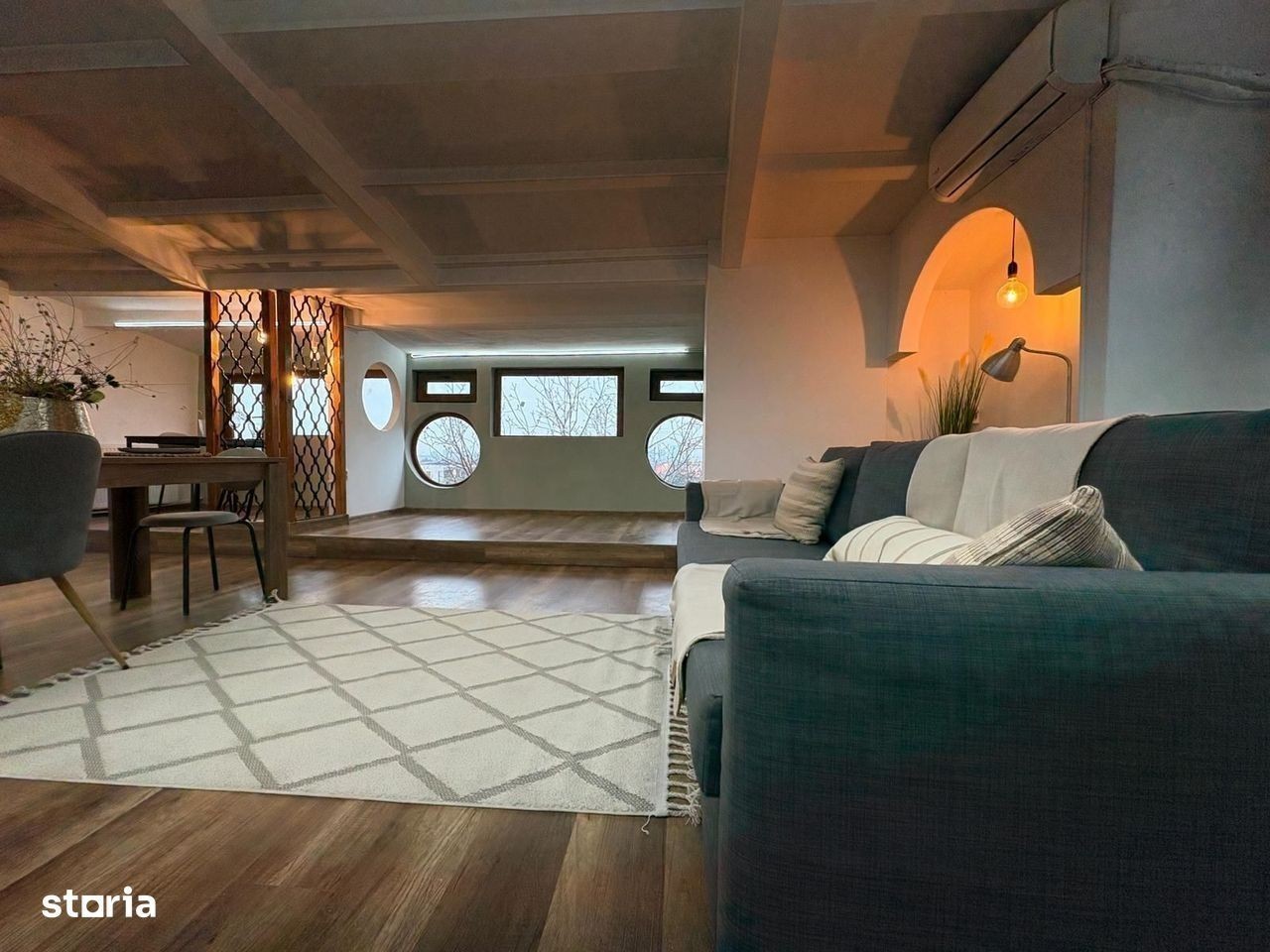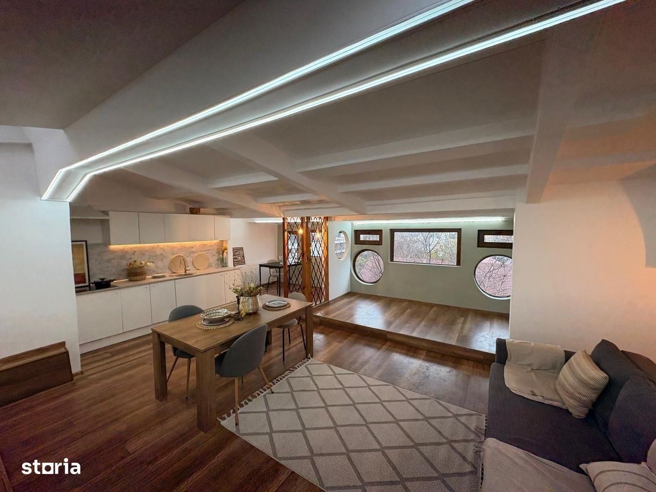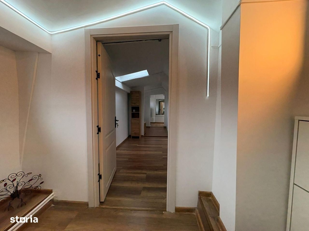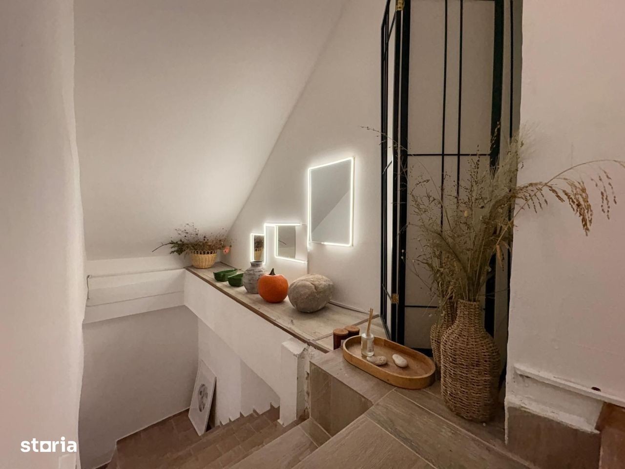 Vă prezentăm un apartament cu totul special, singur pe etaj, situat la mansarda unui imobil tip vilă (P+3+M), fără lift, construită în anul 2007. Acest apartament se remarcă prin atmosfera luminoasă și elegantă, potențată de geamurile Velux amplasate în tavan, care aduc un plus remarcabil de lumină naturală și devin, totodată, un element de design spectaculos. Vederile panoramice, înălțimile generoase și compartimentarea inteligentă fac din acest apartament un spațiu perfect pentru un arhitect de design interior sau pentru oricine are o viziune creativă, gata să transforme un loc deja frumos într-un cămin cu adevărat spectaculos. Prețul apartamentului este negociabil la vizionare. Descrierea apartamentului: Apartamentul este complet mobilat și utilat și se remarcă prin următoarele: -Living generos cu bucătărie deschisă, foarte luminos, prevăzut cu o baie de serviciu. -Dormitor matrimonial spațios, cu baie proprie cu geam, cadă cu vedere panoramică, dar și cabină de duș. -Dormitor secundar de 20 mp, generos, cu opțiuni de amplasare unor spații de depozitare încăpătoare. -Dormitor de 11 mp, ideal ca birou, cameră pentru copil, dressing-room sau hobby room, situat alături de cel secundar; aceste două dormitoare au acces facil la o baie cu cadă, amplasată chiar în fața lor, pe hol, funcțională și ușor accesibilă. -Apartamentul este zugrăvit, curat și dispune de benzi LED de design integrate în zonele principale. -Vedere panoramică spectaculoasă, specifică unei mansarde înalte și bine compartimentate. Unul dintre marile avantaje ale acestui apartament este calitatea izolării -Podea din placă de beton cu izolație din polistiren extrudat. -Acoperiș pe structură, din tablă, izolat cu vată bazaltică, apoi finisat cu rigips. -Folie reflexivă instalată sub învelitoare, pentru confort termic excelent în sezonul cald. Aceste detalii asigură un randament termic foarte bun și un nivel ridicat de confort pe tot parcursul anului. Utilități și facilități: -Centrală proprie pe gaz și calorifere. -Aer condiționat. -Parcare în curtea închisă a imobilului. -Clădire cu puțini vecini, atmosferă intimă și civilizată. Ce îl face special? Apartamentul este deja frumos și îngrijit, dar are un potențial extraordinar pentru cineva cu un simț estetic rafinat. Spațiile, lumina, înălțimea și compartimentarea oferă locul perfect pentru un proiect de design interior spectaculos. Pentru mai multe detalii sau pentru a programa o vizionare, nu ezitați să ne contactați!