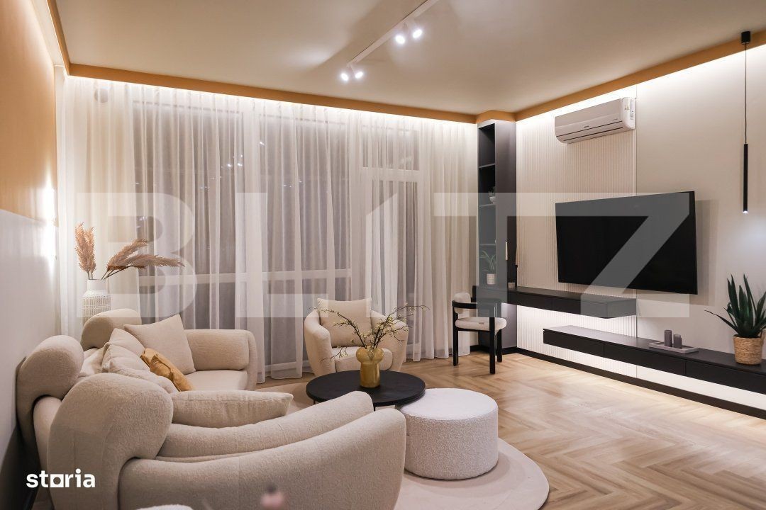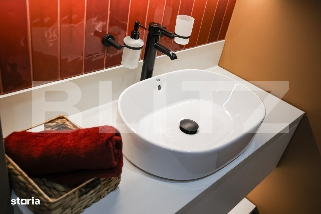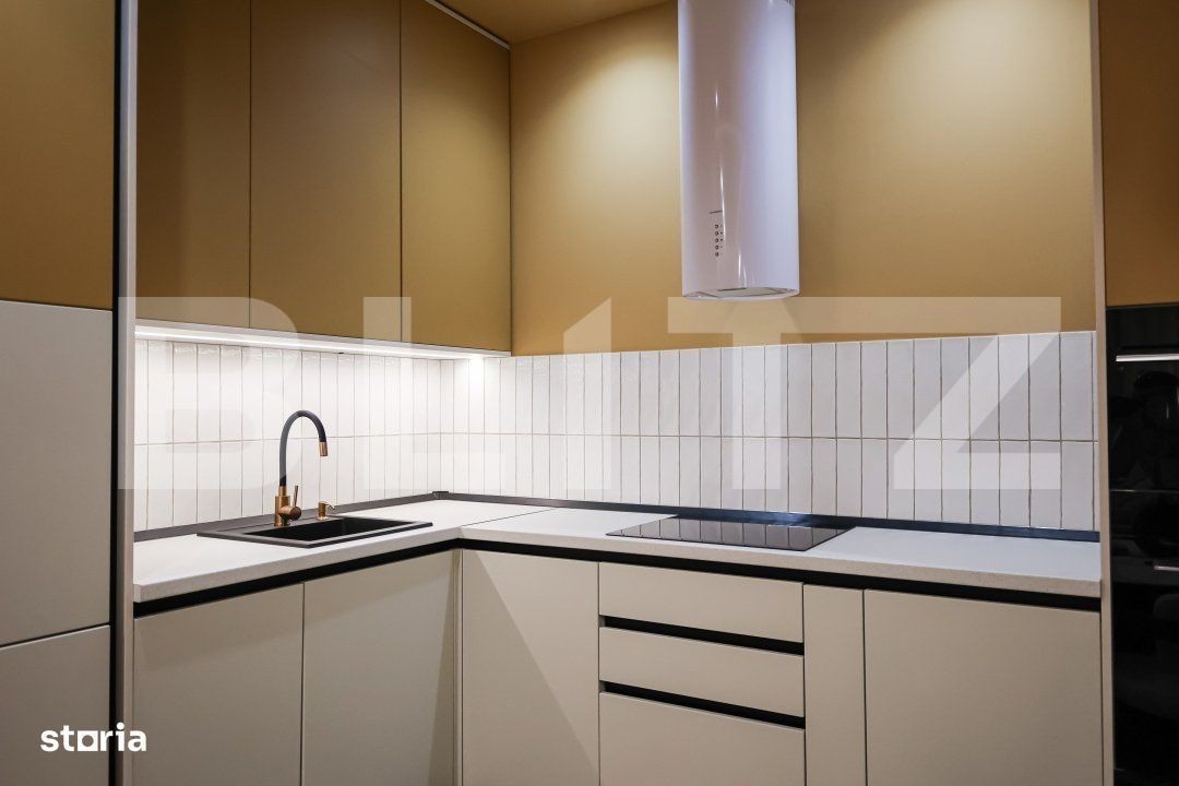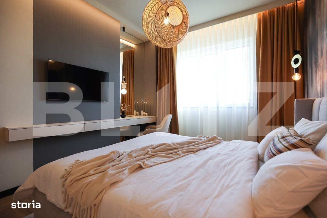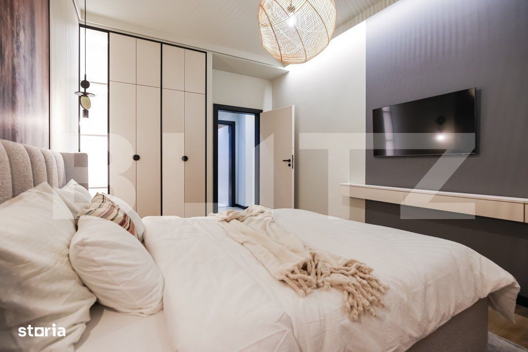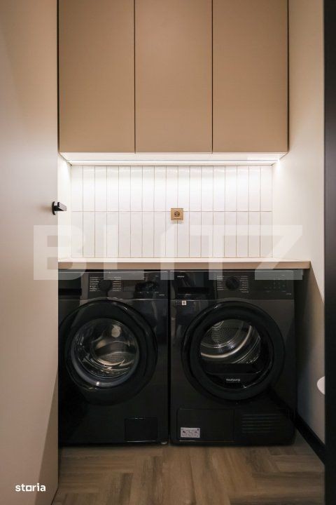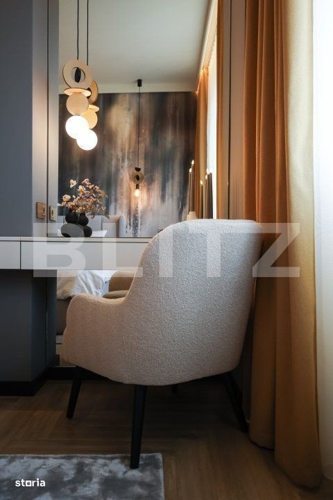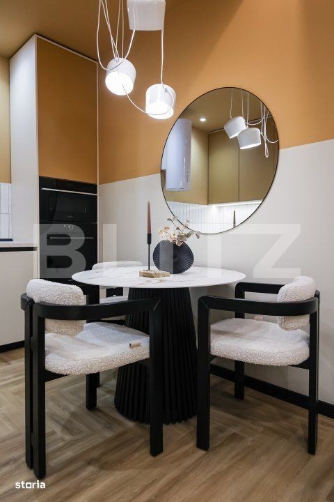 Blitz vă propune spre vânzare un apartament cu 2 camere, amenajat ultra-lux, situat în ansamblul rezidențial Concept 9, unul dintre cele mai moderne și apreciate proiecte imobiliare. Apartamentul este finisat la cele mai înalte standarde, fiind alegerea ideală pentru cei care își doresc un cămin elegant, confortabil și practic. Locuința se remarcă printr-un design atent gândit, care îmbină perfect utilul cu plăcutul. Este un spațiu în care te vei regăsi cu ușurință - primitor, modern și complet funcțional. Proprietarii au investit în detalii de calitate superioară, pentru a oferi un confort desăvârșit. Compartimentare: -Living open-space cu bucătăria, cu acces direct pe balcon -Dormitor spațios -Baie modernă -Spațiu tehnic dedicat mașinii de spălat și uscătorului Dotări și finisaje: -Mașină de spălat rufe Samsung -Uscător de rufe Samsung -Hota Klarstein Barella, cu putere de extracție de 518 m³/h, cuptor Klarstein, cuptor cu microunde Whirlpool -Plită electrică -Încălzire în pardoseală (prin centrala imobilului) -Calorifer tip prosop în baie -Obiecte sanitare Roca -Geamuri tripan de calitate superioară -Uși interioare Porta Doors -Parchet SPC Herringbone Revenga -Sistem de iluminat LED modern -Aer condiționat în living -Termostat de perete Apartamentul se vinde complet mobilat și utilat, exact cum se vede în poze - totul este nou, de calitate și perfect funcțional, bonus in acest pret este si o parcare subterana. Contactează-ne astăzi pentru a programa o vizionare!
