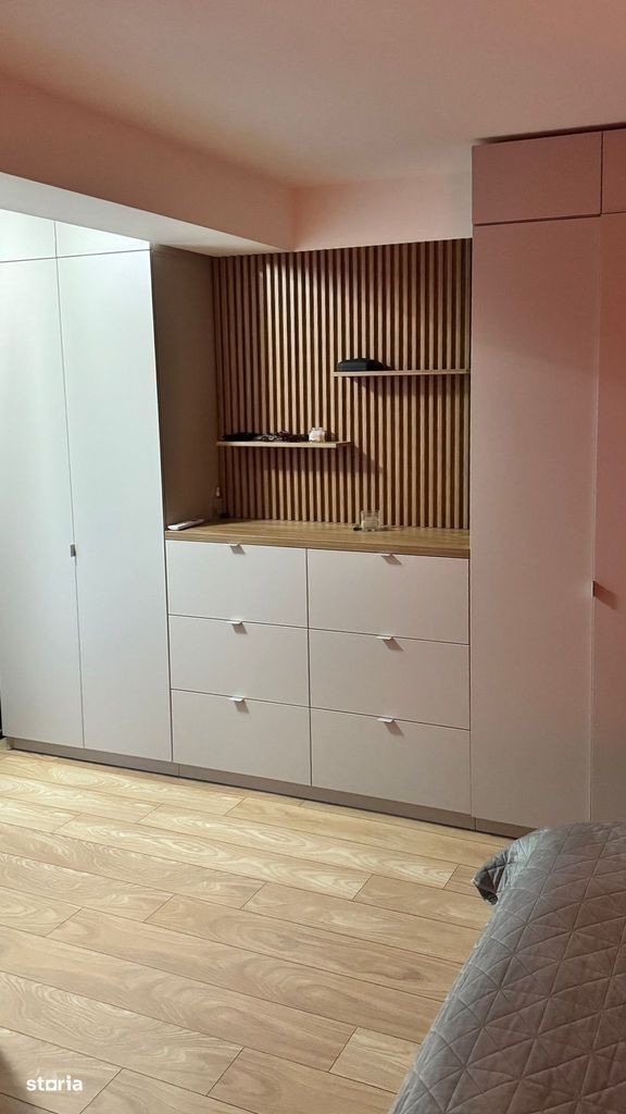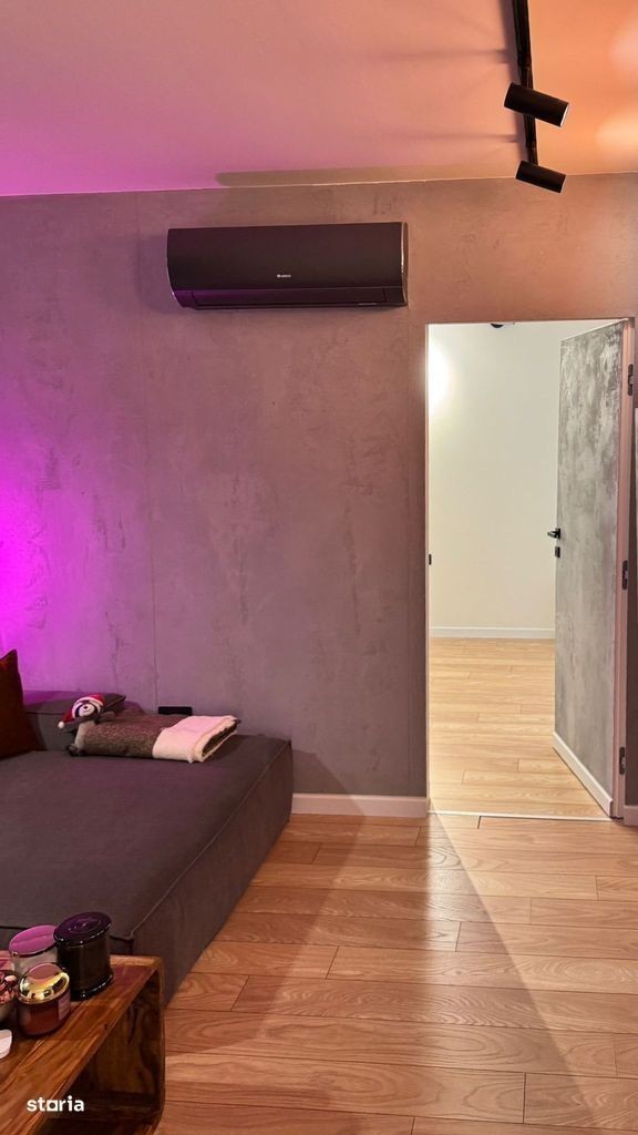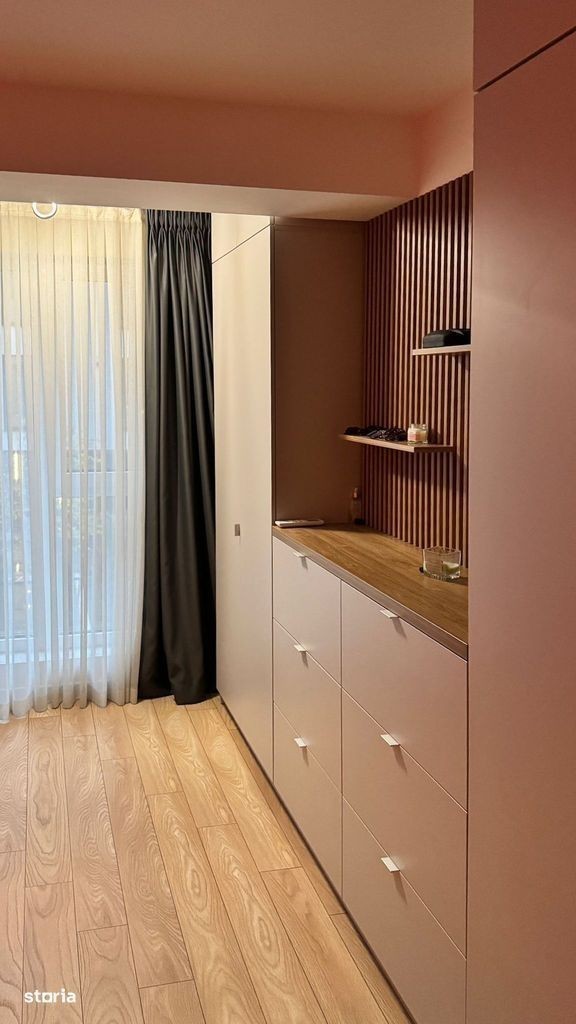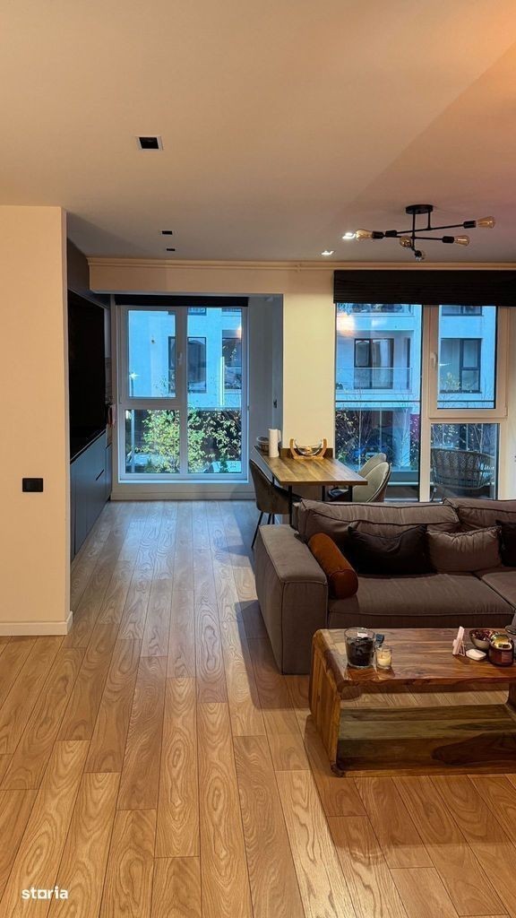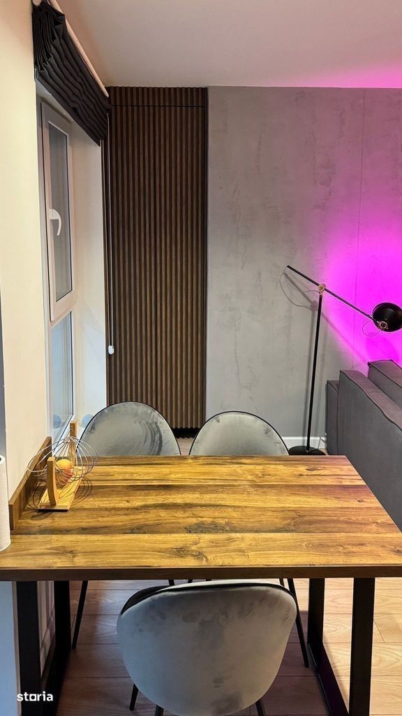 Va propunem spre închiriere un apartament de 3 camere cu design modern-industrial, luminos și atent amenajat, cu o suprafață totală de 92 mp (82 mp utili interior + 10 mp terasă). Apartamentul se află la a doua închiriere și se prezintă într-o stare excelentă, aproape ca nou. Locuința este complet mobilată și utilată, cu mobilier și electrocasnice în stare foarte bună, fiind pregătită pentru mutare imediată. Living spațios și elegant Livingul este amenajat cu perete din cărămidă aparentă, lumină ambientală caldă și o canapea generoasă. Spațiul include o zonă de relaxare modernă, o masă de cafea din lemn masiv și televizor montat pe perete. Finisajele tip beton aparent și corpurile de iluminat de tip loft completează un stil urban și confortabil. Bucătărie modernă, complet utilată Bucătăria beneficiază de mobilier premium în nuanțe de antracit și texturi de lemn, blat și backsplash tip piatră, precum și electrocasnice incorporate: plită, cuptor, mașină de spălat vase, hotă și espressor. Zona de dining are deschidere către terasă, oferind multă lumină naturală. Dormitor matrimonial Dormitorul principal dispune de pat matrimonial confortabil, iluminare ambientală caldă și spații de depozitare. Atmosfera este calmă și foarte potrivită pentru odihnă. Cameră secundară - ideală pentru birou sau dormitor A doua cameră este amenajată cu birou modern, iluminare dedicată și o canapea extensibilă. Poate fi folosită ca birou pentru work-from-home, cameră de oaspeți sau cameră multifuncțională. Două băi moderne Prima baie este dotată cu cadă și finisaje elegante tip marmură verde. A doua baie are duș walk-in, placaje tip lemn și obiecte sanitare moderne. Spațiu tehnic separat Apartamentul dispune de un spațiu dedicat pentru mașina de spălat și uscător, ambele marca Samsung. Terasă de 10 mp Accesul la terasă se face din zona de dining. Spațiul este aerisit, perfect pentru relaxare. Parcare subterană inclusă în preț Detalii tehnice Centrală de bloc cu contorizare individuală Încălzire în pardoseală Mobilier și electrocasnice în stare excelentă A doua închiriere, proprietate foarte bine întreținută