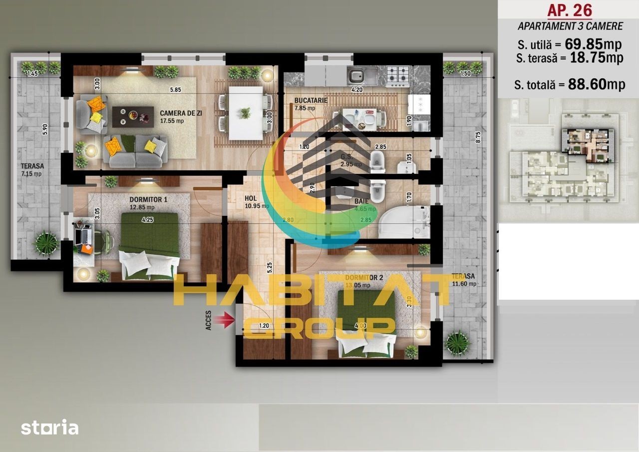 Habitat Group Estate va prezinta un apartament de 3 camere decomandat avand o suprafata totala utila de 88,6 mp la pretul promotional de 181.500 Eur TVA inclus. Apartamentul este FINALIZAT CU ACTE GATA DE MUTARE. Apartamentul situat la etajul 4 din 4 al unui bloc gen BOUTIQUE avand o compartimentare ideala pentru familia dumneavoastra, suprafata utila de 69,85 mp plus o terasa superba de de 18,75 mp. Compartimentarea ideala pentru familia dumneavoastra: - Living 17,55 mp - Dormitor 12,85 mp - Dormitor matrimonial 13,05 mp - Bucatarie 7,85 mp - Hol 10,95 mp - Baie 4,65 mp - Grup sanitar 2,95 - Terasa 18,75 mp Apartamentul este echipat si utilat cu gresie, faianta, parchet, usi interior si cea de exterior securizata, centrala proprie in condensatie de 24 kw + incalzire in pardoseala, baile echipate si utilate. Apartamentul se preda la cheie si este bransat la toate utilitatile apa/canalizare, gaze naturale si curent electric. Amplasat la doar 15 minute de statia de metrou Nicolae Grigorescu, in apropriere de supermarket Auchan Titan, Lidl, Profi, gradinite, scoli, farmacii, spitale, spatii verzi si de agrement, dar si Parcul IOR, confera confortul mult dorit pentru familia dumneavoastra. Separat se poate achizitiona loc de parcare subteran la pretul de 12.000 Eur fara TVA. Oferim asistenta gratuita in vederea intocmirii dosarului de creditare. Comision 0%. Poze reale in apartamentul de prezentare din acest bloc Locatie birou vanzari dezvoltator : strada Postasului nr.29, Sector 3 Waze: Habitat Group Estate Program vizionari: Luni - Vineri : 10:00 - 18:00 si Sambata : 10:00 - 14:00 Recomand vizionare Bogdan Mavrogheorghe