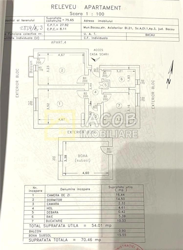 Apartament 2 camere decomandate - Zona Aviatori (serviciul pasapoarte), Bacau Va propunem spre achizitie un apartament situat intr-o zonă linistita si accesibila din cartierul Aviatori, ideal atât pentru locuinta, cat si pentru investitie. Caracteristici locuinta: 2 camere spatioase, bine luminate Izolatie exterioara - confort termic si costuri reduse de intretinere Centrala termica proprie Geamuri termopan si rulouri exterioare Compartimentare practica Depozitare suplimentara: Proprietatea beneficiaza de o boxa foarte generoasa, de 15.55 mp, perfecta pentru depozitare sau organizare eficienta. Avantaje: Costuri mici de intretinere datorita izolatiei si centralei termice Apartament cu posibilitatea de personalizare Boxa mare inclusa in pret Acces rapid la transport, magazine, scoala si alte facilitati Pentru detalii si vizionare: Sandu Iacob -