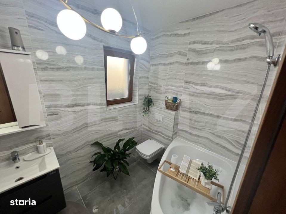 Blitz propune spre vanzare un apartament modern cu 2 camere, situat într-un bloc nou din zona centrală, aproape de toate punctele de interes ale orașului. Proprietatea se remarcă prin finisaje premium și un design contemporan, fiind complet mobilată și utilată la standarde înalte, gata pentru mutare imediată. Caracteristici principale: • Living luminos, amenajat cu mobilier modern și acces la balcon; • Dormitor spațios, cu pat matrimonial și multiple spații de depozitare; • Bucătărie complet utilată (plita, cuptor, frigider, mașină de spălat, hotă etc.); • Baie elegantă, cu cada și obiecte sanitare de calitate; • Aer condiționat, centrală proprie, termopan, video-interfon; • Mobilier și electrocasnice în stare excelentă, alese cu atenție pentru confort maxim. Avantaje: Bloc nou, locație ultracentrală, acces rapid la mijloace de transport, magazine, restaurante, parcuri și instituții. Ideal pentru persoane active, cu stil de viață urban, sau pentru cupluri.