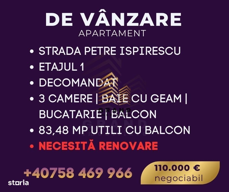APARTAMENT 3 CAMERE | PETRE ISPIRESCU | ETAJ 1 | | NECESITA RENOVARE