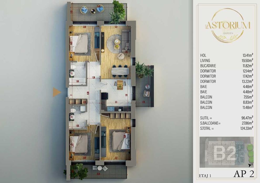 Prinde oferta de sezon în Astorium Garden: parcare cadou la orice apartament, pentru contractele semnate până la finalul anului. Vezi mai multe unități disponibile direct pe site astorium.ro. Pretul nu include TVA. Apartamentul are o suprafață de 96,47 mp utili și este dotat cu finisaje premium: Încălzire în pardoseală Geam Tripan Izolație fonică în apartament cu vată bazaltică Compartimentare cu zidărie Izolație exterioară cu vată minerală de 15 cm Băi complet echipate cu obiecte sanitare GEBERIT Astorium Garden este un ansamblu rezidențial care pune accent pe echilibrul între viața urbană și liniștea naturii. Cu un grad de ocupare a terenului de doar 30%, complexul oferă spații verzi generoase, grădini private pentru apartamentele de la parter, pistă de alergare și piscină destinată exclusiv rezidenților. Apartamentele sunt luminoase, spațioase și compartimentate inteligent, cu finisaje de calitate superioară, menite să ofere confort și funcționalitate. Ansamblul a fost gândit pentru cei care își doresc o locuință modernă, elegantă și aproape de natură, dar totodată conectată la facilitățile urbane. Fiecare detaliu, de la arhitectura clădirilor până la infrastructura pentru smart home, contribuie la o experiență de locuire completă și plăcută. Vizionările și achiziția se fac direct la dezvoltator: 07********05