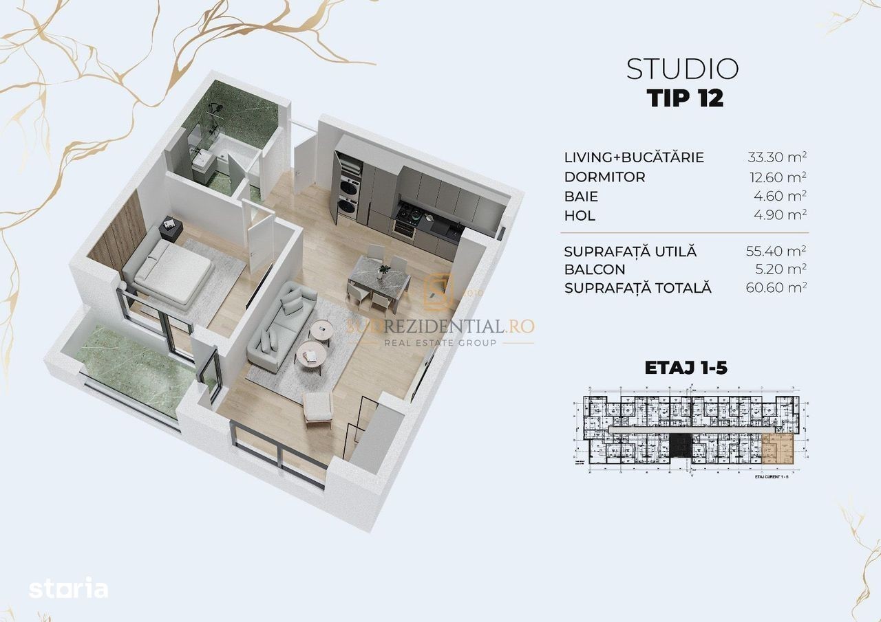 Un apartament spatios si bine compartimentat, ideal pentru familii sau cupluri care isi doresc mai mult confort si o terasa generoasa, situat la etajul 2 al unui imobil modern cu regim de inaltime P+2Er+3Er, in cadrul ansamblului AGV Residence - Popesti-Leordeni. Locuinta are o suprafata utila de 54.50 mp, la care se adauga o terasa de 12.50 mp, perfecta pentru momente de relaxare sau amenajare ca spatiu verde. Compartimentare eficienta: - Hol + spatiu de depozitare - 6.35 mp - Baie - 5.25 mp - Bucatarie inchisa - 7.45 mp - Zona de zi + loc de luat masa - 22.85 mp - Dormitor - 12.60 mp Dotari si finisaje: - Tamplarie PVC cu geam termopan - Centrala proprie de apartament - Incalzire in pardoseala - Instalatie pregatita pentru aer conditionat - Living luminos cu acces direct pe terasa Este o alegere excelenta pentru cei care apreciaza spatiul exterior si o compartimentare functionala intr-o zona in plina dezvoltare. Pret de lista: 94.000 Euro + TVA Pret pentru plata in sistem anticipat: 88.000 Euro + TVA