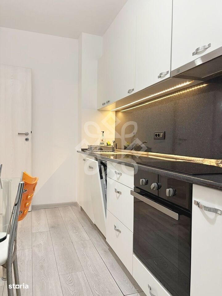 D'Art imob va ofera spre inchiriere un apartament nou cu 2 camere, situat pe strada Lapusului din Oradea. Acesta se afla la etajul 3/7 al unui bloc nou, izolat termic la exterior si dotat cu lift modern. Locuinta este decomandata si masoara o suprafata utila de 52 mp. Se compune din hol de acces, living spatios cu balcon deschis de 9 mp, dormitor, bucatarie complet utilata, baie cu cada. Apartamentul dispune de aer conditionat, mobilier modern si confortabil, spatii pentru depozitare generoase, incalzire de la reteaua de termoficare contorizata individual. Viitorii chiriasi vor beneficia de electrocasnice precum: TV, aer conditionat, plita+cuptor electrice, hota, aparat de cafea, cuptor cu microunde, combina frigorifica, masina de spalat vase, masina de spalat rufe, aspirator, fier de calcat, masa de calcat, uscator suport rufe, video interfon. La subsolul cladirii proprietarul pune la dispozitie un loc de parcare privat, inclus in pretul de inchiriere. In apropiere se afla centre comerciale, statii ale mijloacelor de transport in comun, zone verzi, zona centrala. Pretul pentru acest apartament nou cu 2 camere de inchiriat este de 470 euro. ~ D'Art imob offers you for rent a new 2-room apartment, located on Lapusului Street in Oradea. It is located on the 3rd/7th floor of a new block of flats, thermally insulated on the outside and equipped with a modern elevator. The home is detached and measures a usable area of 52 sqm. It consists of an entrance hall, spacious living room with an open balcony of 9 sq m, bedroom, fully equipped kitchen, bathroom with bathtub. The apartment has air conditioning, modern and comfortable furniture, generous storage spaces, heating from the district heating network individually metered. Future tenants will benefit from appliances such as: TV, air conditioning, electric hob + oven, hood, coffee maker, microwave oven, refrigerator, dishwasher, washing machine, vacuum cleaner, iron, ironing board, clothes dryer, video intercom. In the basement of the building the owner provides a private parking space, included in the rental price. Nearby there are shopping centers, public transport stations, green areas, the central area. The price for this new 2-room apartment for rent is 470 euros.