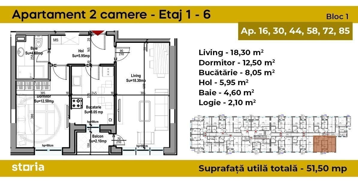 Apartament 2 camere - 55 mp - bloc nou P+6 Vă propunem spre vânzare un apartament modern de 2 camere, cu o suprafață utilă de 55 mp, situat într-un imobil nou, cu regim de înălțime P+6.
