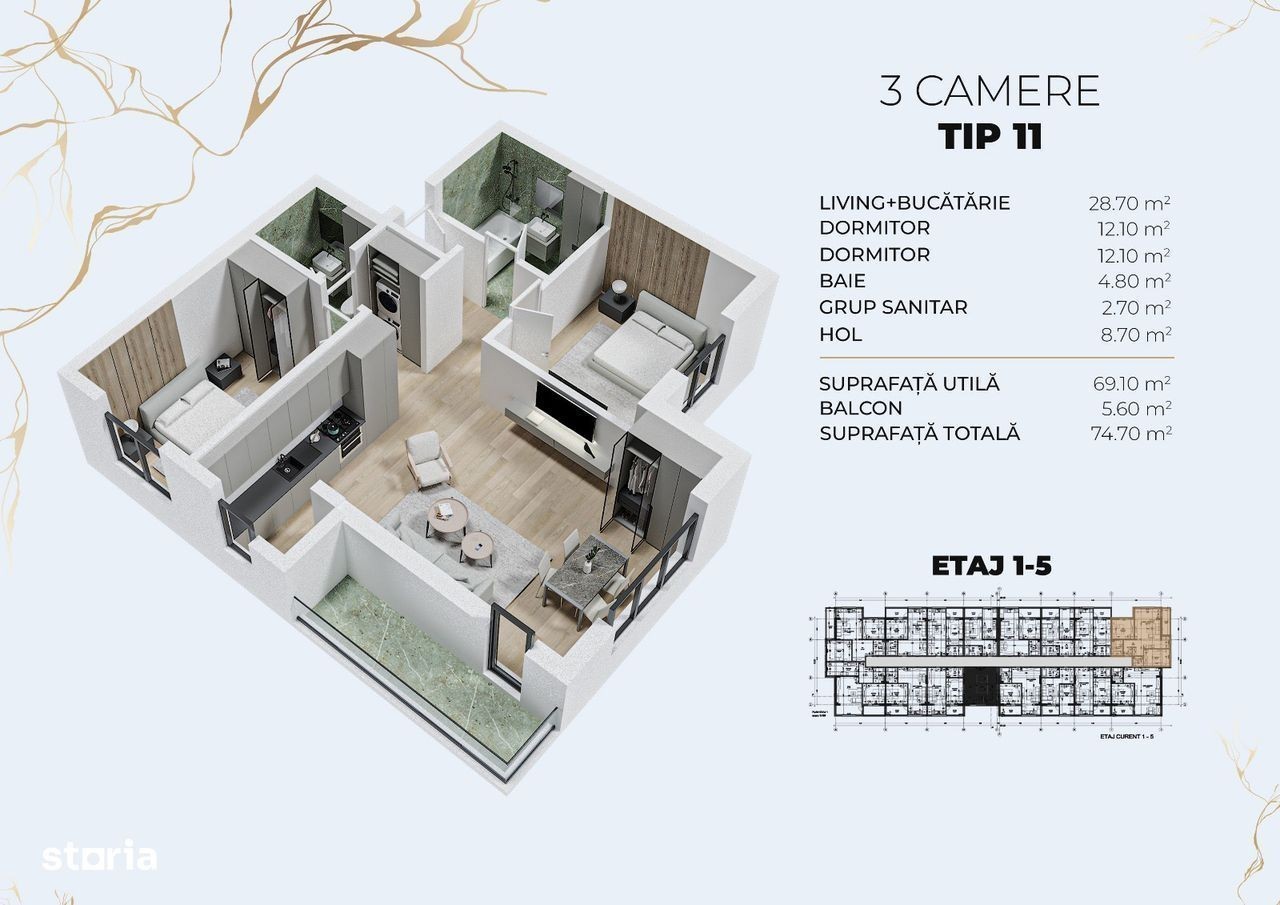 Apartamentul cu 3 camere, situat la etajul 1 al Blocului C1 din cadrul proiectului Sky Garden Residence, impresioneaza prin spatii generoase, compartimentare eficienta si finisaje moderne. Suprafata totala este de 73.30 mp, din care 66.10 mp utili si doua balcoane cu suprafete de 4.20 mp si 3.00 mp. Spatiul interior este bine optimizat si luminos, fiind compus din: - Living: 19.10 mp - Dormitor 1: 12.35 mp - Dormitor 2: 10.35 mp - Bucatarie separata: 7.70 mp - Baie: 4.55 mp - Grup sanitar: 2.90 mp - Hol + dressing: 9.15 mp Locuinta beneficiaza de incalzire prin pardoseala, centrala termica proprie, tamplarie PVC cu geam tripan 4 anotimpuri, balcoane inchise cu sticla securizata si fatade ventilate cu finisaje din Alucobond. Finisajele interioare sunt moderne si pot fi personalizate in functie de preferintele viitorului proprietar. Imobilul dispune de lift performant, videointerfon, spatii comune elegante si posibilitatea achizitionarii de locuri de parcare subterane si supraterane. Proiectul Sky Garden Residence - Faza a II-a, este amplasat pe Strada Popesti Vest, in Orasul Popesti-Leordeni, Ilfov, laga pasarela pietonala catre statia de metrou Berceni, intr-o zona cu infrastructura moderna - drumuri asfaltate, trotuare iluminate si acces facil catre centrul Capitalei. In imediata apropiere se regasesc: - Centre comerciale importante: Penny, Mega Image, Profi, Auchan, Mall La Strada - Unitati de invatamant, clinici, farmacii, banci - Zone verzi si de agrement: Parcul Copiilor (Drumul Fermei) si Parcul Tudor Arghezi (Bd. Metalurgiei) Ansamblul este dispus intr-o zona comerciala extinsa, cu promenada pietonala, hipermarket, magazine, farmacii, cafenele si gradinita privata, definind un adevarat concept modern dedicat confortului zilnic. In pretul afisat nu este inclusa cota de TVA.